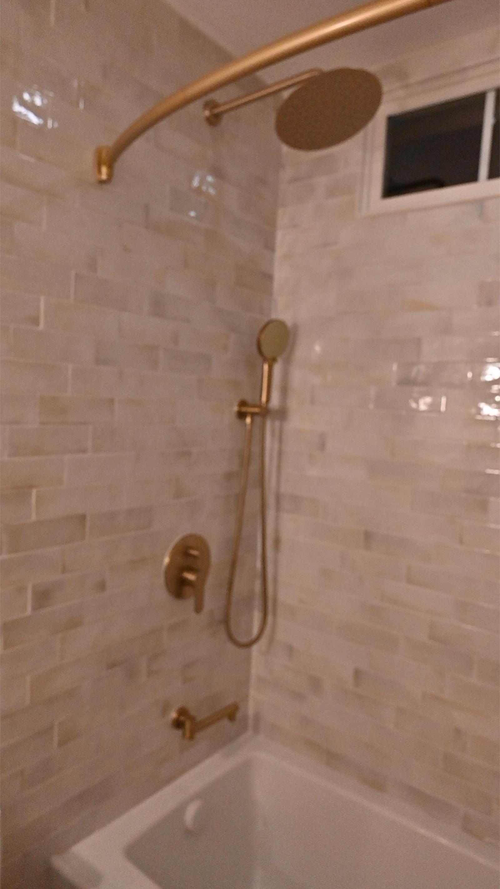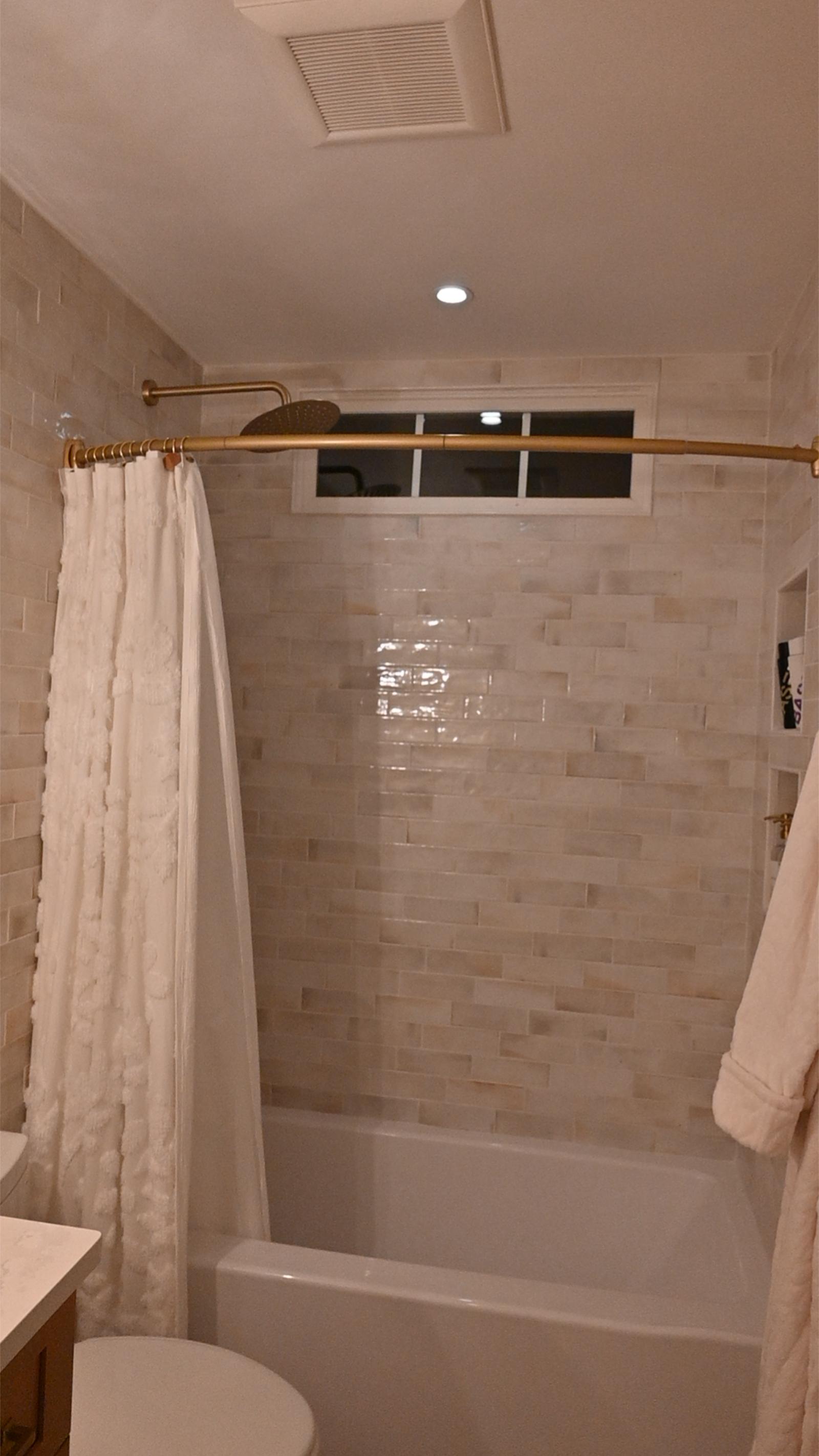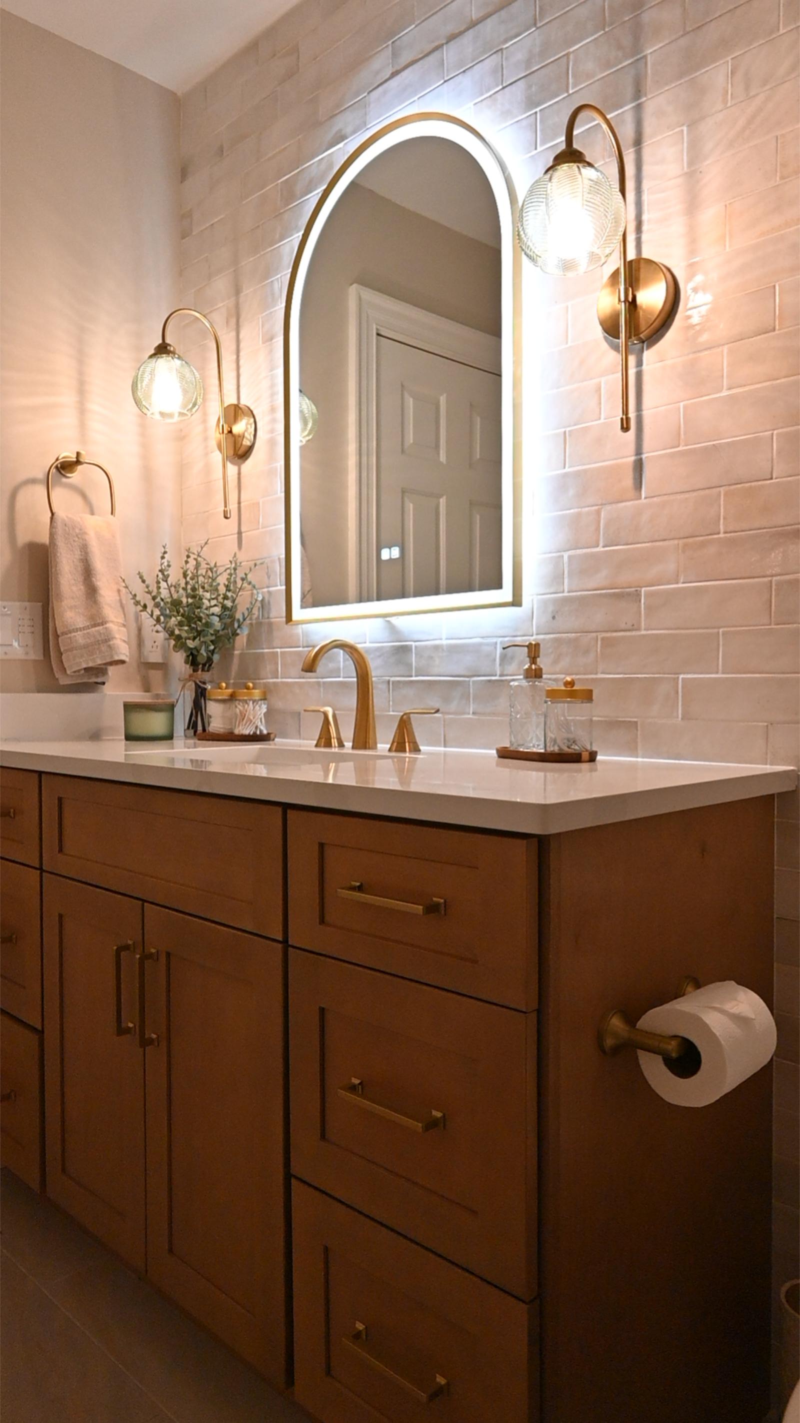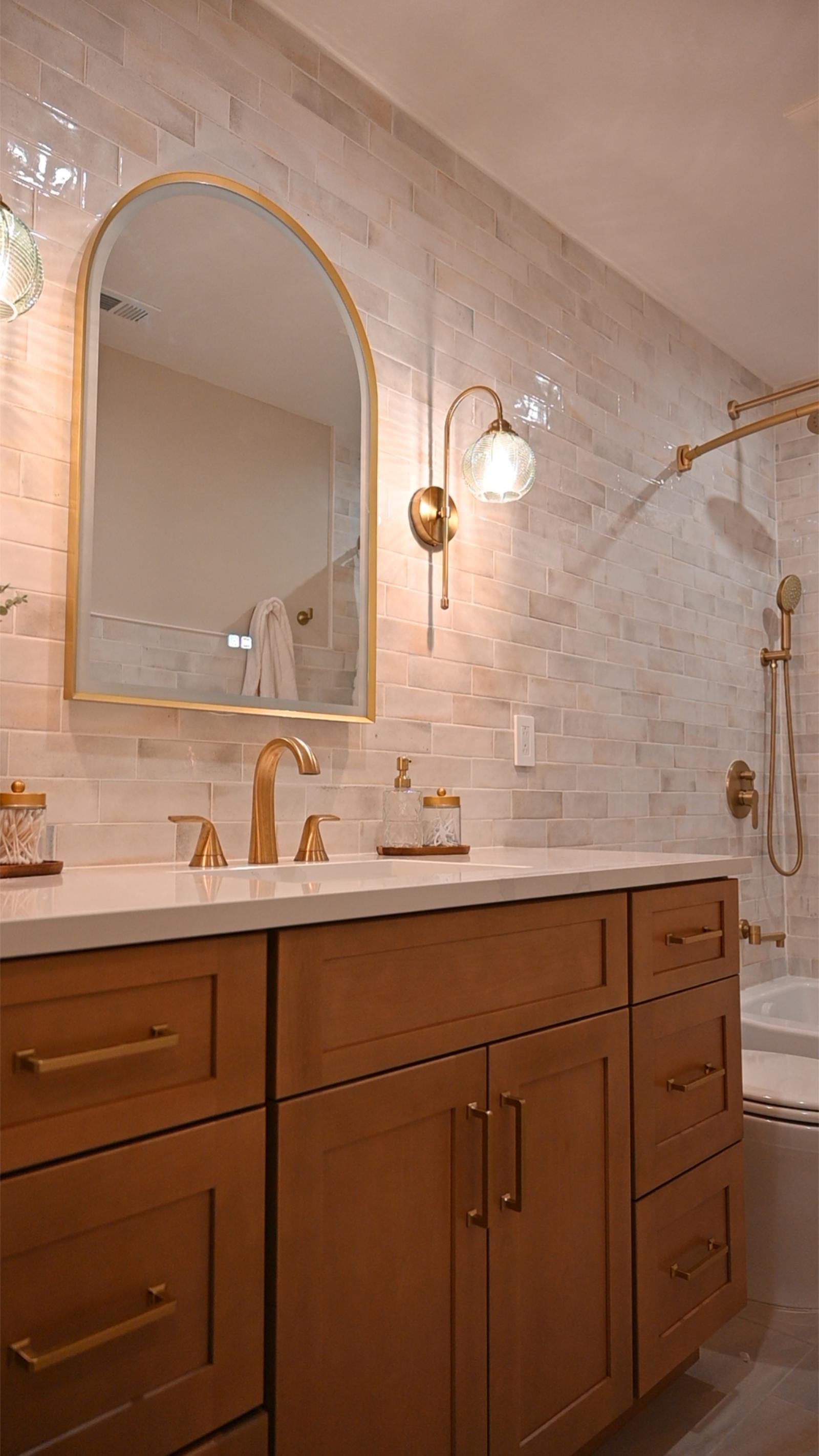 This bathroom was designed to feel like a private retreat. Custom wood cabinetry anchors the space, adding richness and contrast against the soft, neutral tilework.