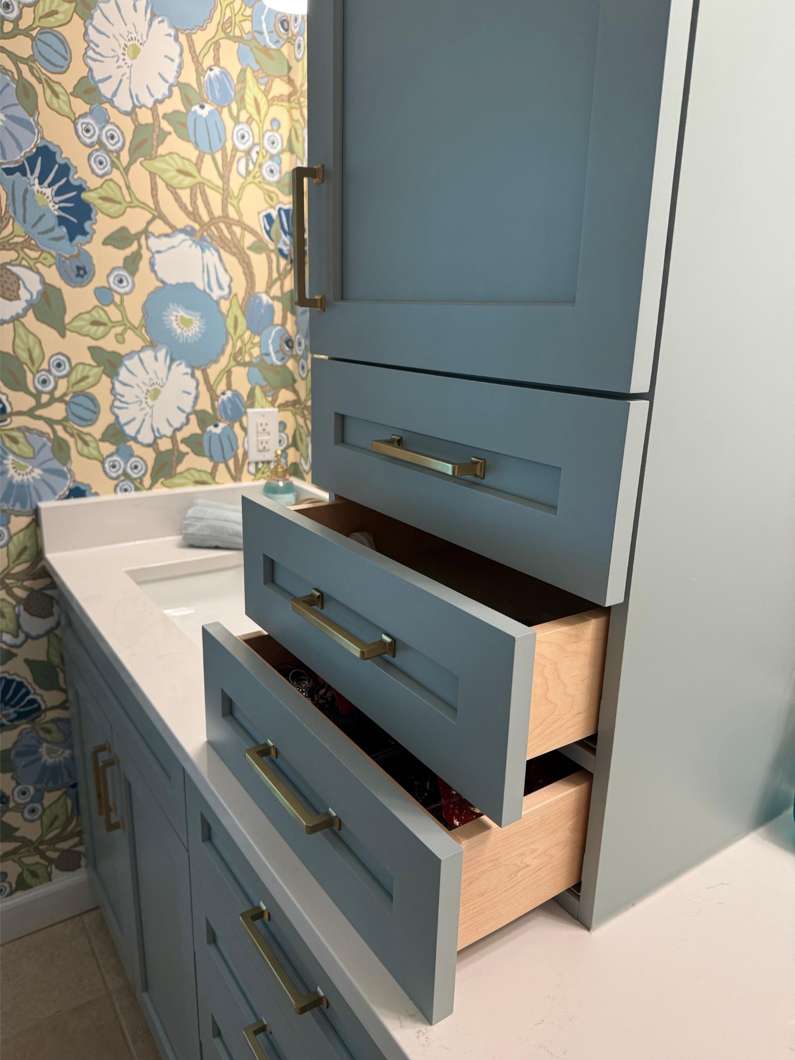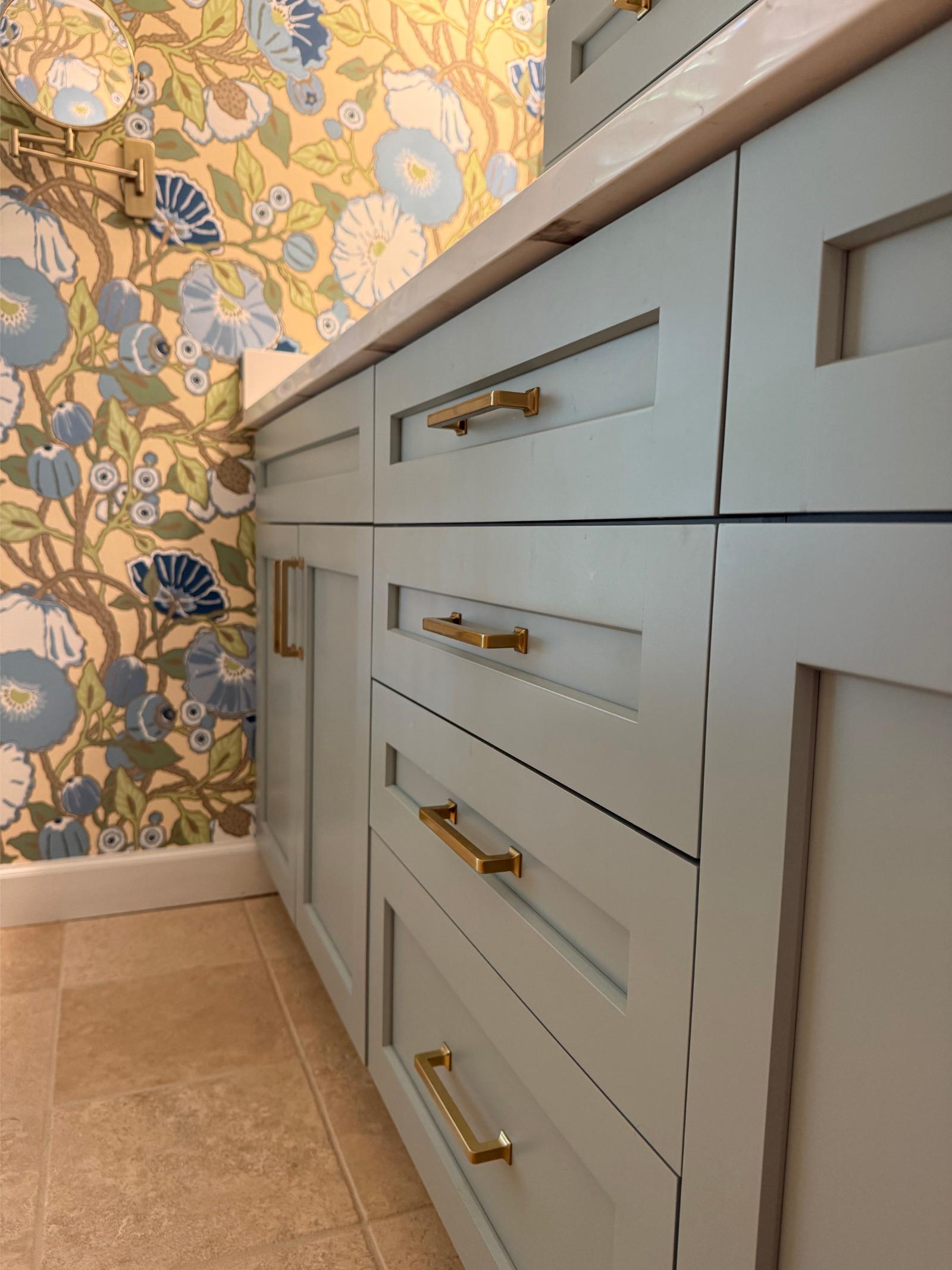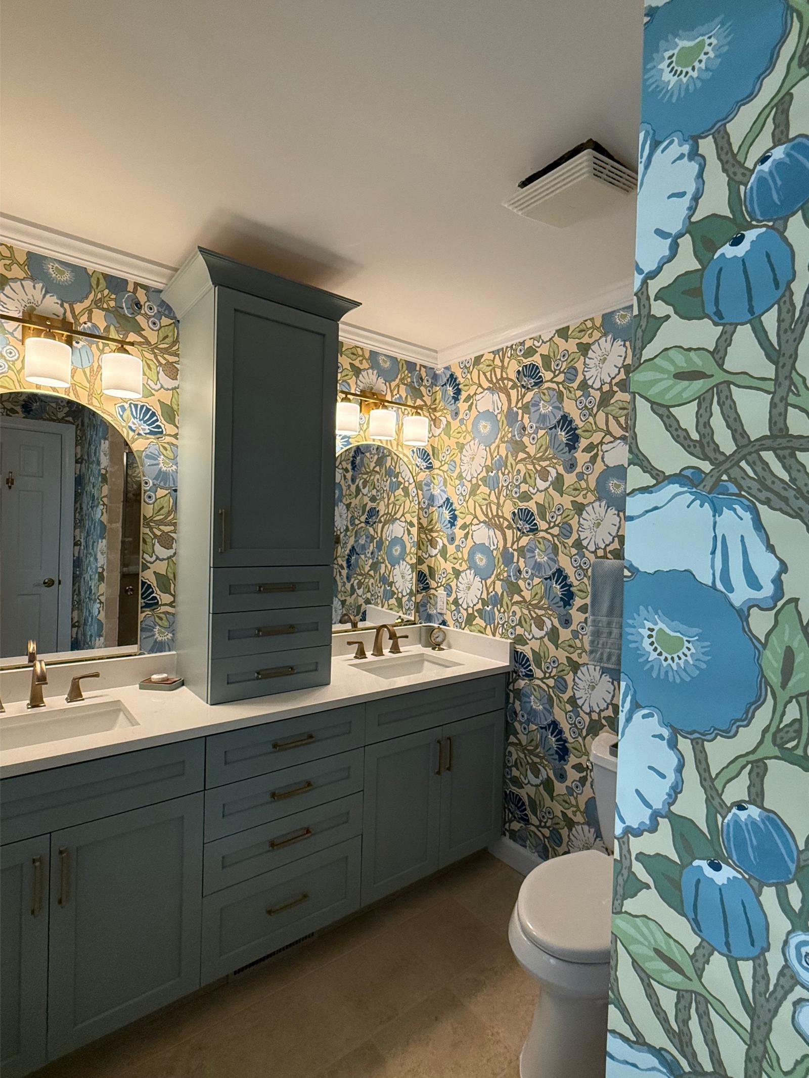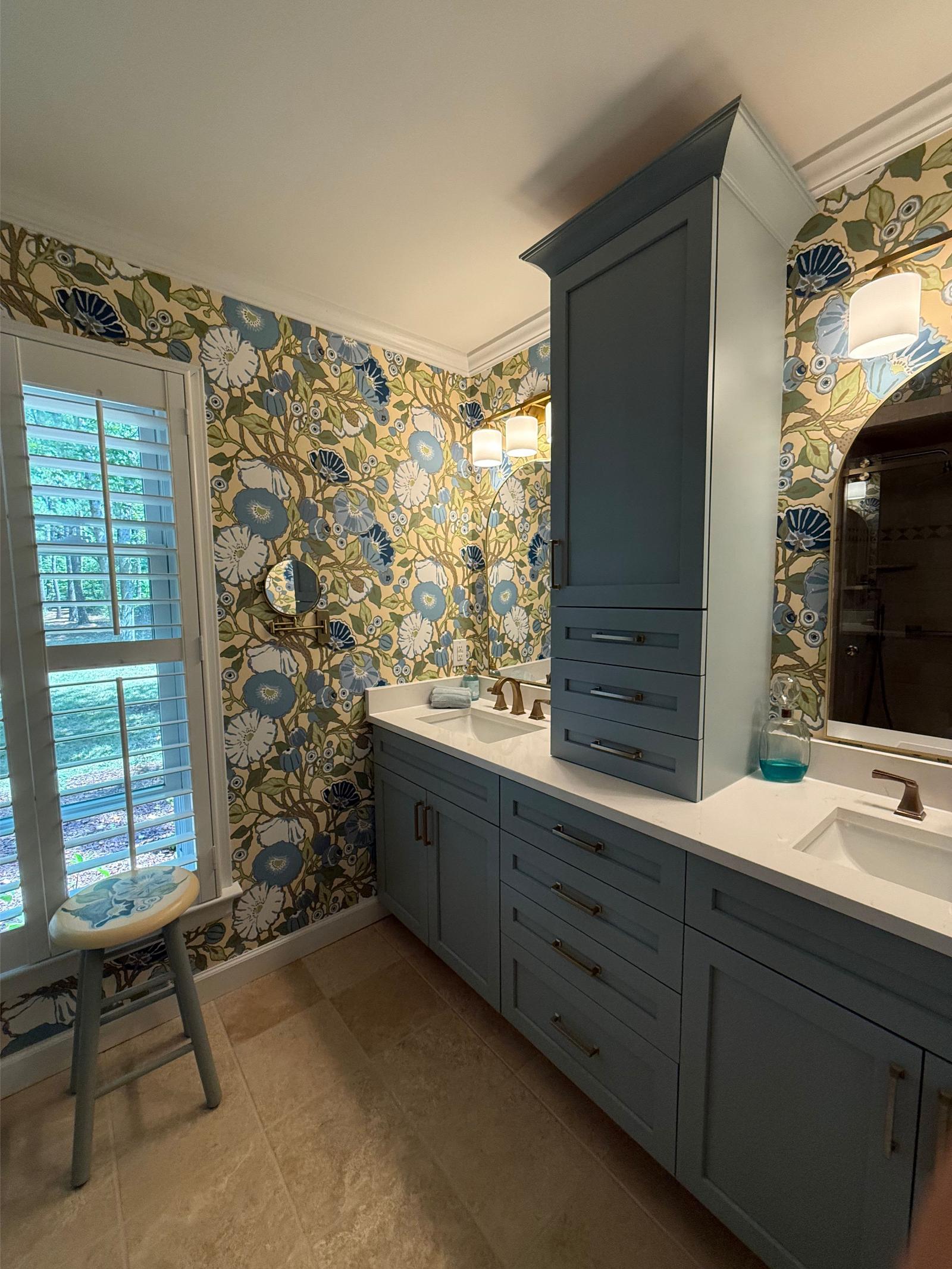 This master bathroom balances bold pattern with refined craftsmanship. Custom cabinetry in a muted blue anchors the space, paired with brass hardware and clean-lined countertops for a timeless feel.
