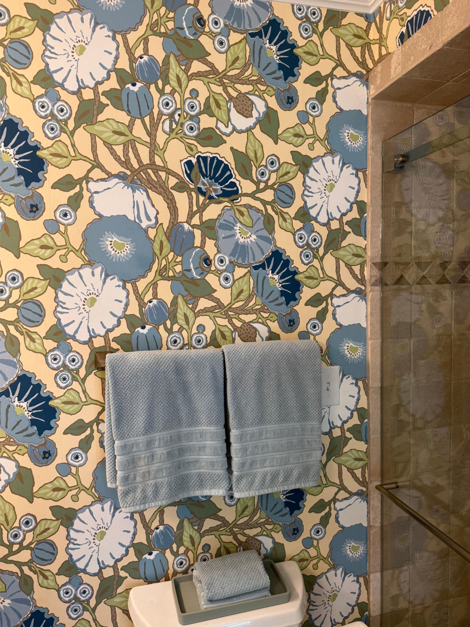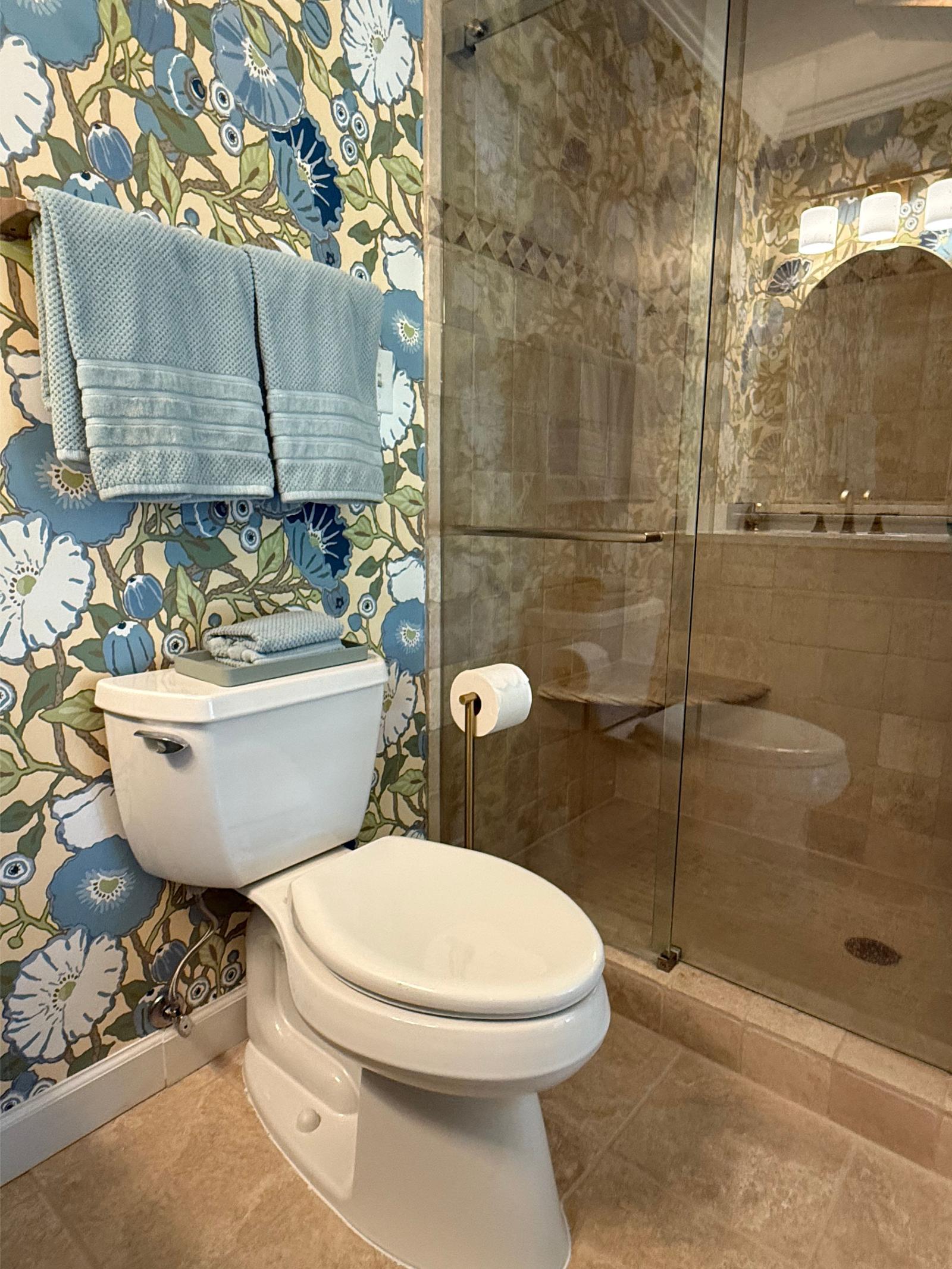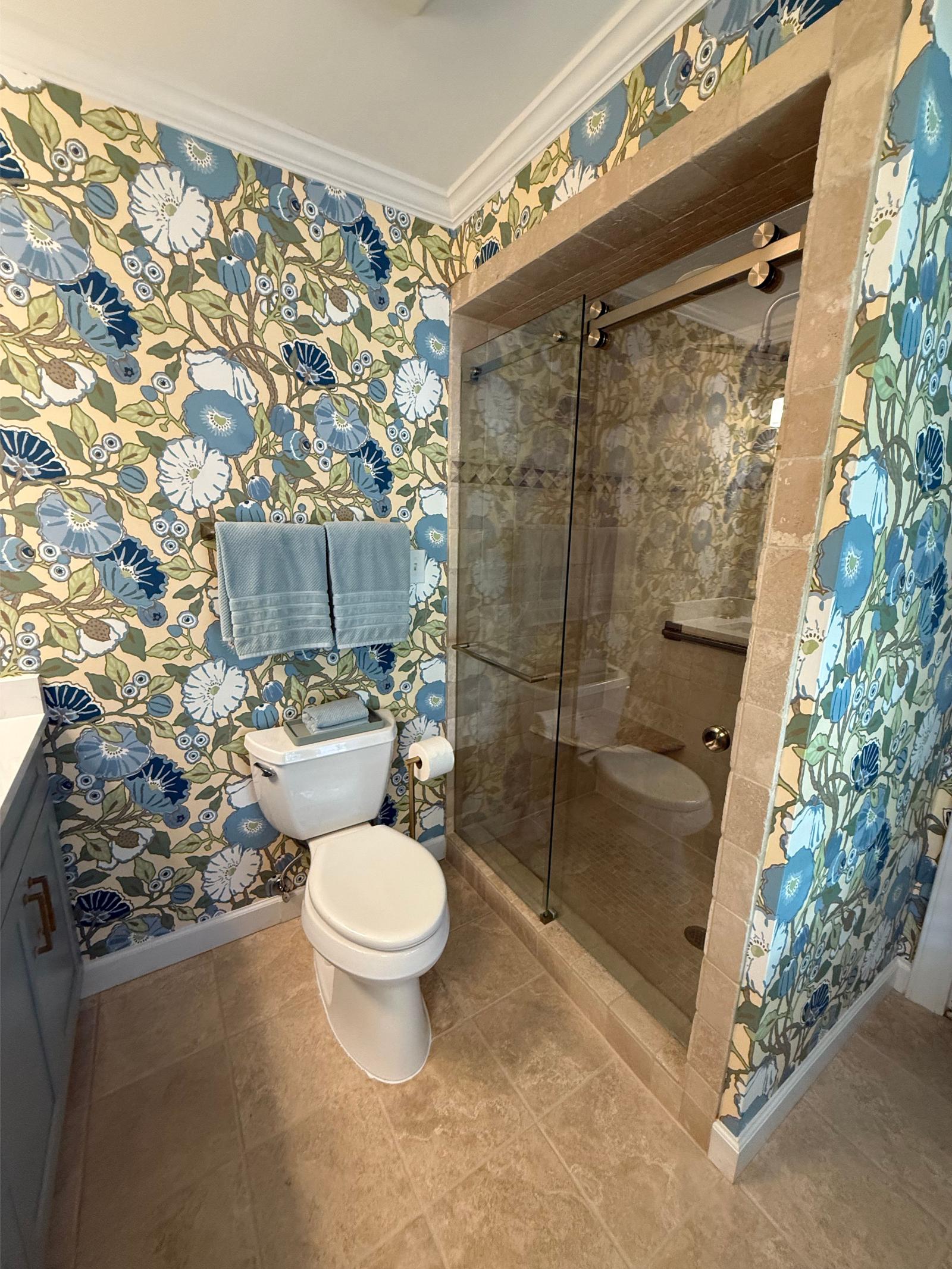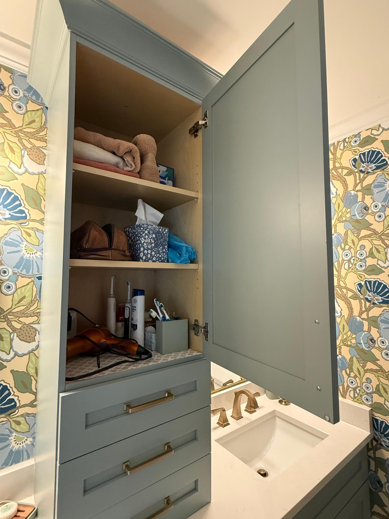 This master bathroom balances bold pattern with refined craftsmanship. Custom cabinetry in a muted blue anchors the space, paired with brass hardware and clean-lined countertops for a timeless feel.