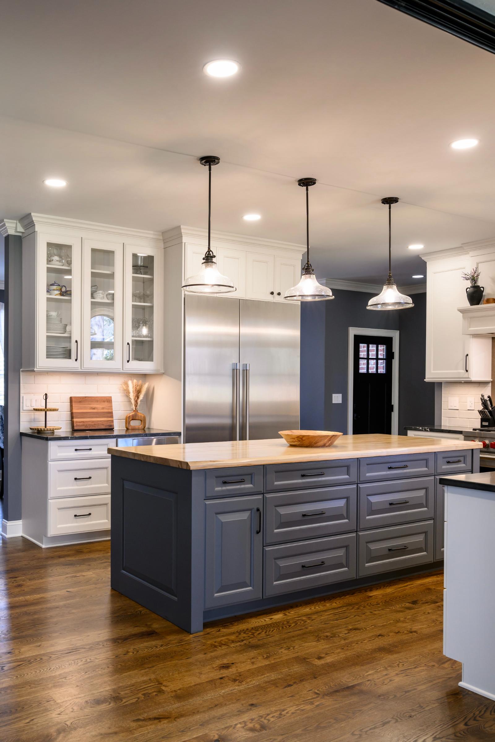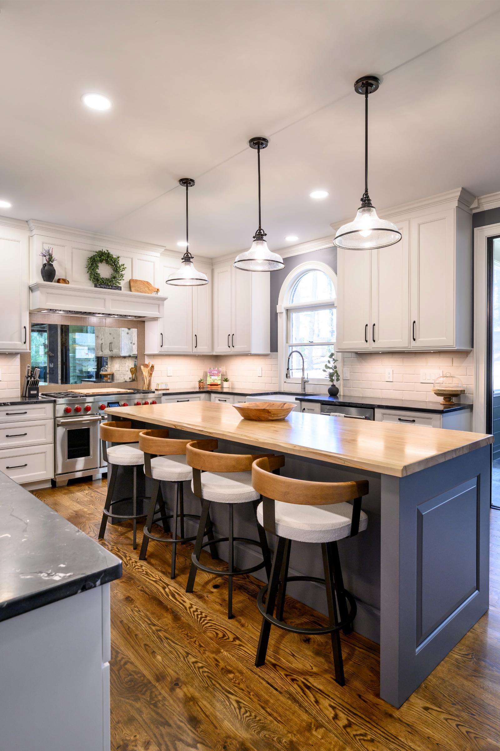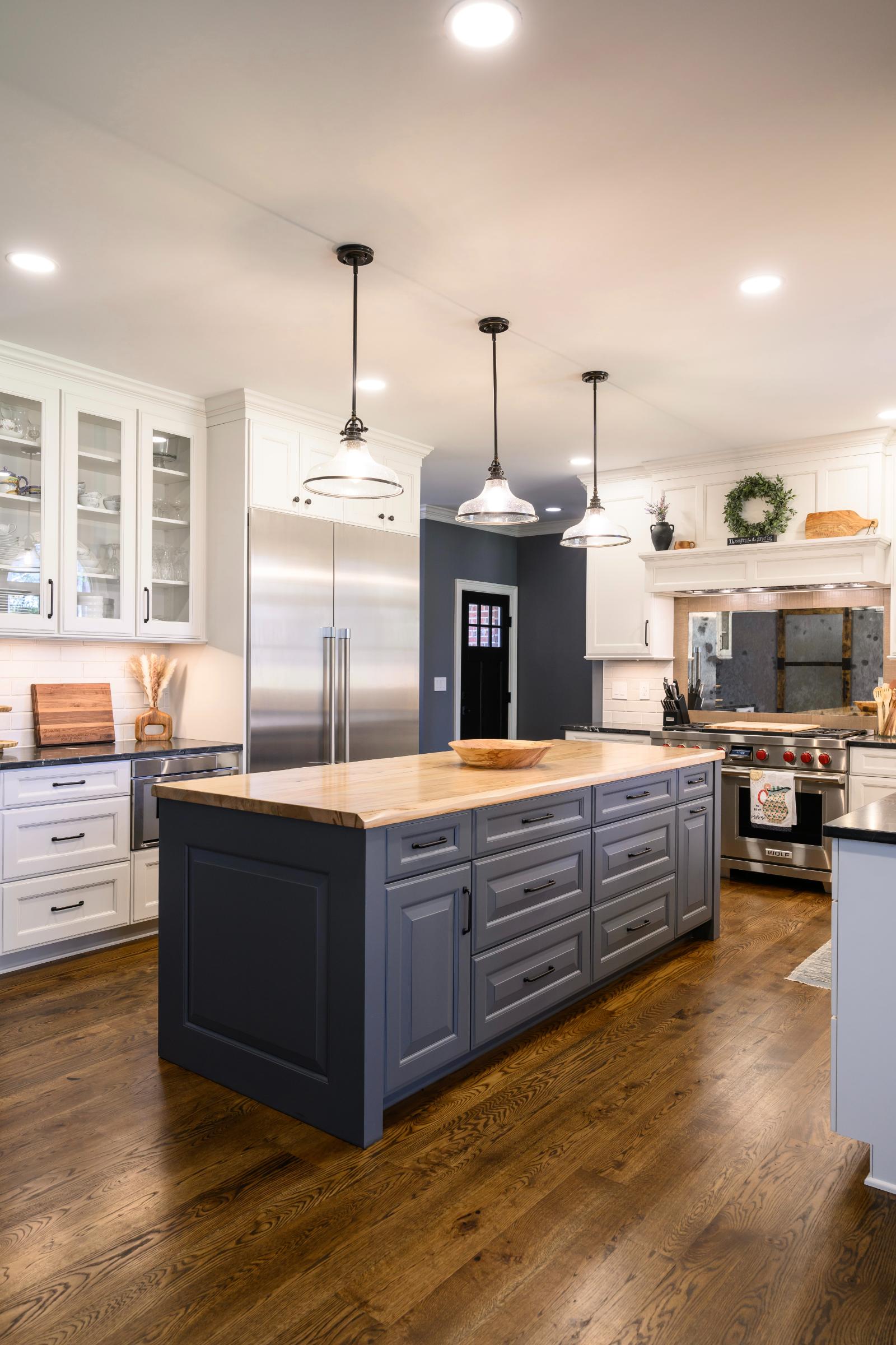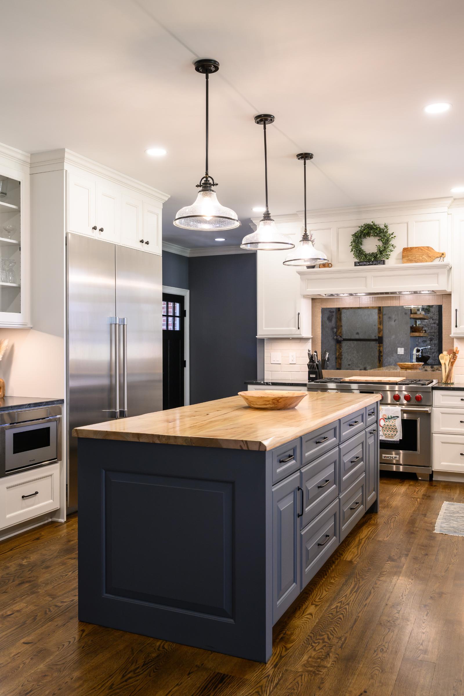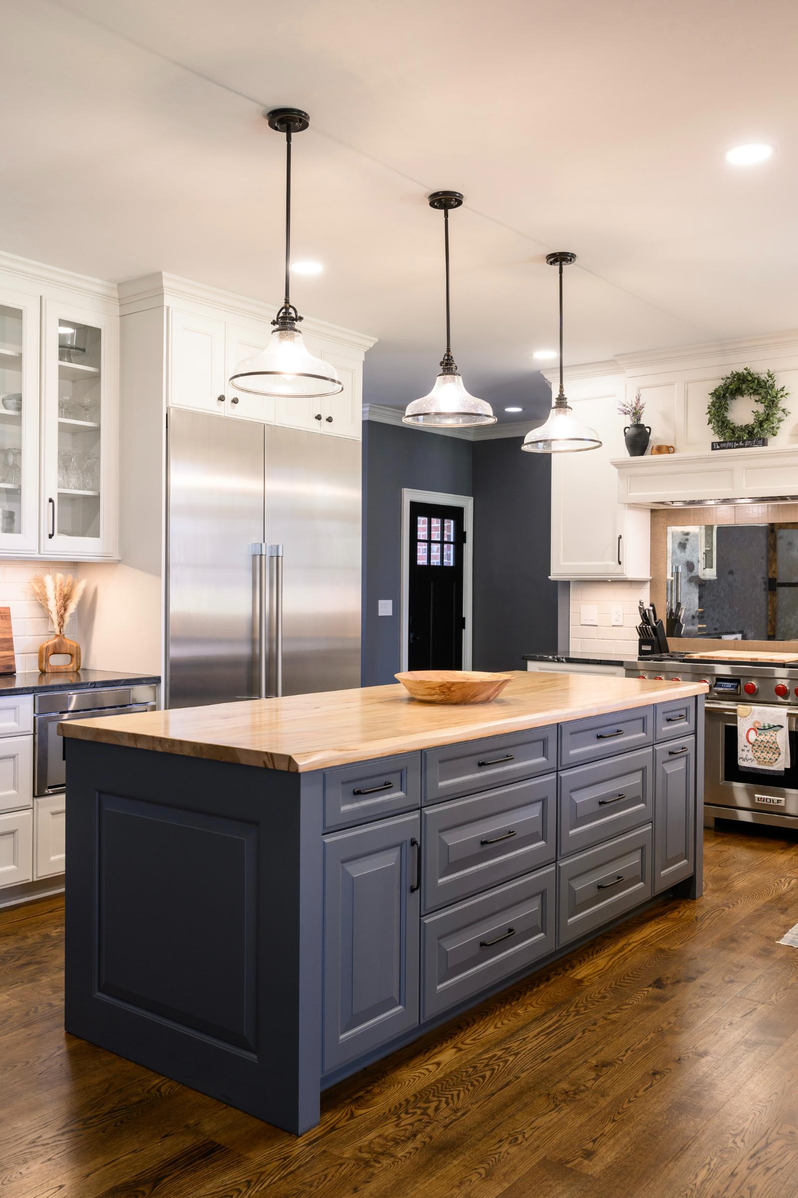 White perimeter cabinets meet a bold blue-gray island in this classic, character-filled kitchen. Warm wood tones, black hardware, and industrial-style pendant lights give the space a grounded, farmhouse feel that's both timeless and lived-in.