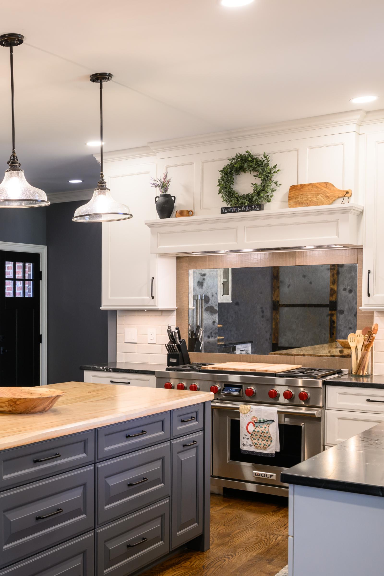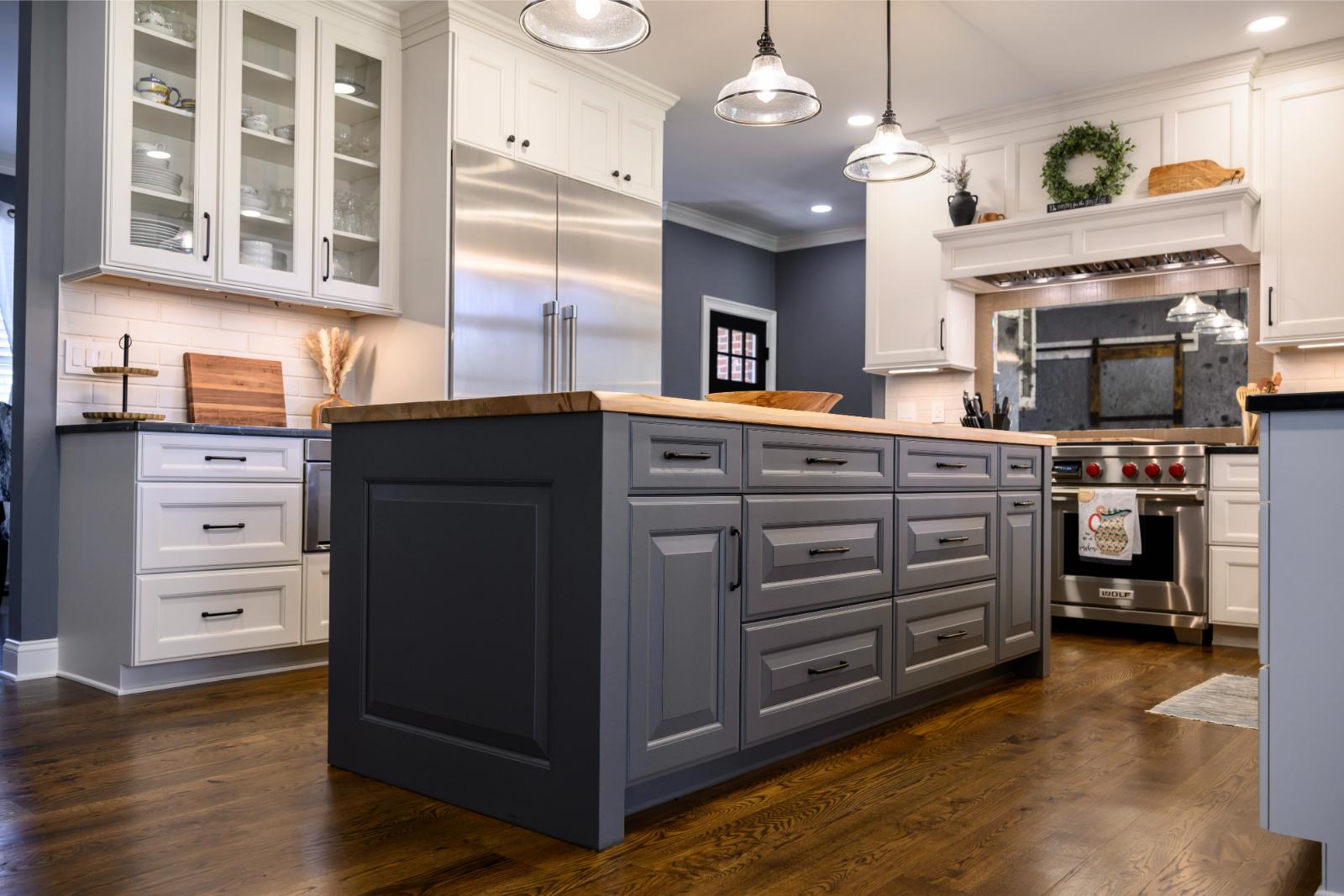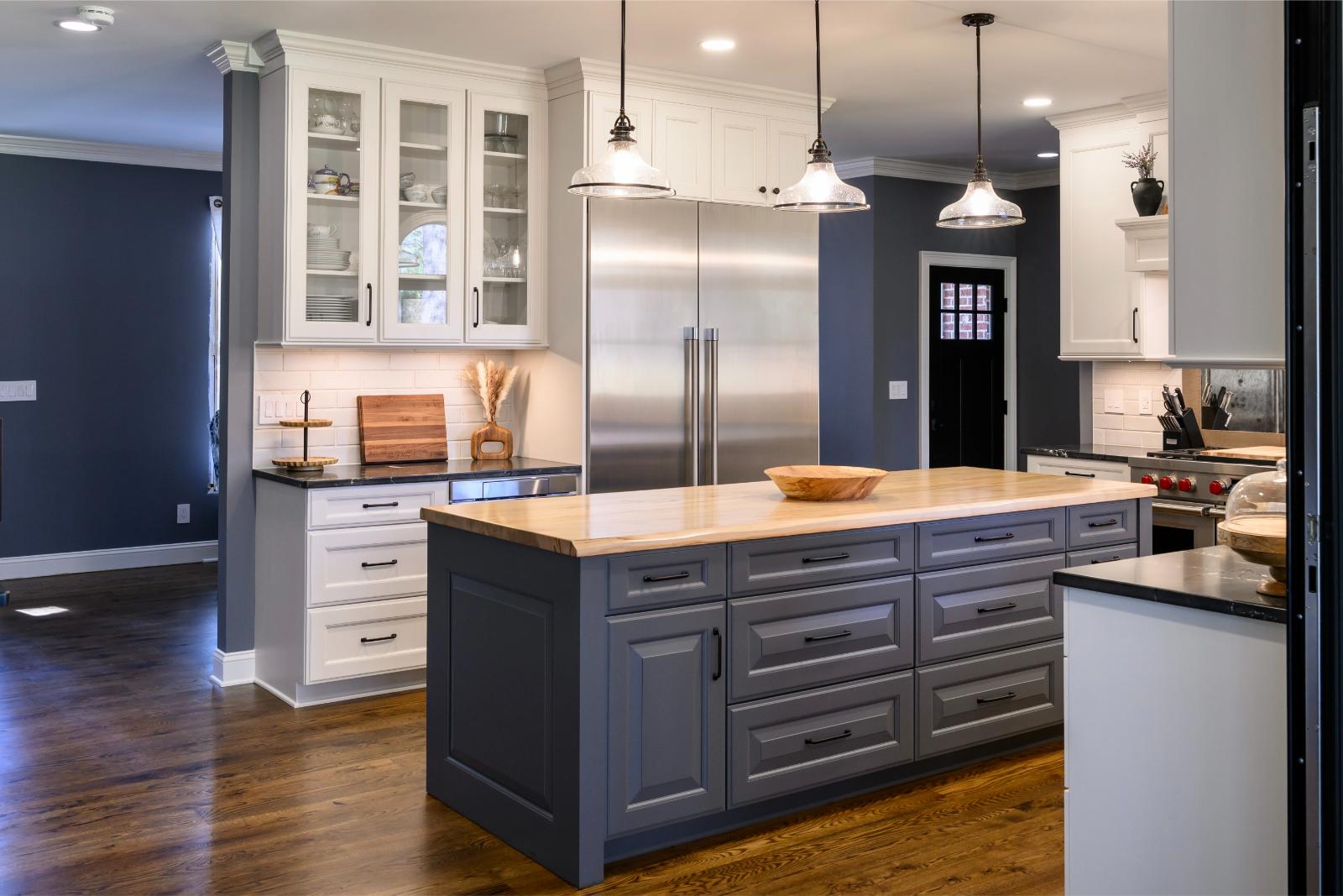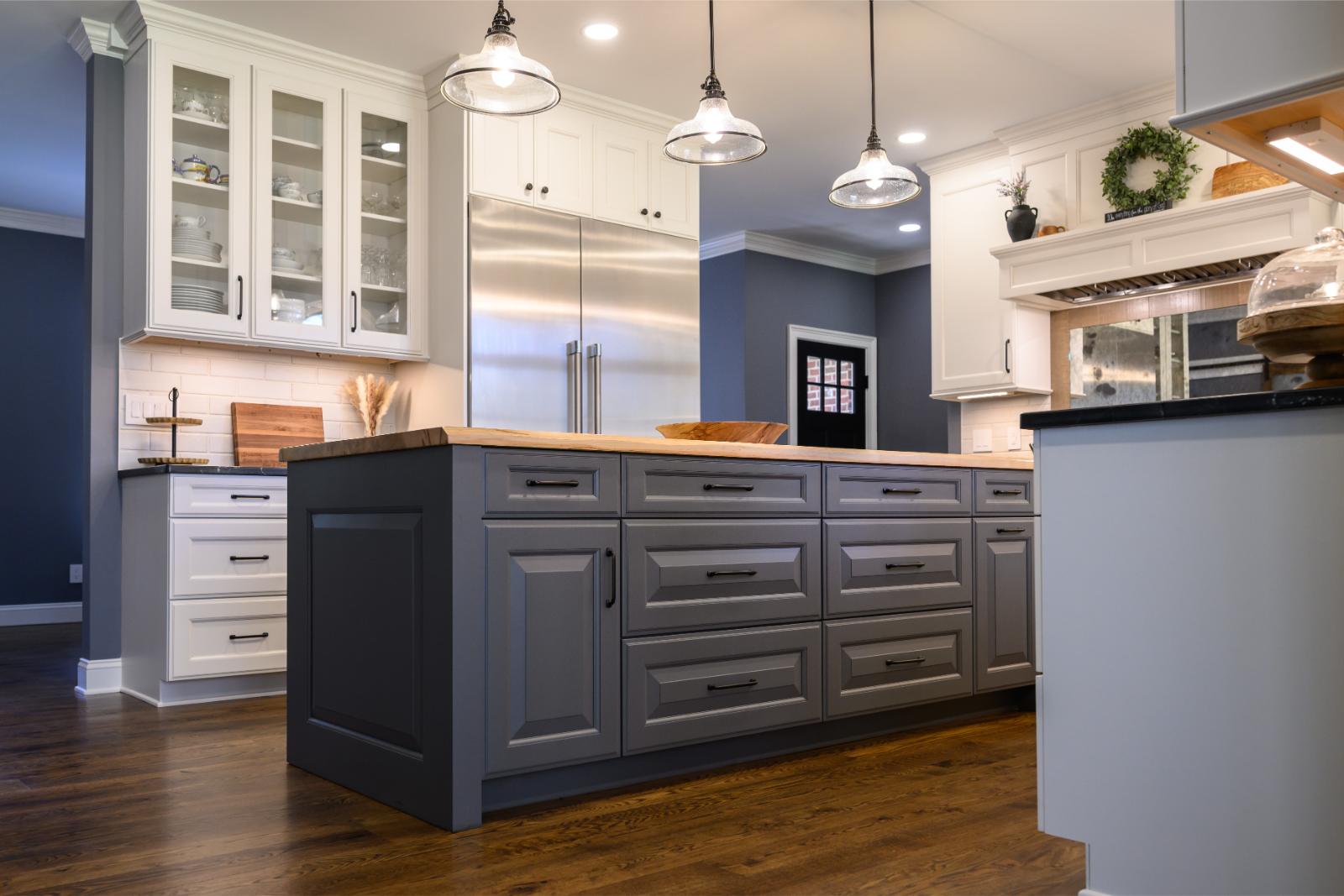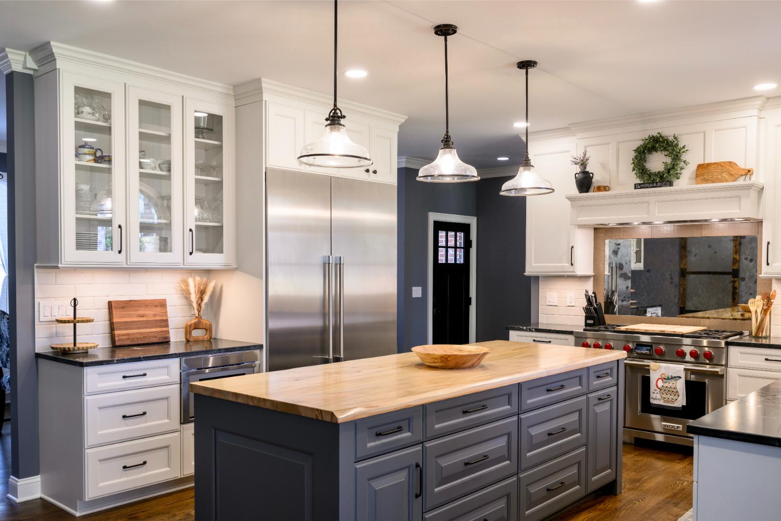 White perimeter cabinets meet a bold blue-gray island in this classic, character-filled kitchen. Warm wood tones, black hardware, and industrial-style pendant lights give the space a grounded, farmhouse feel that's both timeless and lived-in.