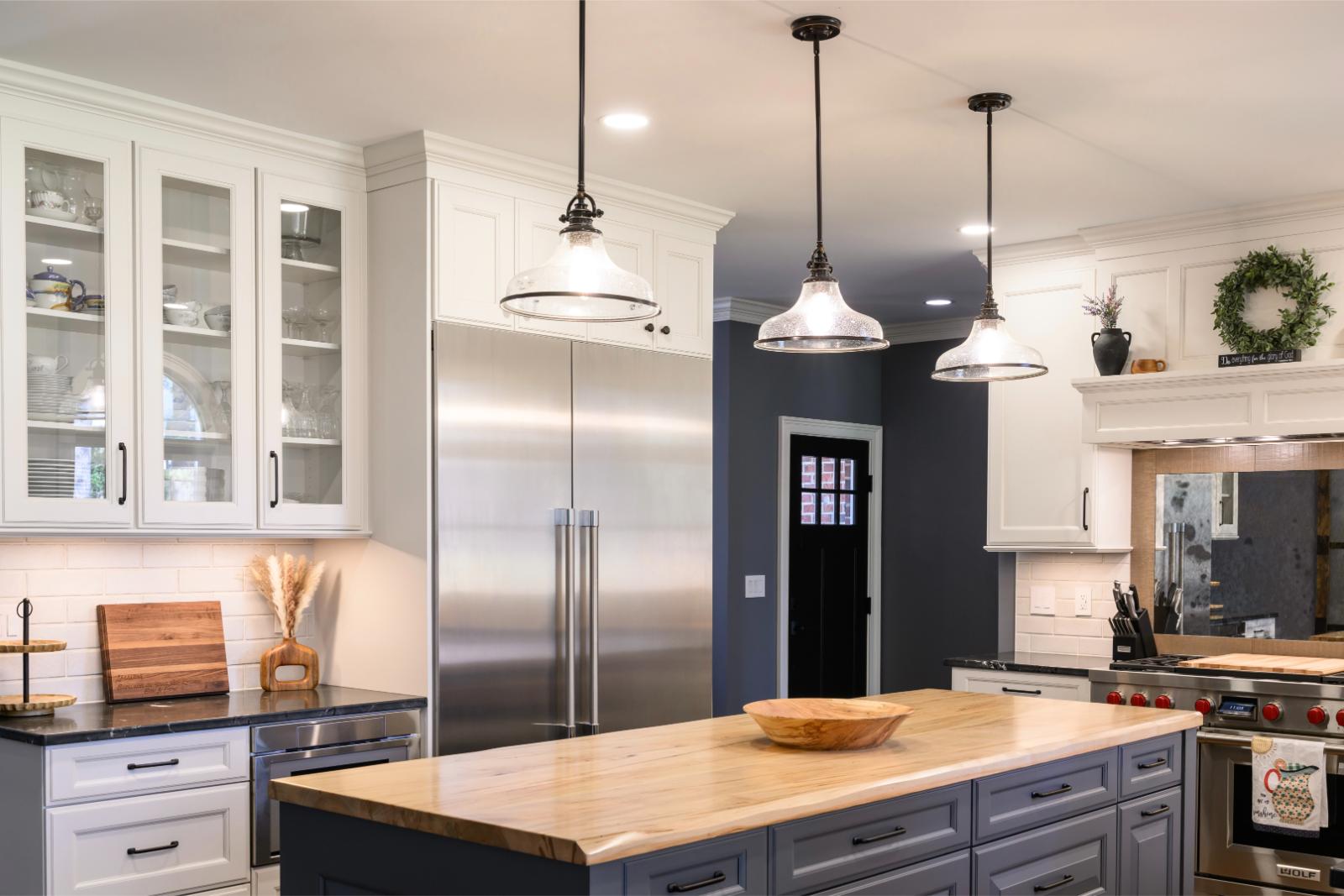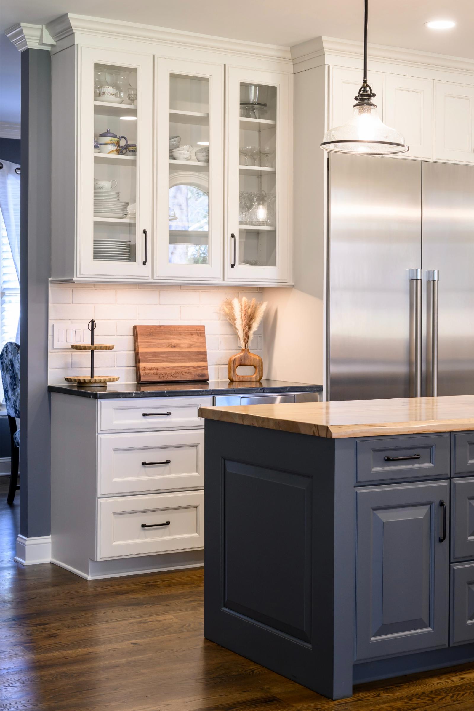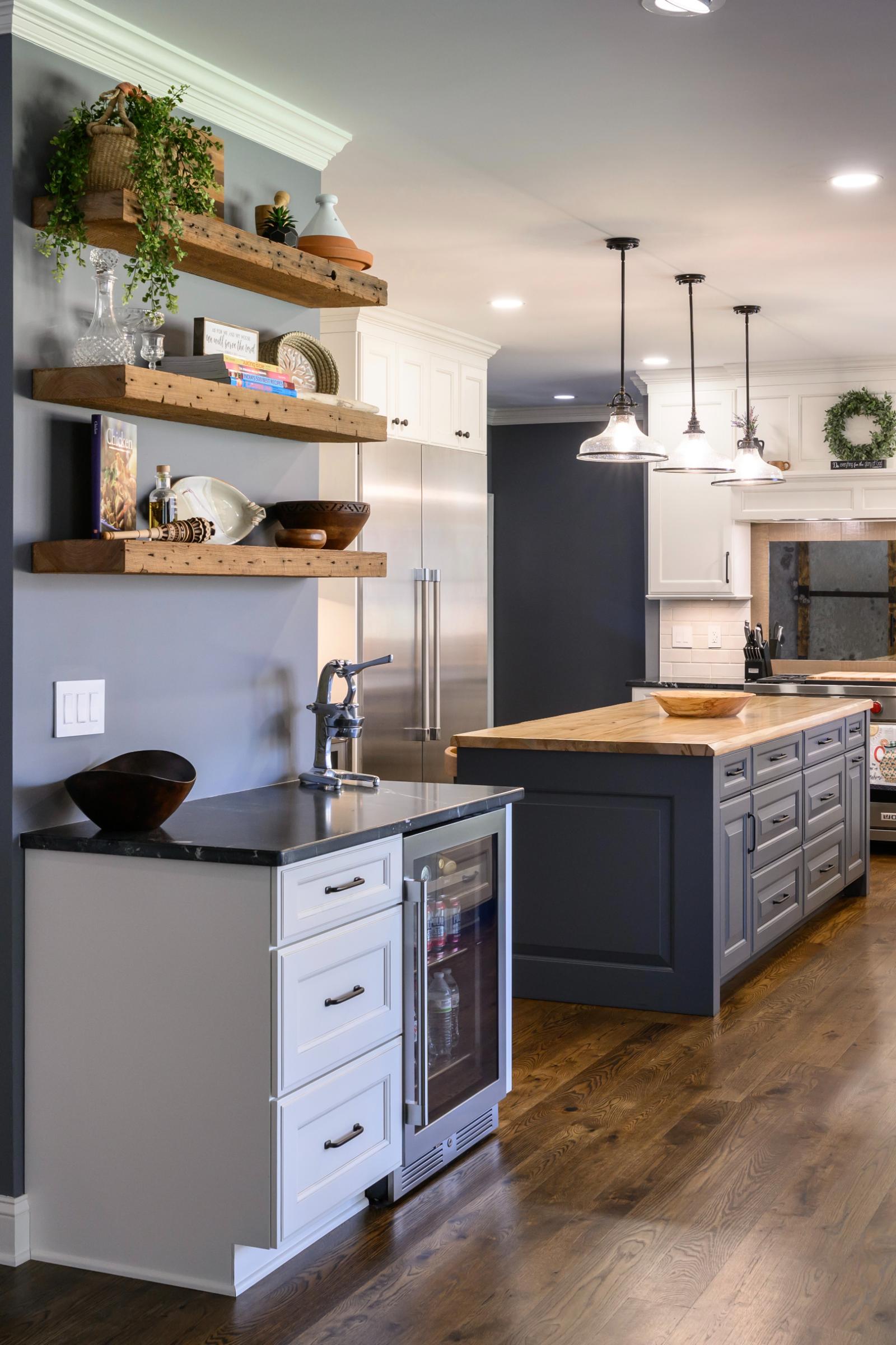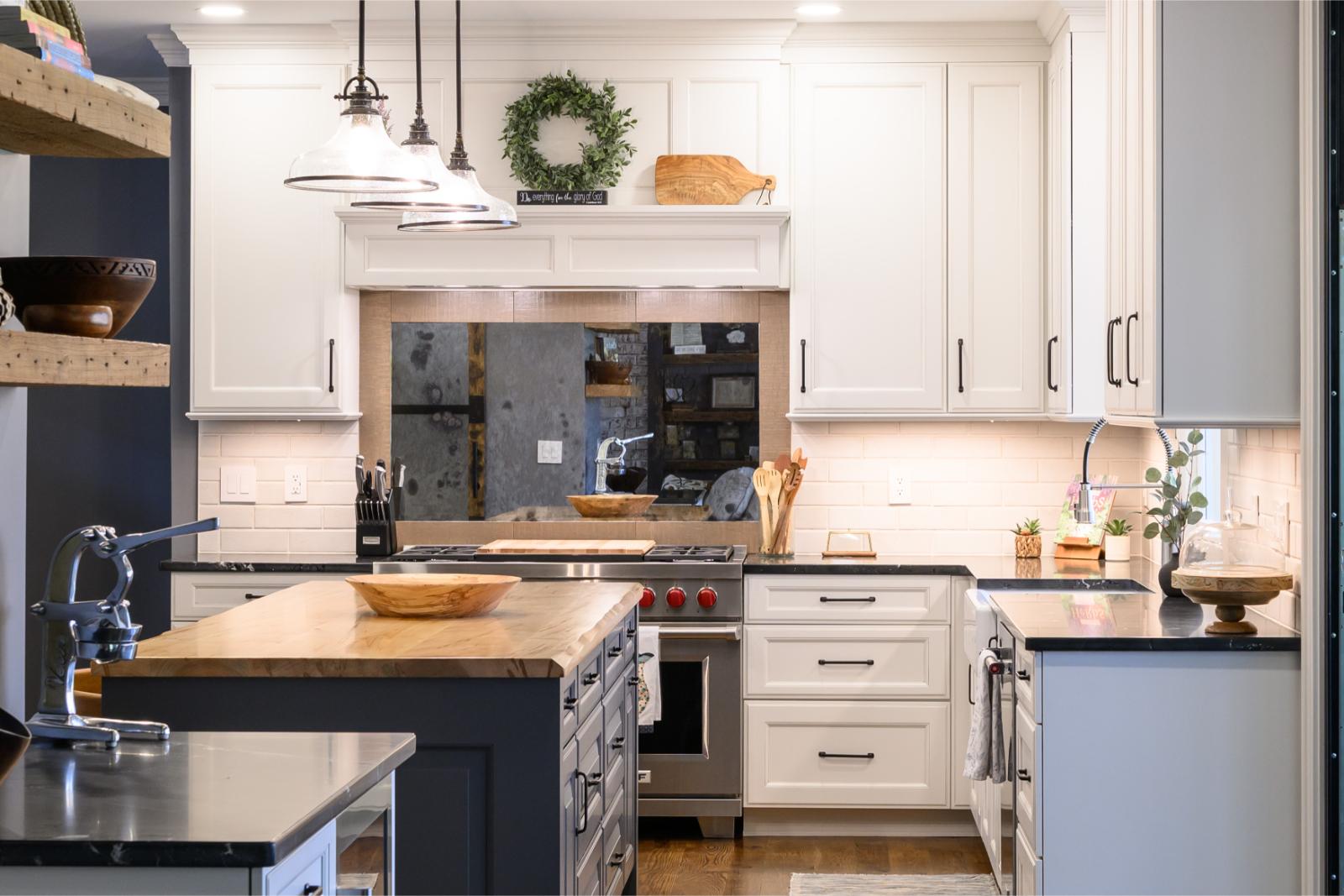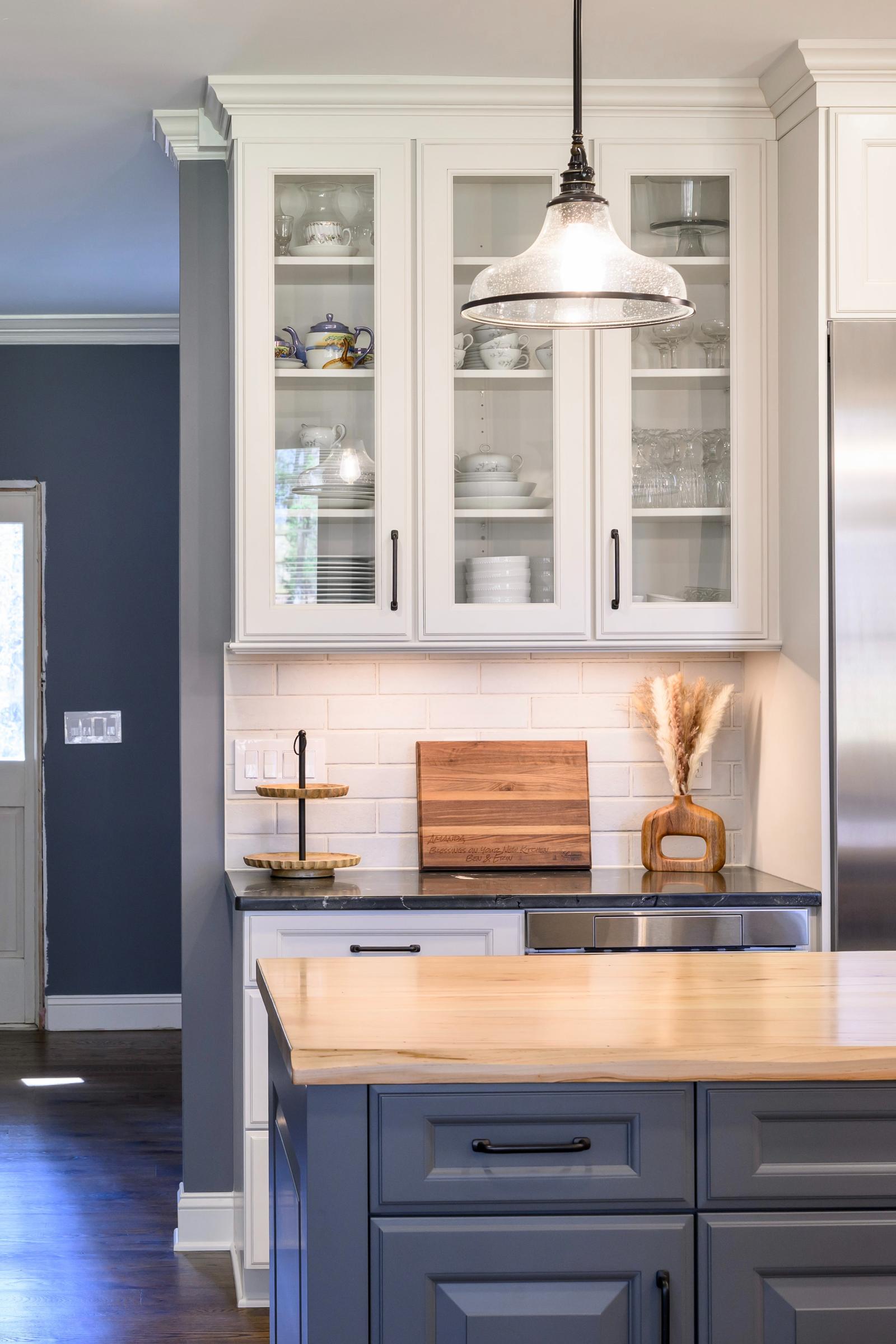 White perimeter cabinets meet a bold blue-gray island in this classic, character-filled kitchen. Warm wood tones, black hardware, and industrial-style pendant lights give the space a grounded, farmhouse feel that's both timeless and lived-in.