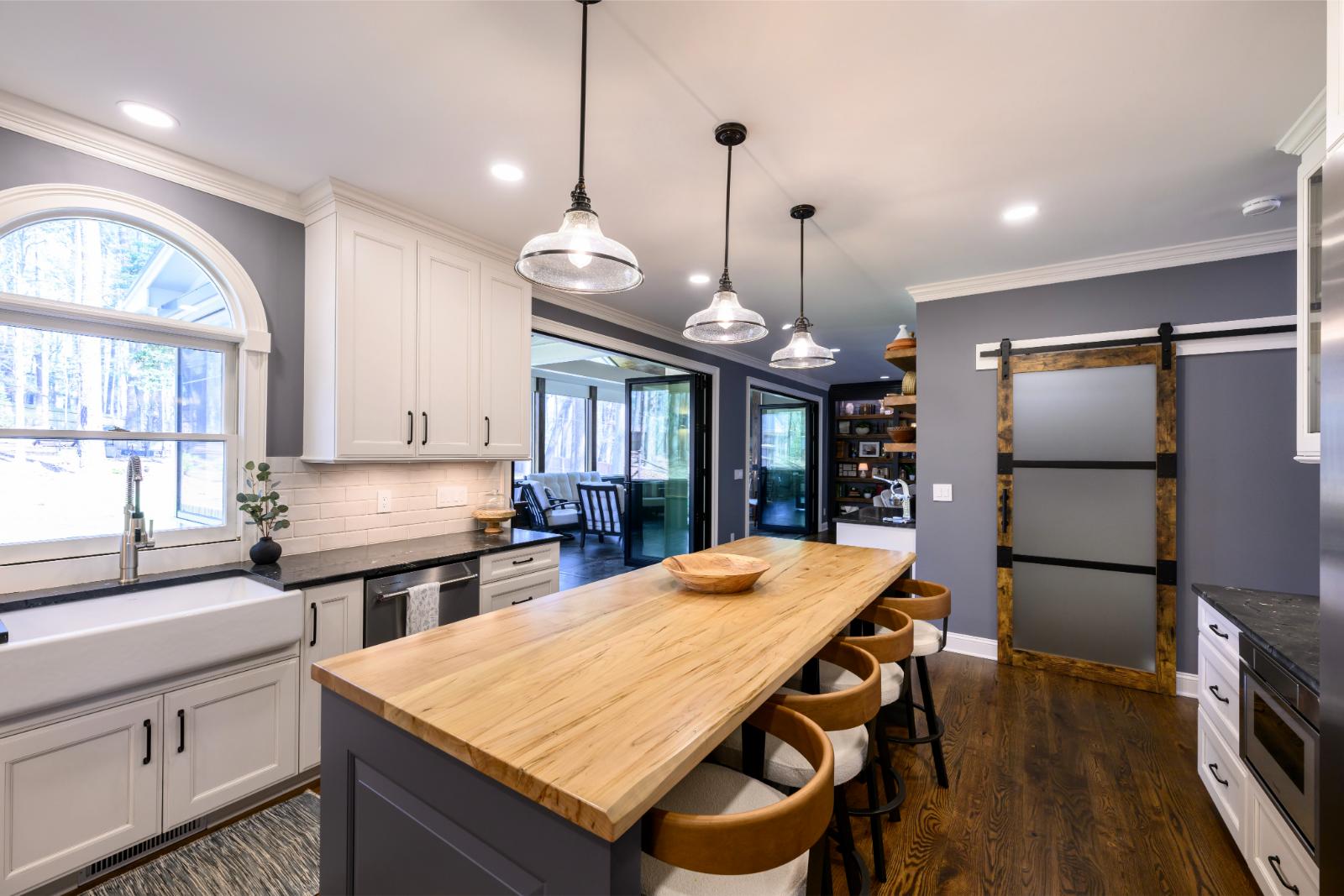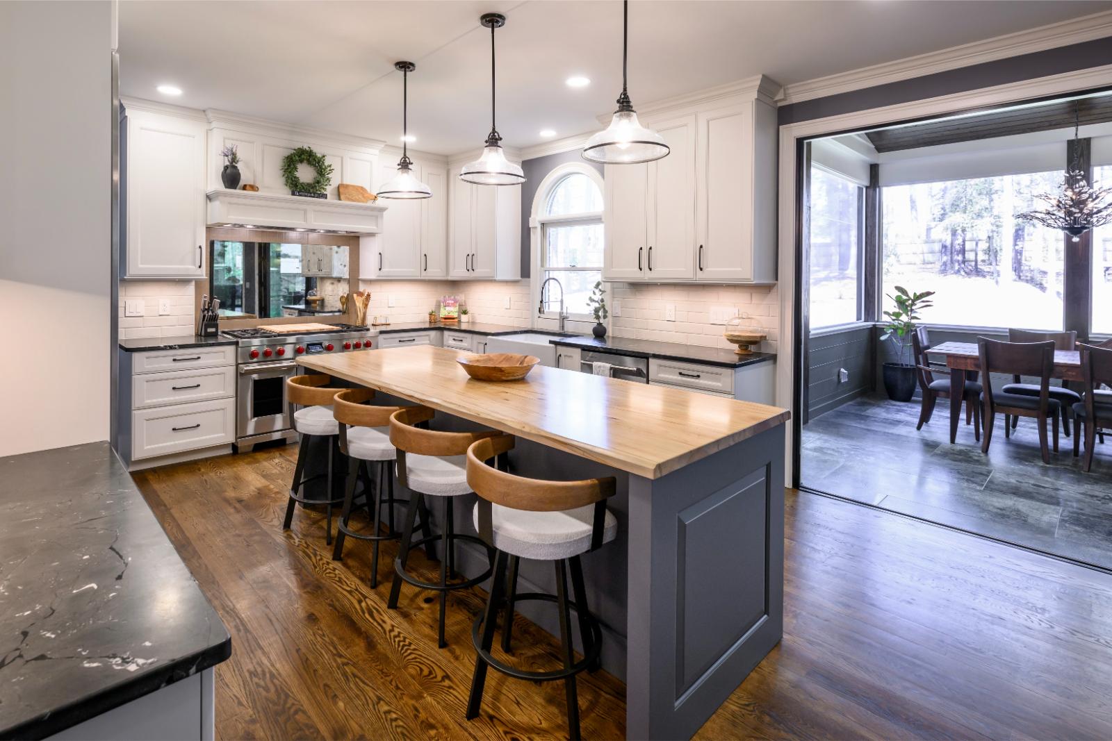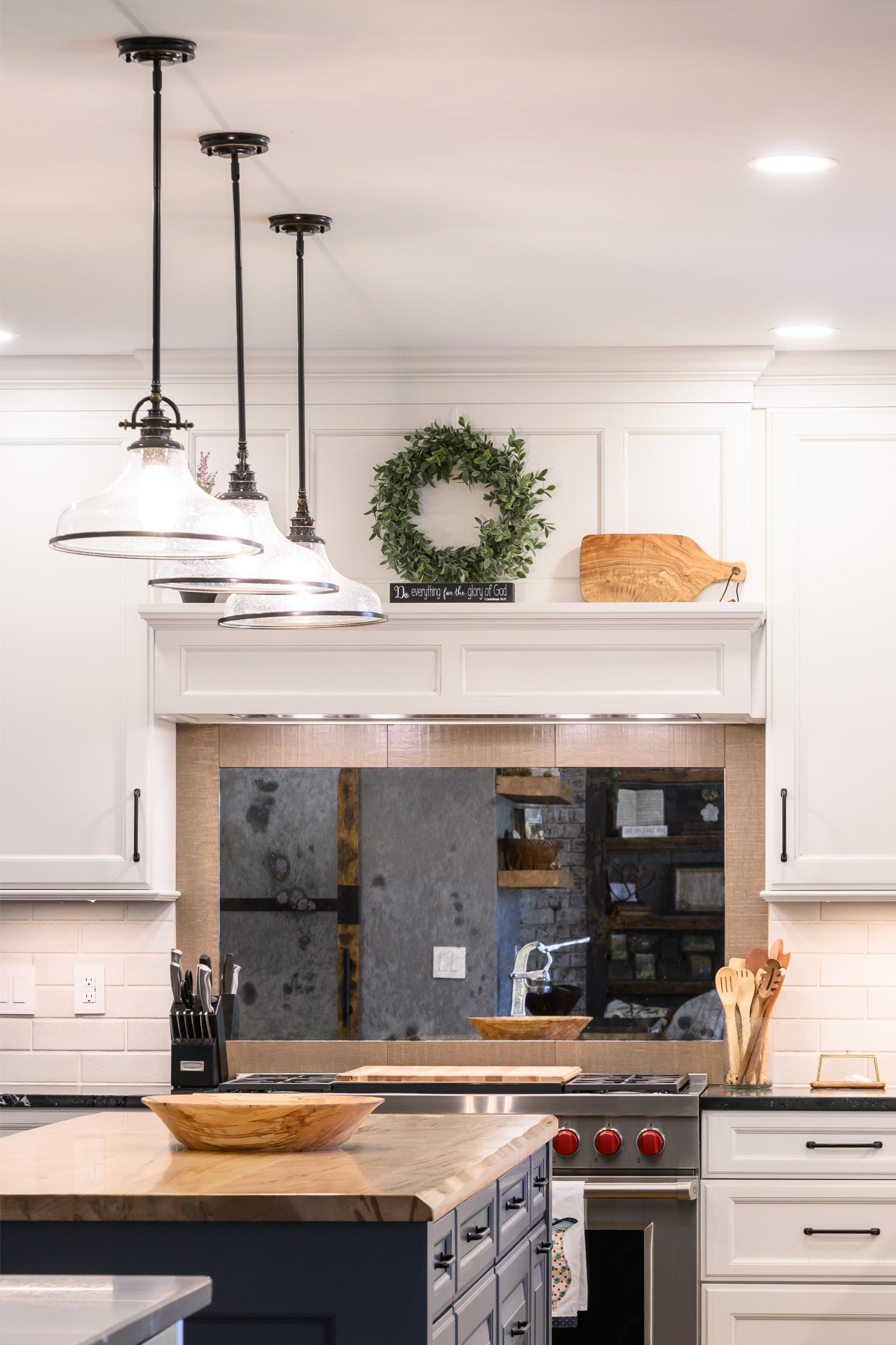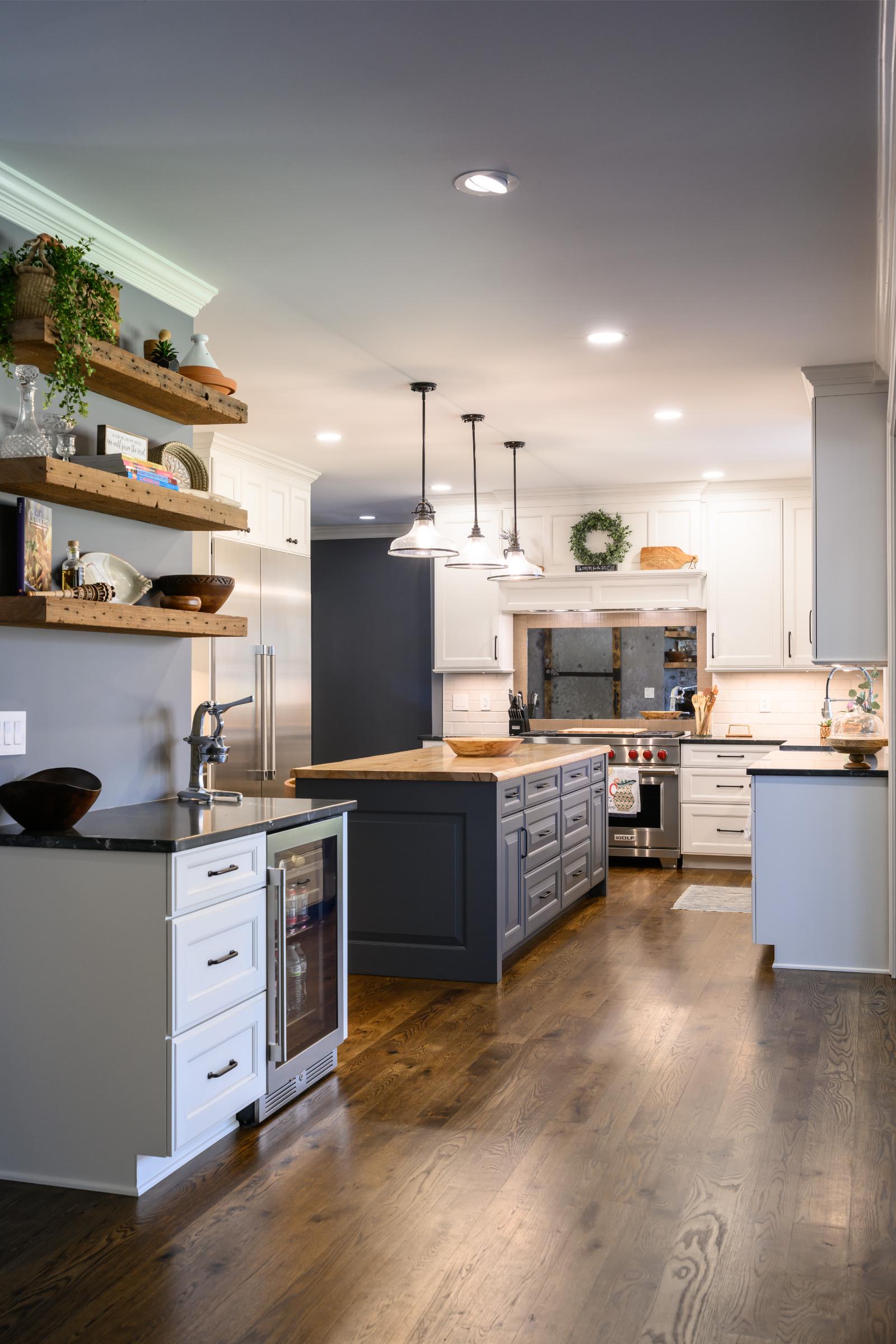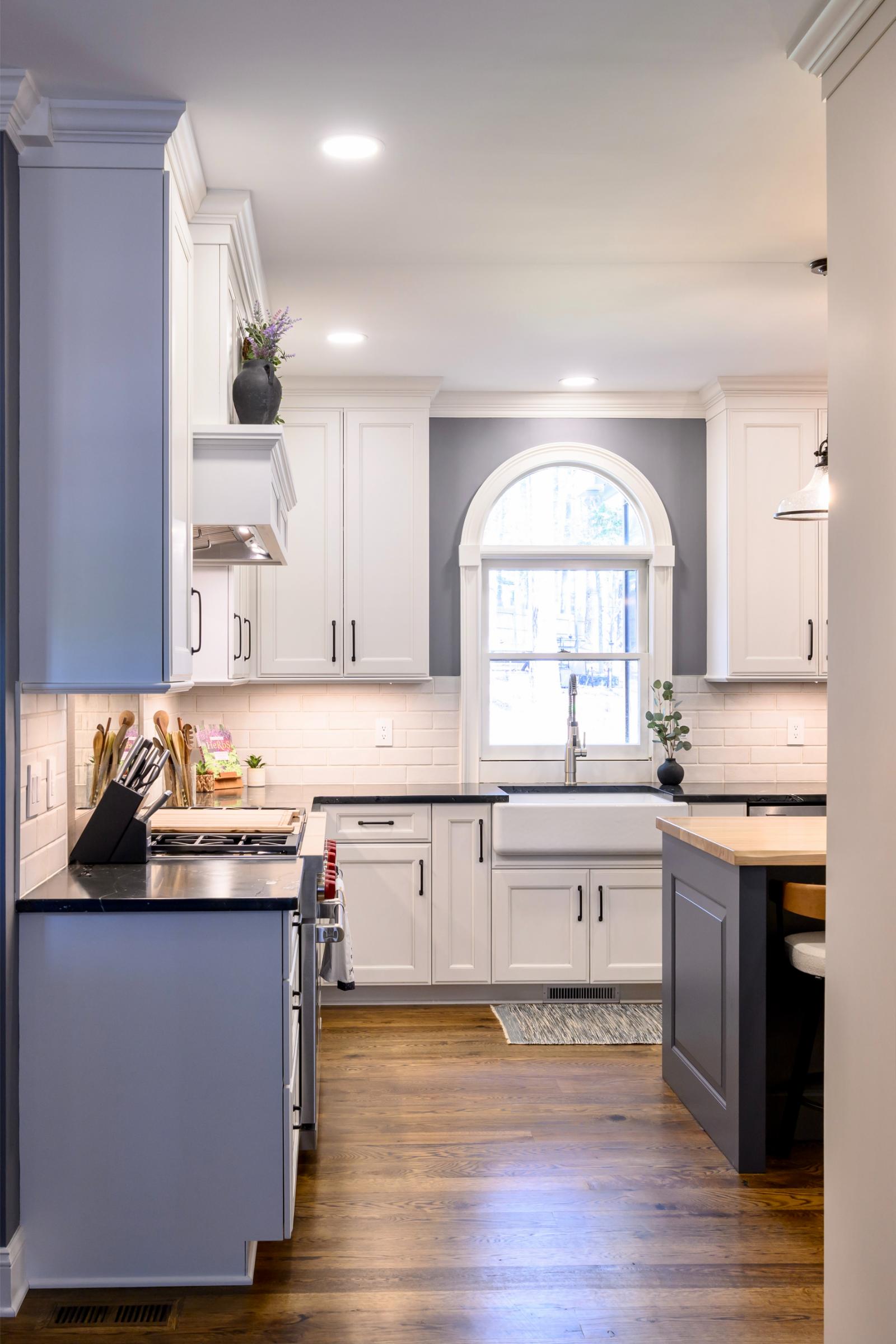 White perimeter cabinets meet a bold blue-gray island in this classic, character-filled kitchen. Warm wood tones, black hardware, and industrial-style pendant lights give the space a grounded, farmhouse feel that's both timeless and lived-in.