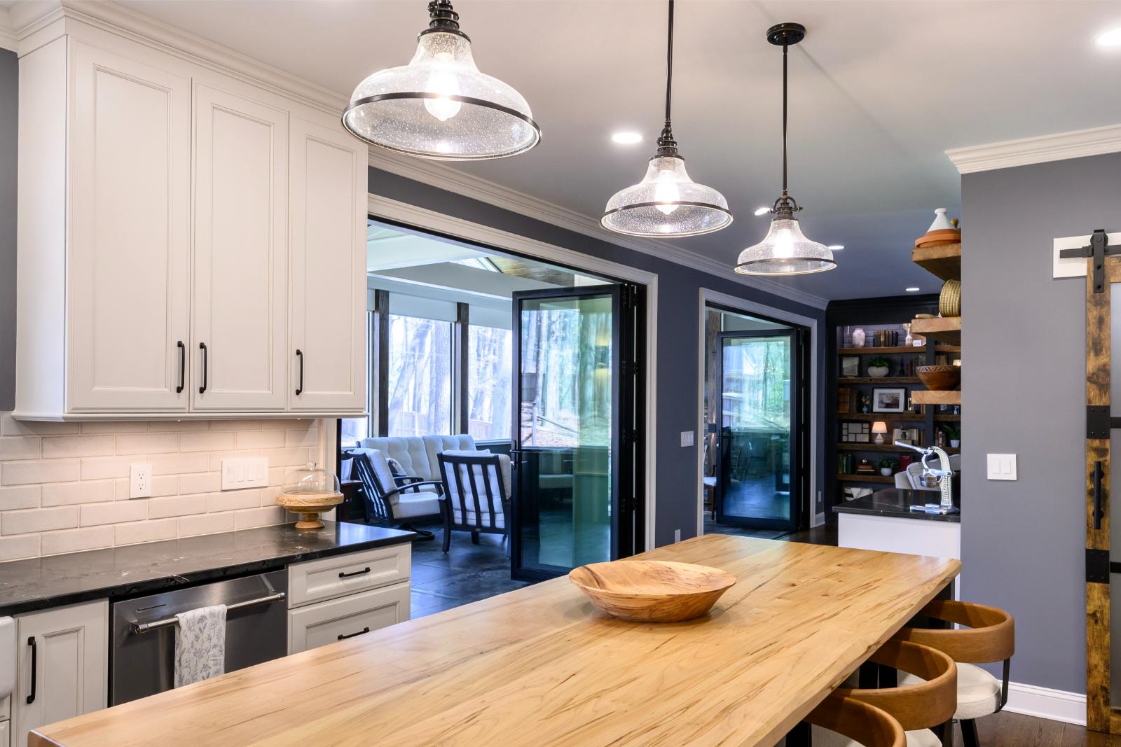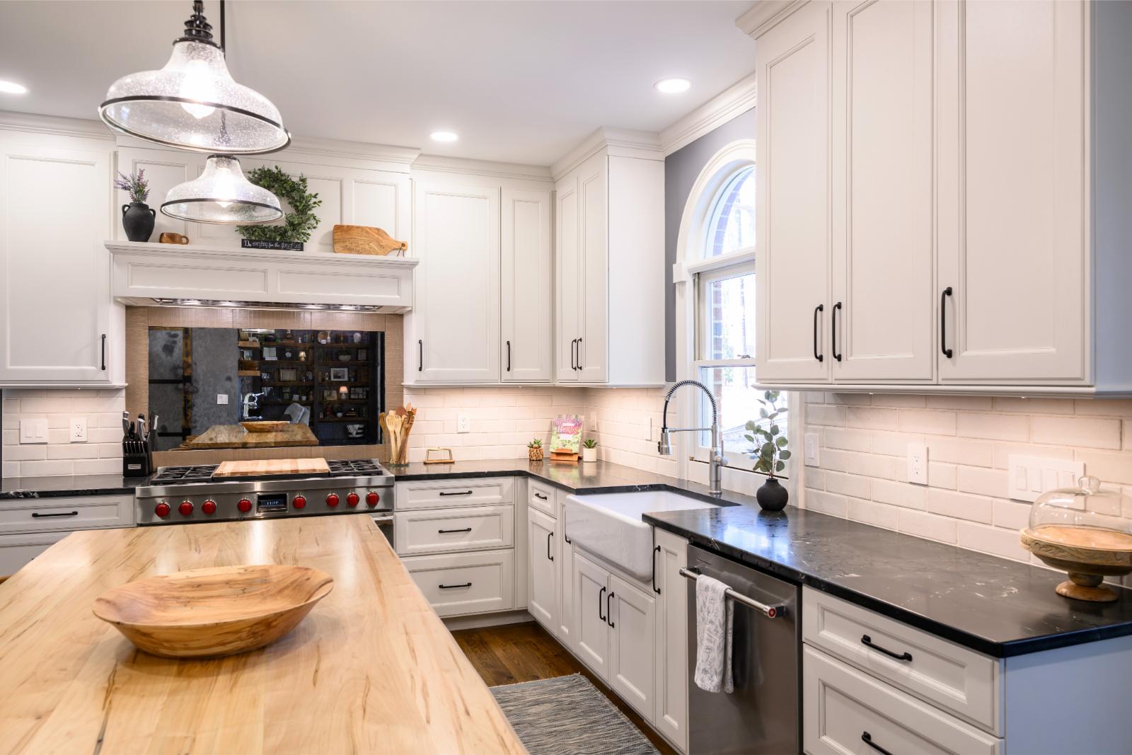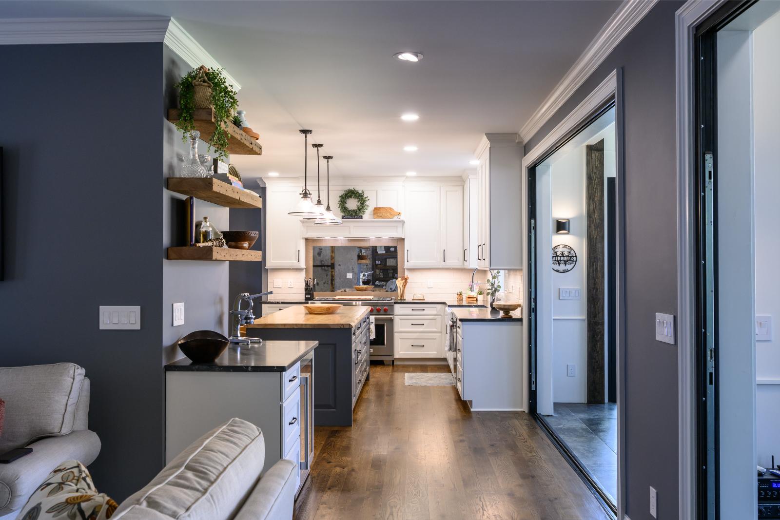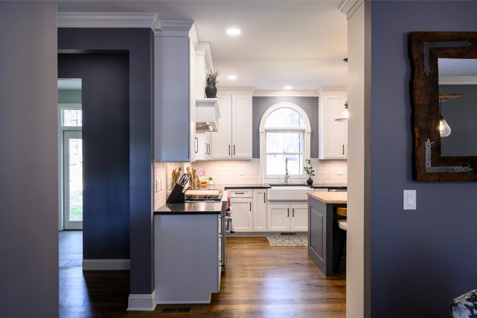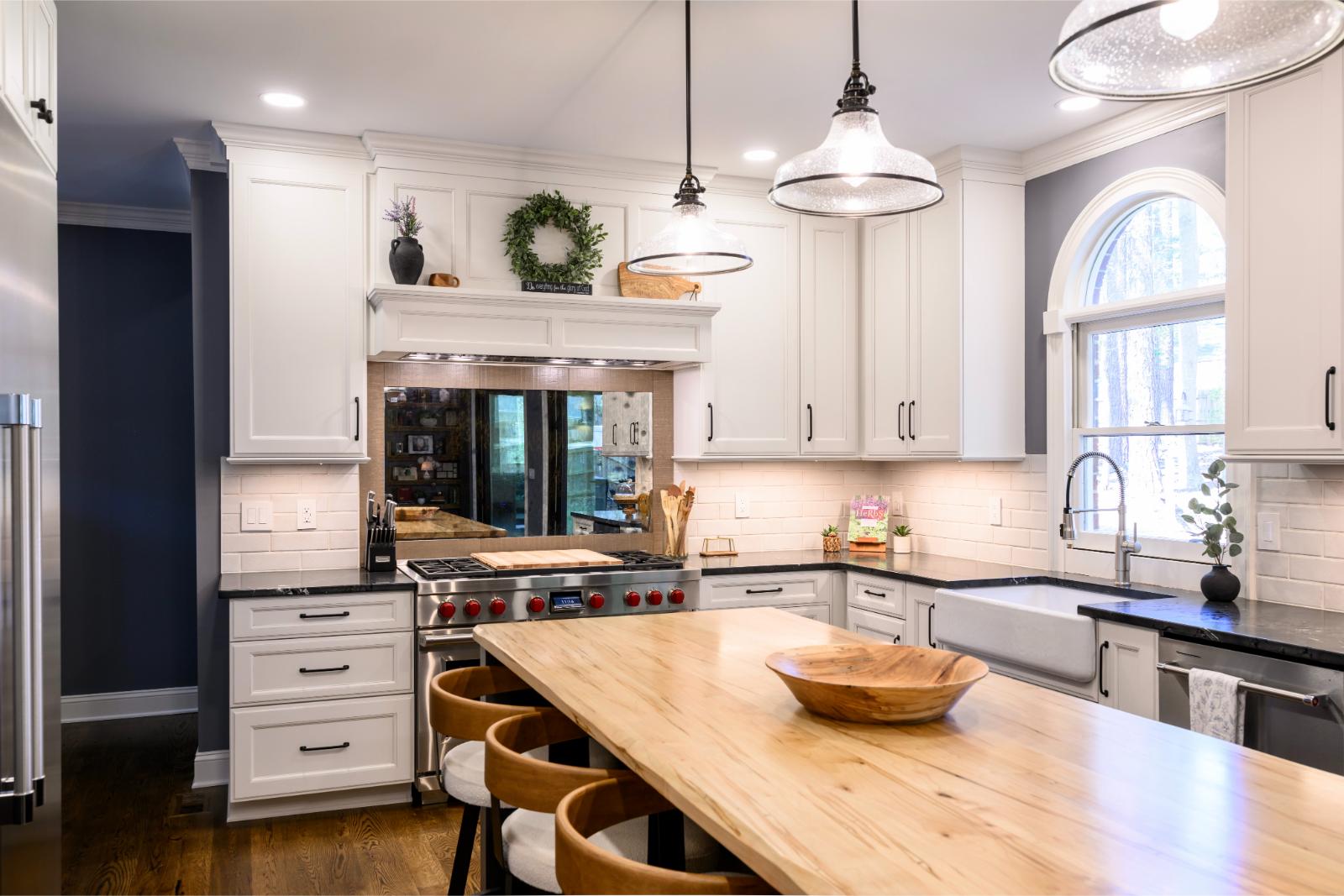 White perimeter cabinets meet a bold blue-gray island in this classic, character-filled kitchen. Warm wood tones, black hardware, and industrial-style pendant lights give the space a grounded, farmhouse feel that's both timeless and lived-in.