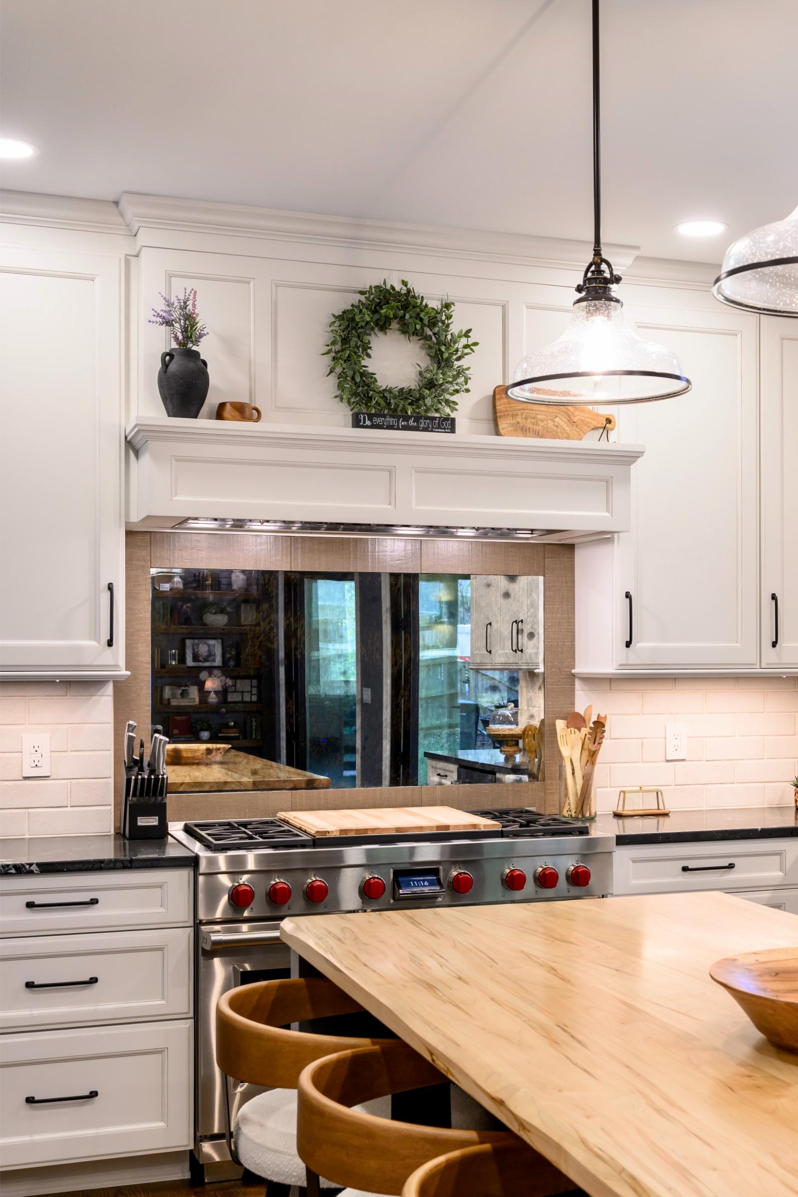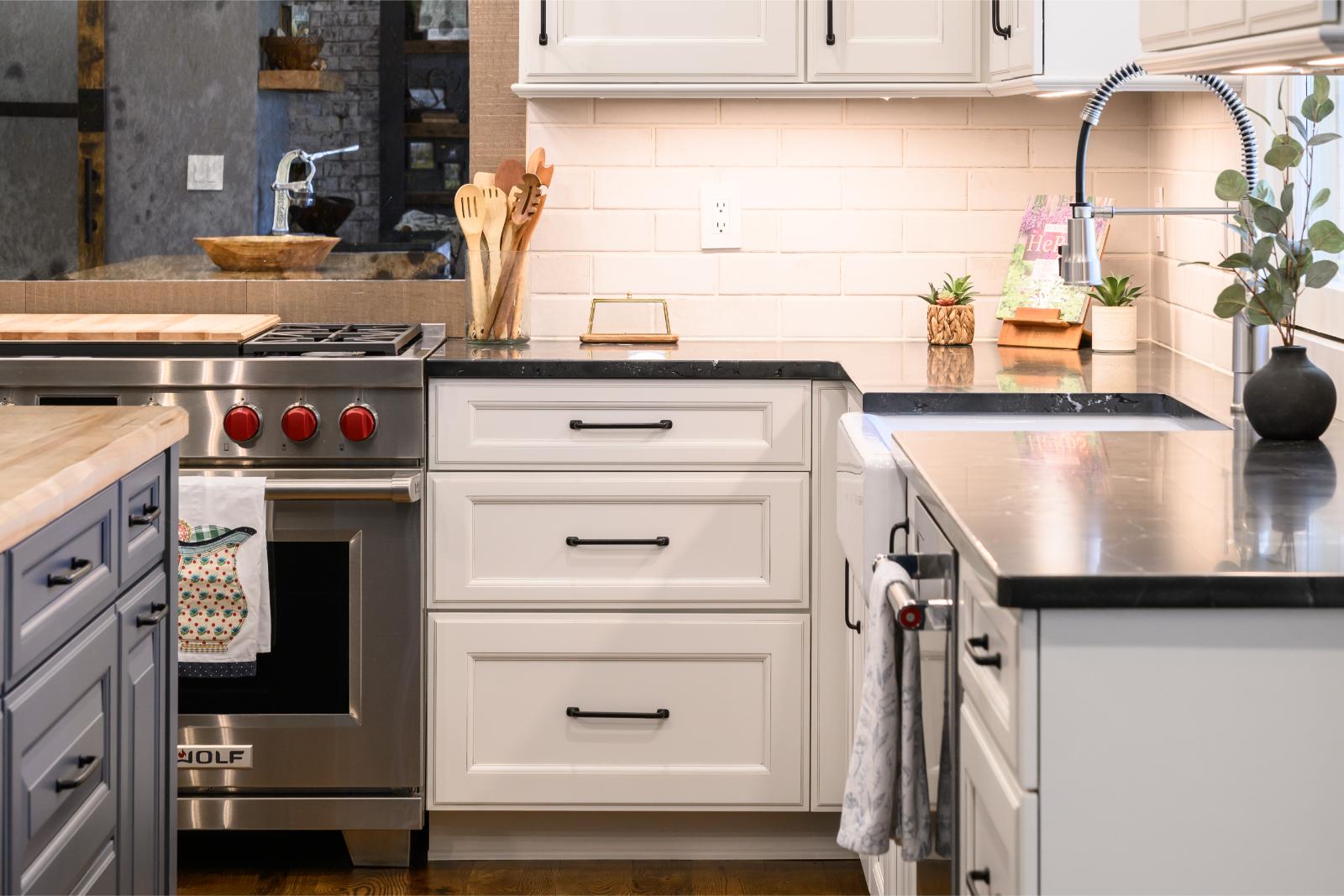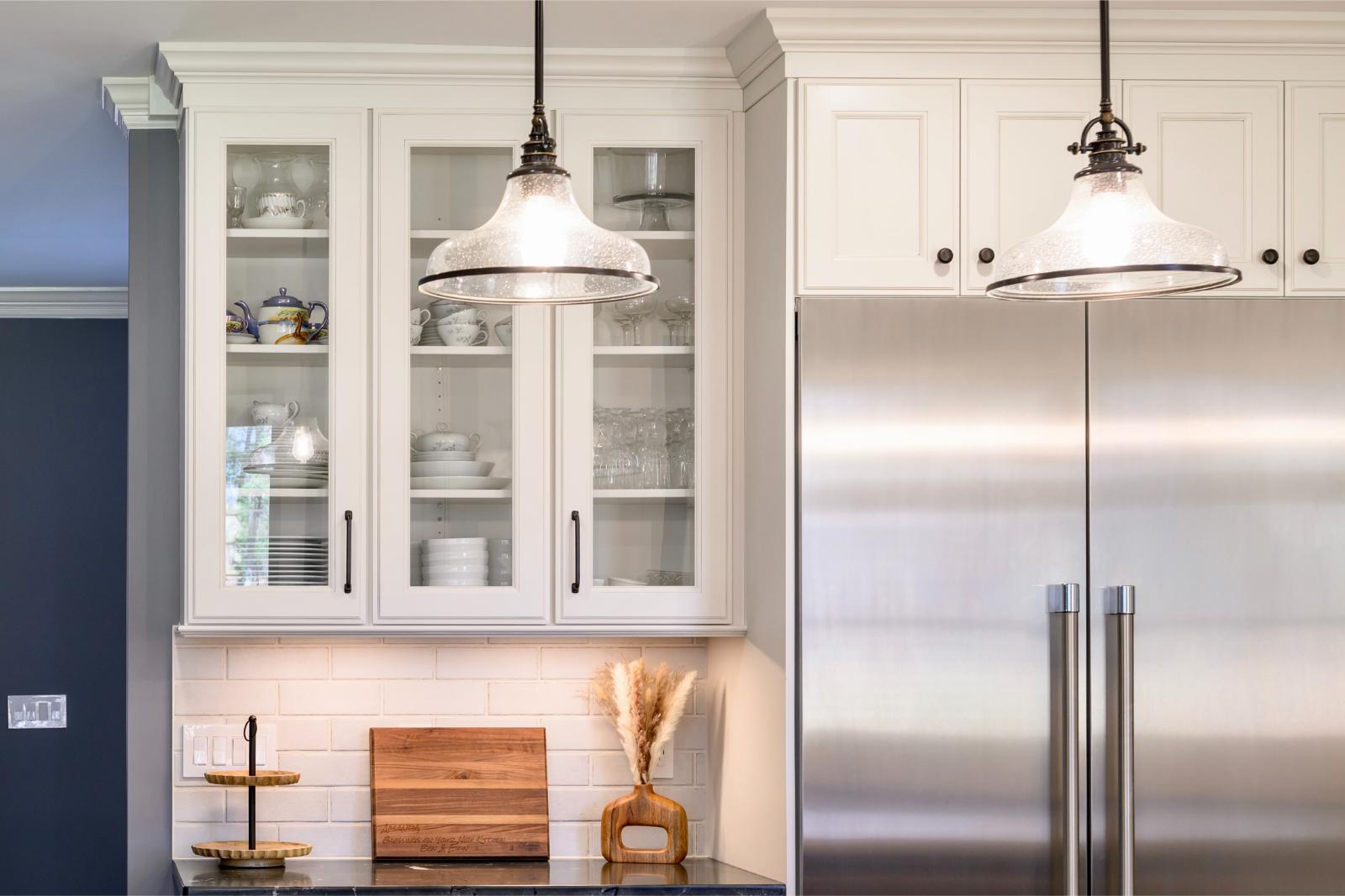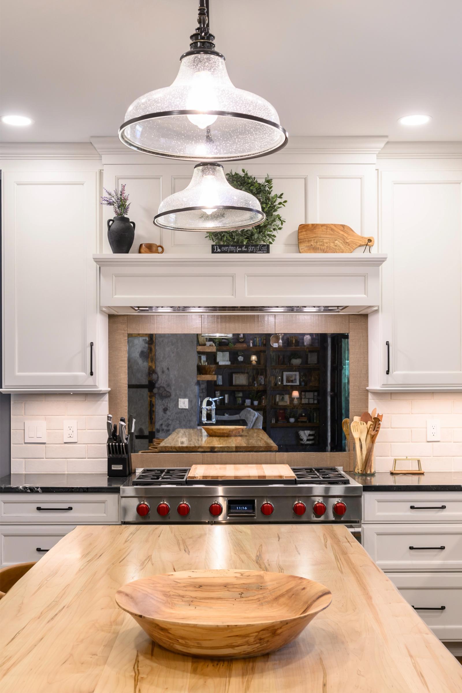 White perimeter cabinets meet a bold blue-gray island in this classic, character-filled kitchen. Warm wood tones, black hardware, and industrial-style pendant lights give the space a grounded, farmhouse feel that's both timeless and lived-in.