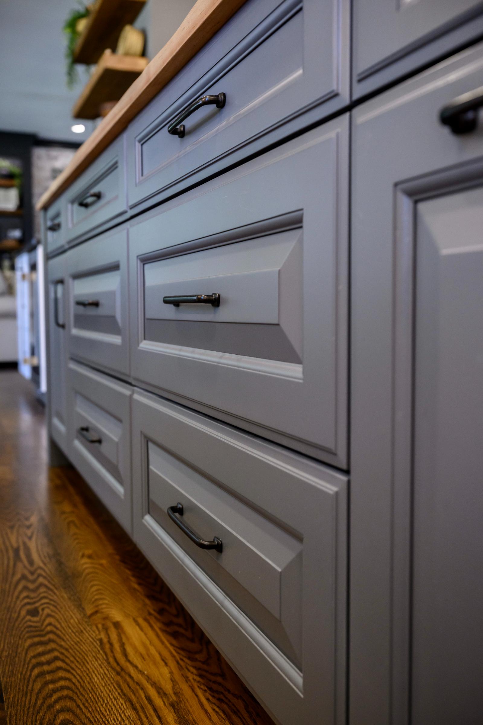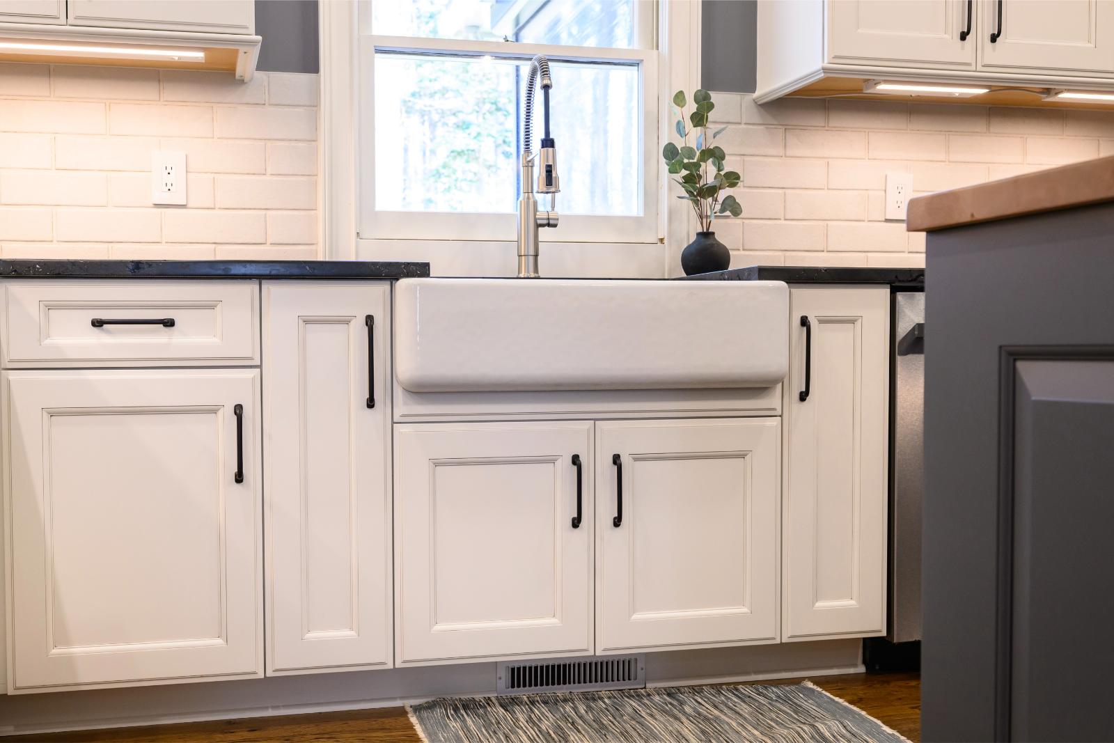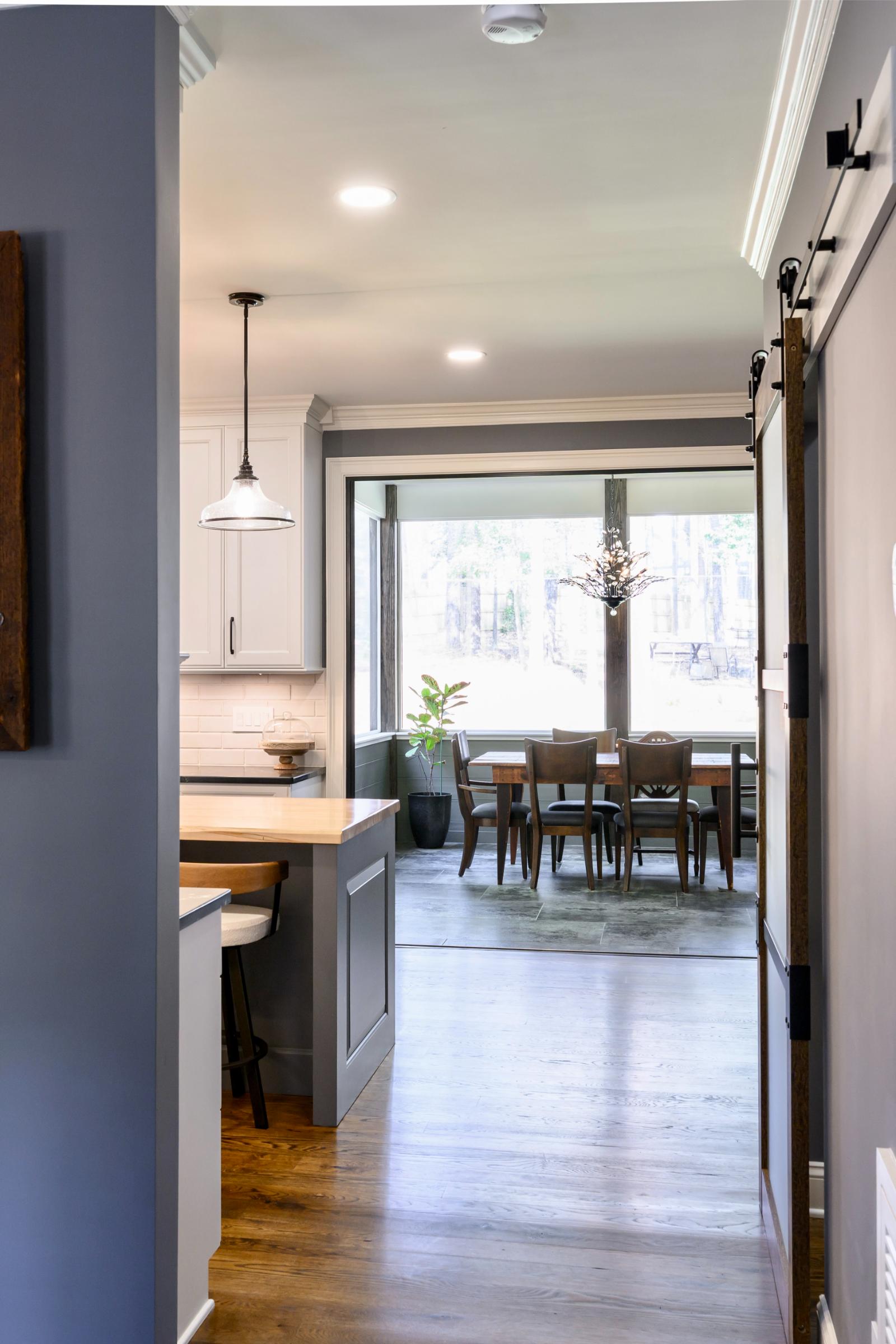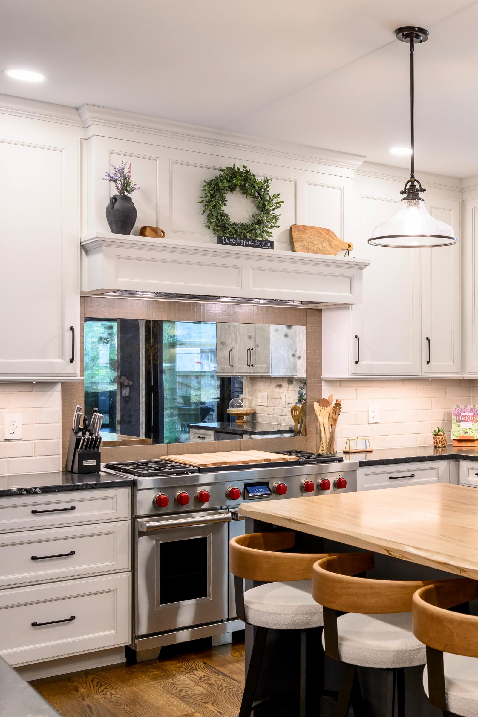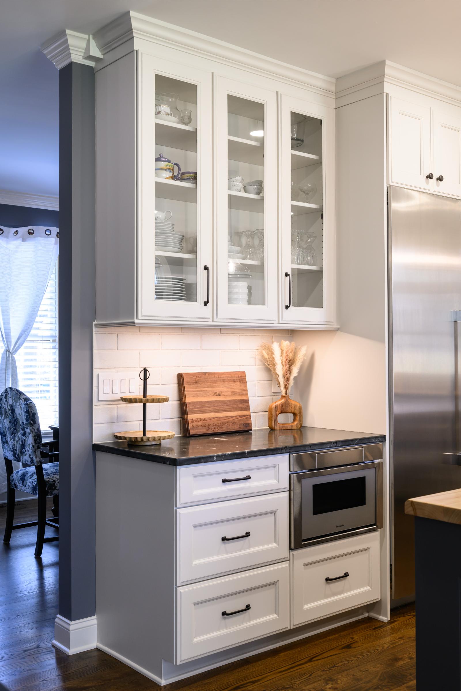 White perimeter cabinets meet a bold blue-gray island in this classic, character-filled kitchen. Warm wood tones, black hardware, and industrial-style pendant lights give the space a grounded, farmhouse feel that's both timeless and lived-in.