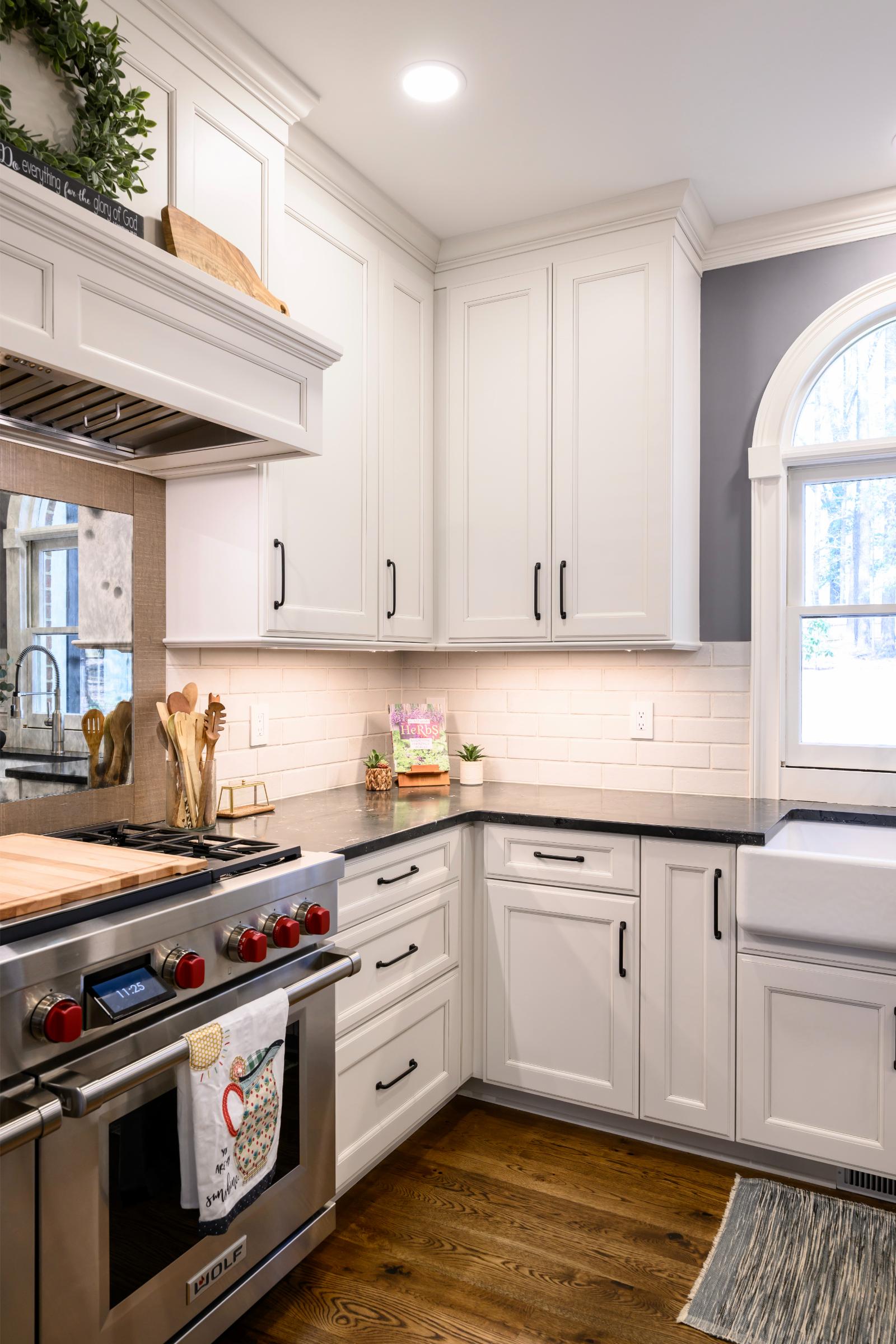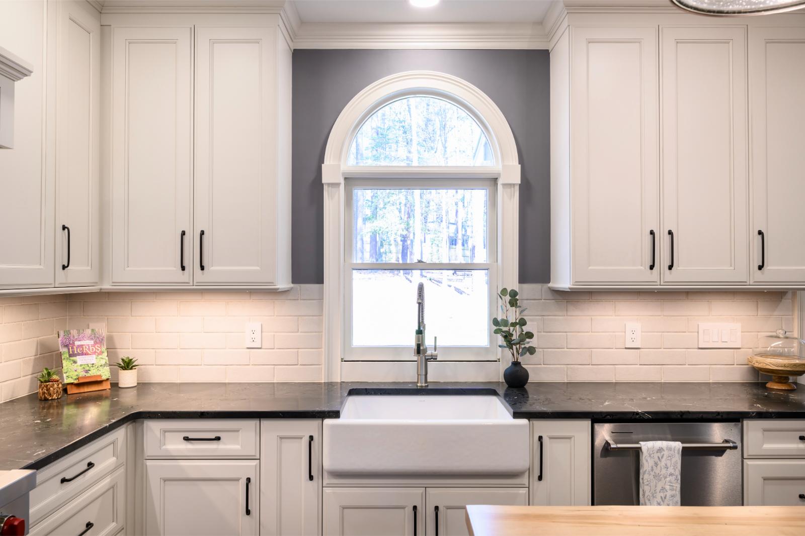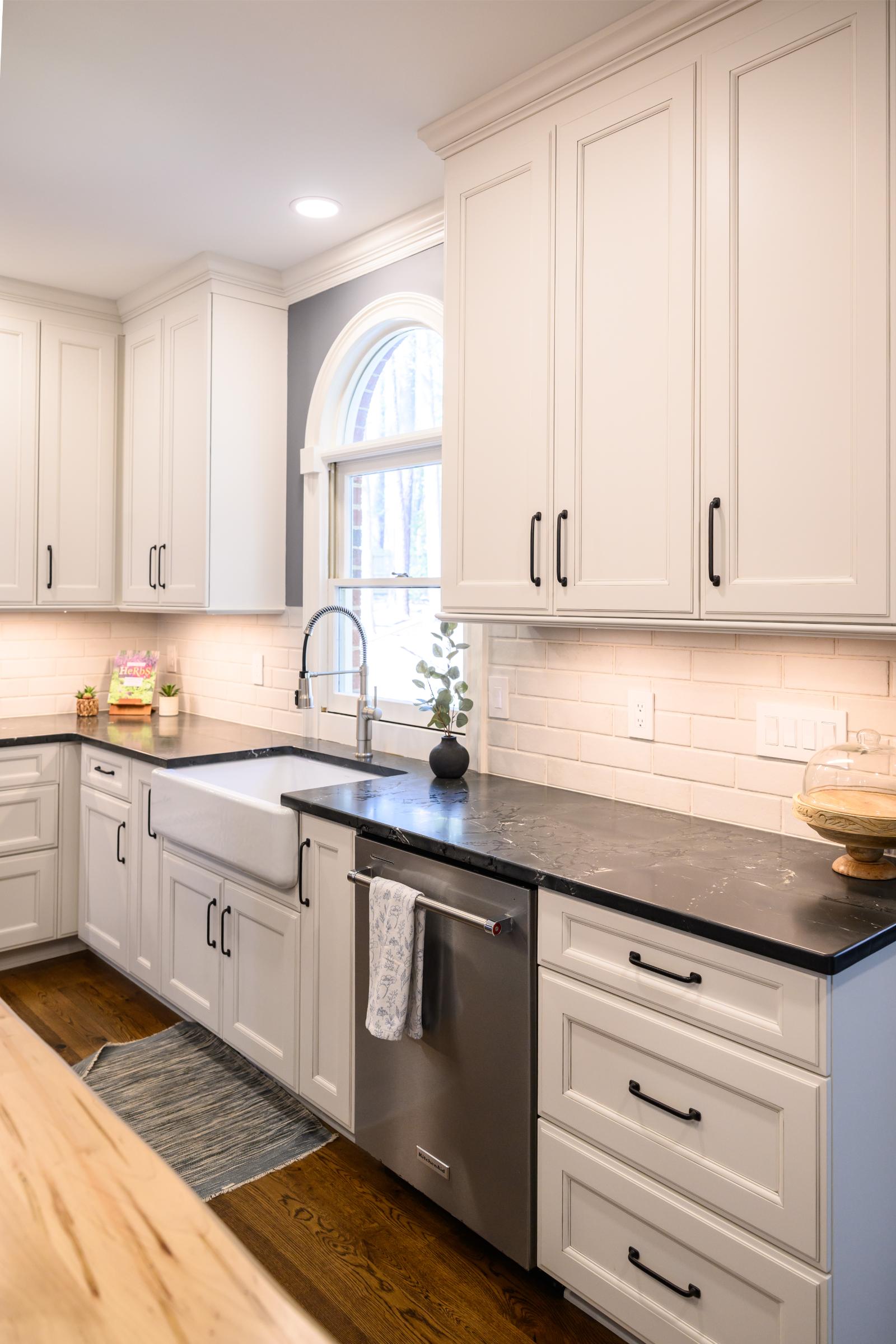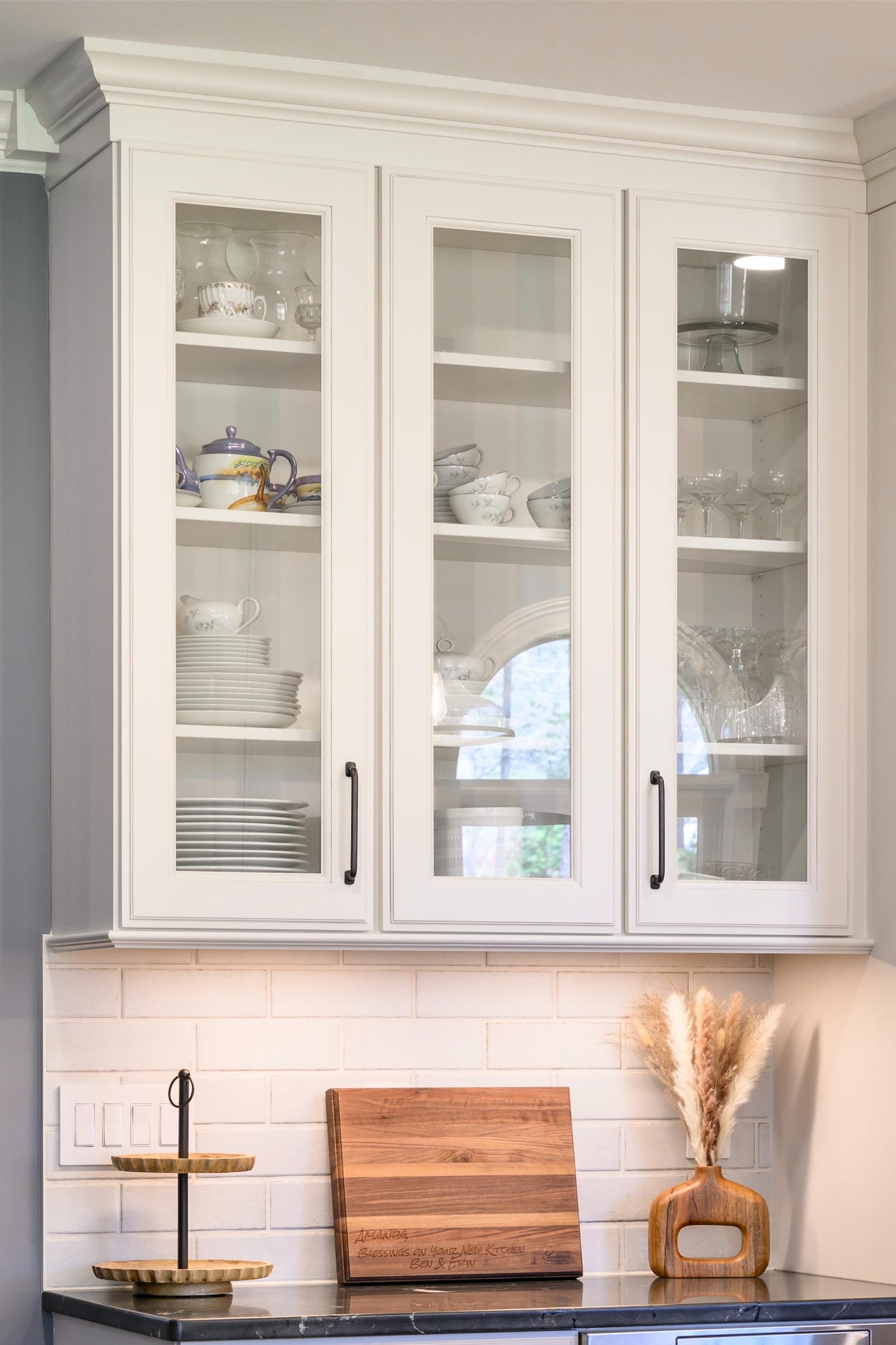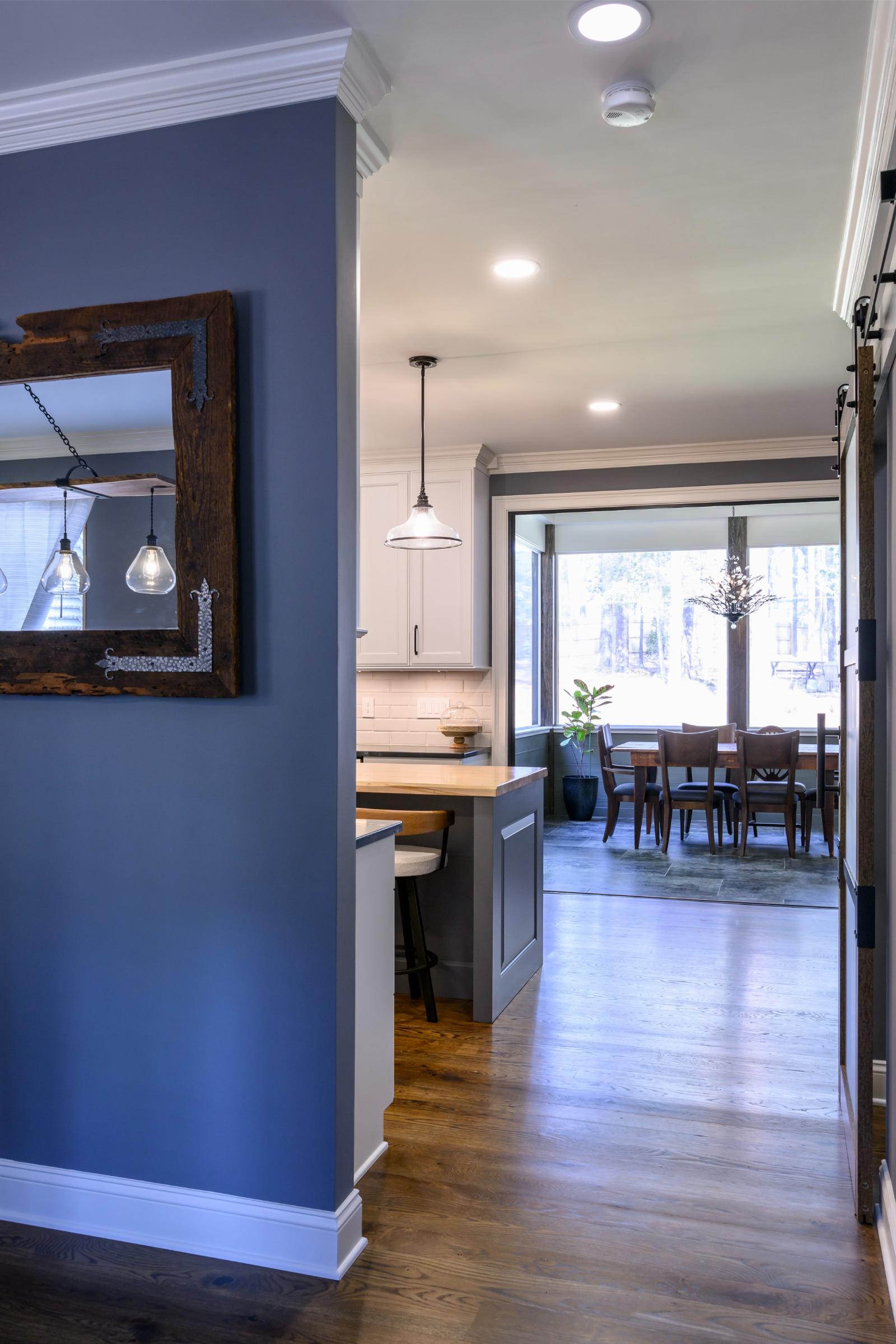 White perimeter cabinets meet a bold blue-gray island in this classic, character-filled kitchen. Warm wood tones, black hardware, and industrial-style pendant lights give the space a grounded, farmhouse feel that's both timeless and lived-in.