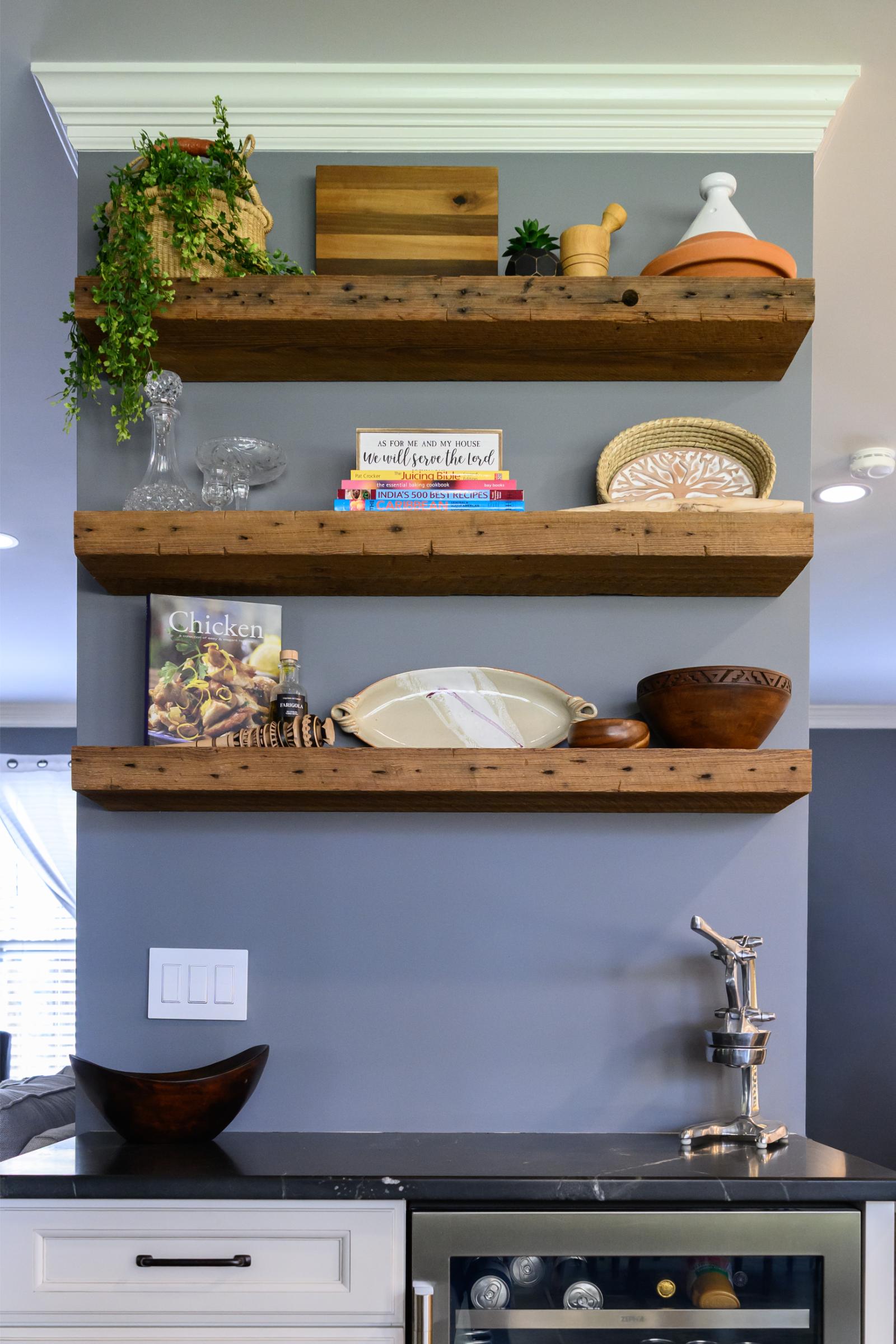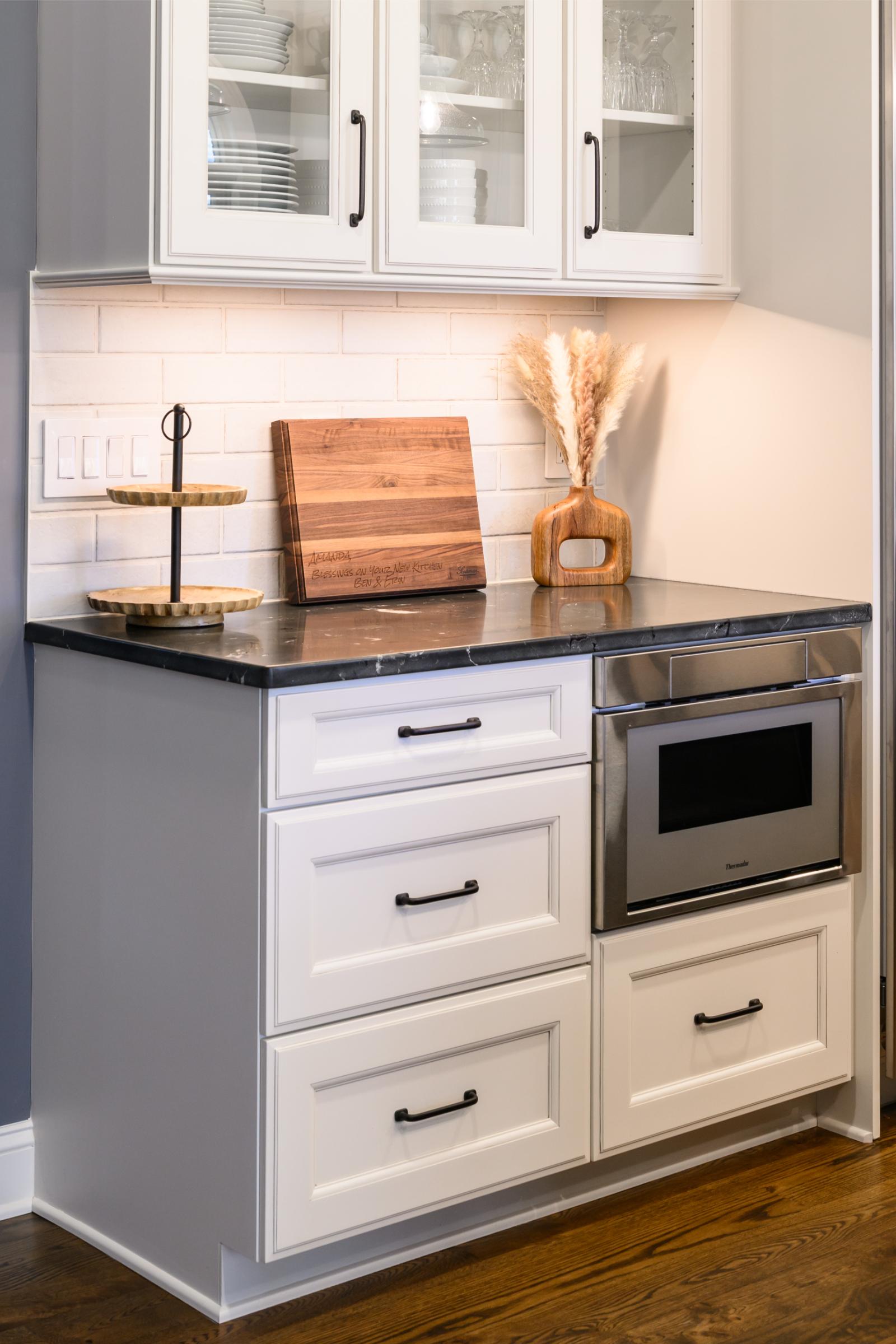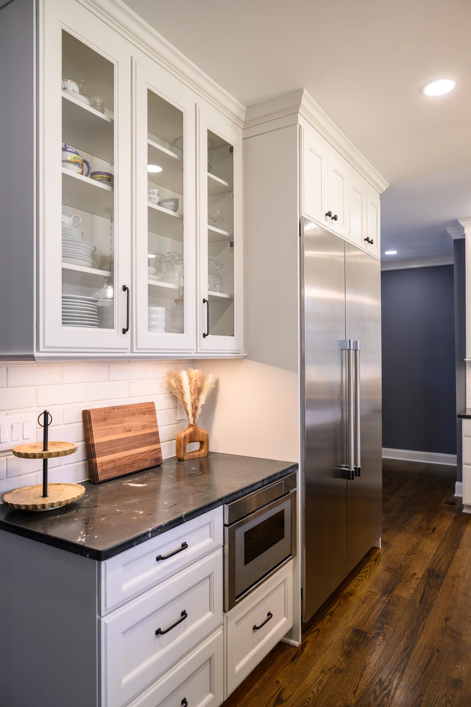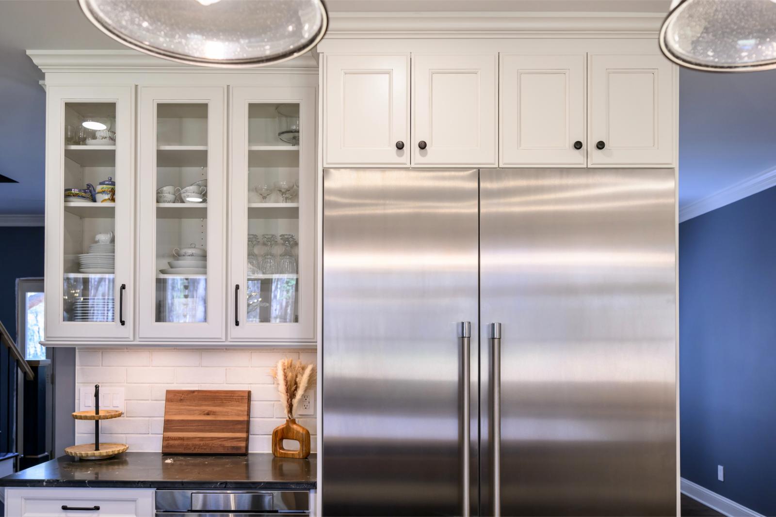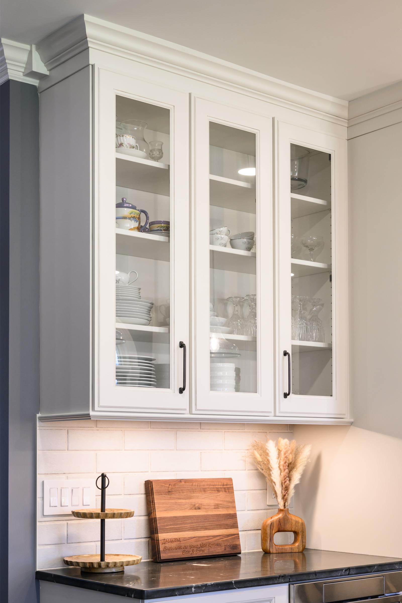 White perimeter cabinets meet a bold blue-gray island in this classic, character-filled kitchen. Warm wood tones, black hardware, and industrial-style pendant lights give the space a grounded, farmhouse feel that's both timeless and lived-in.
