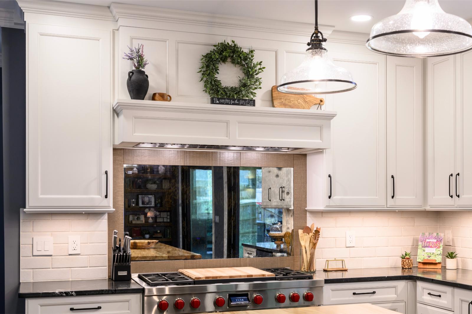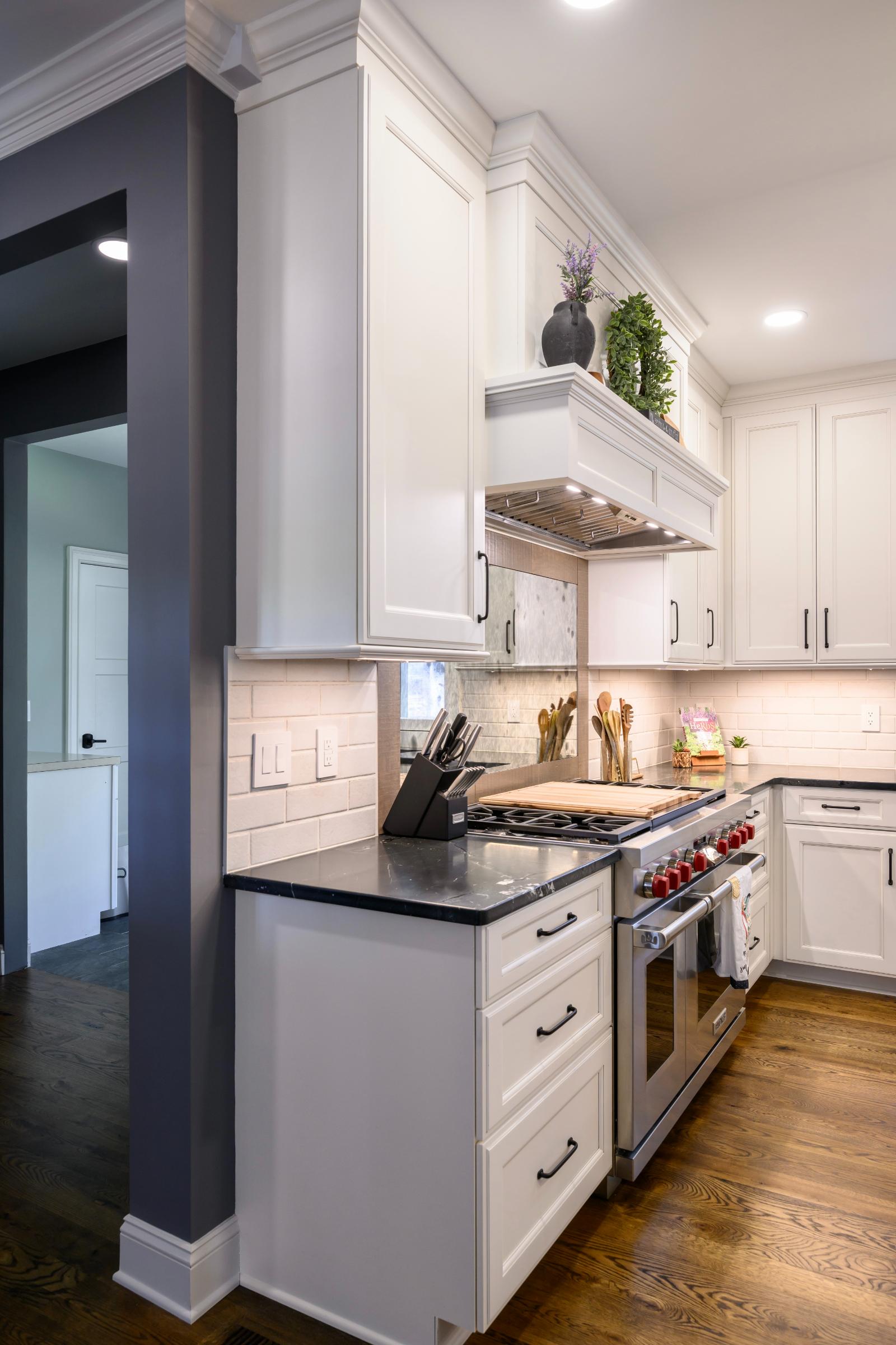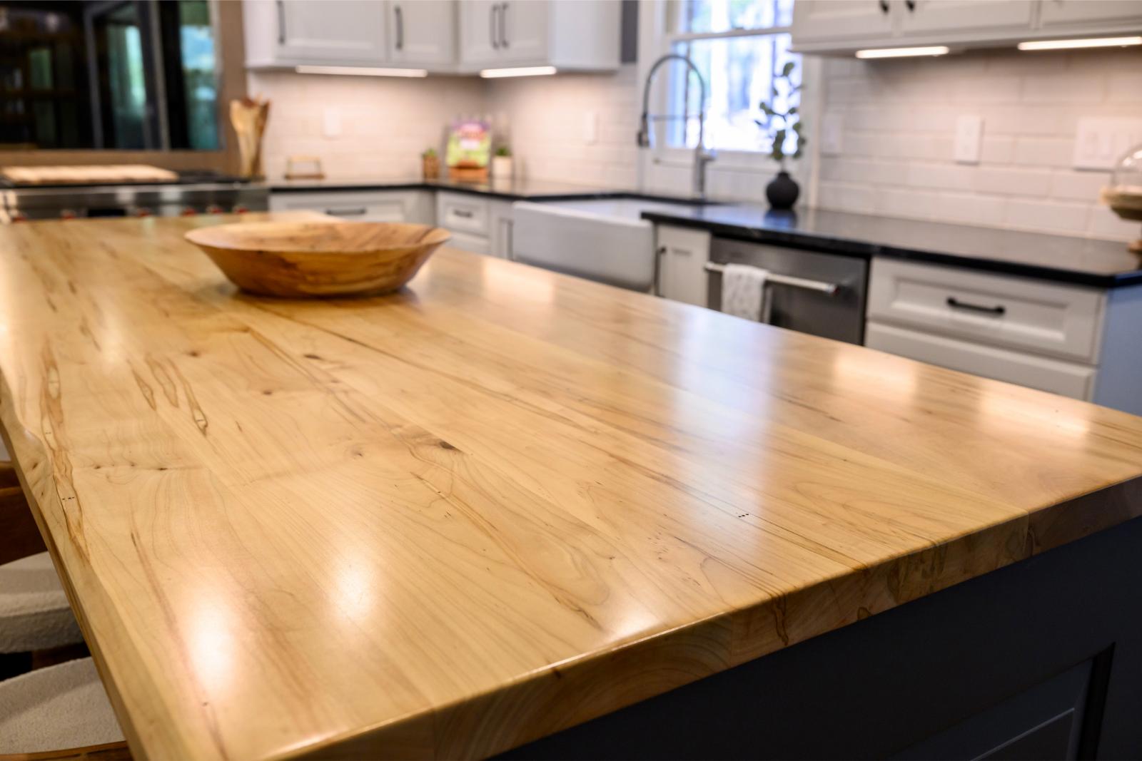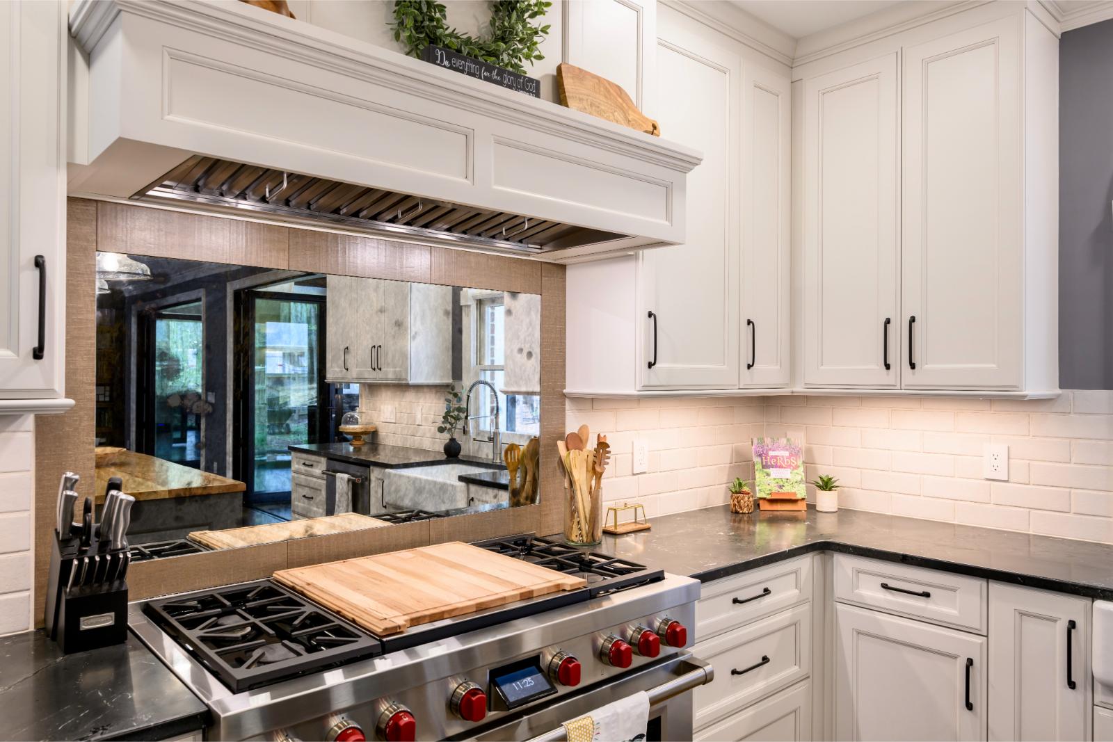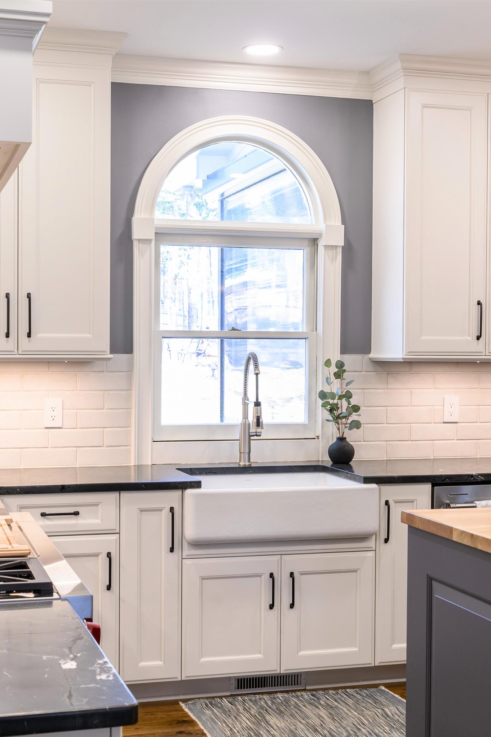 White perimeter cabinets meet a bold blue-gray island in this classic, character-filled kitchen. Warm wood tones, black hardware, and industrial-style pendant lights give the space a grounded, farmhouse feel that's both timeless and lived-in.