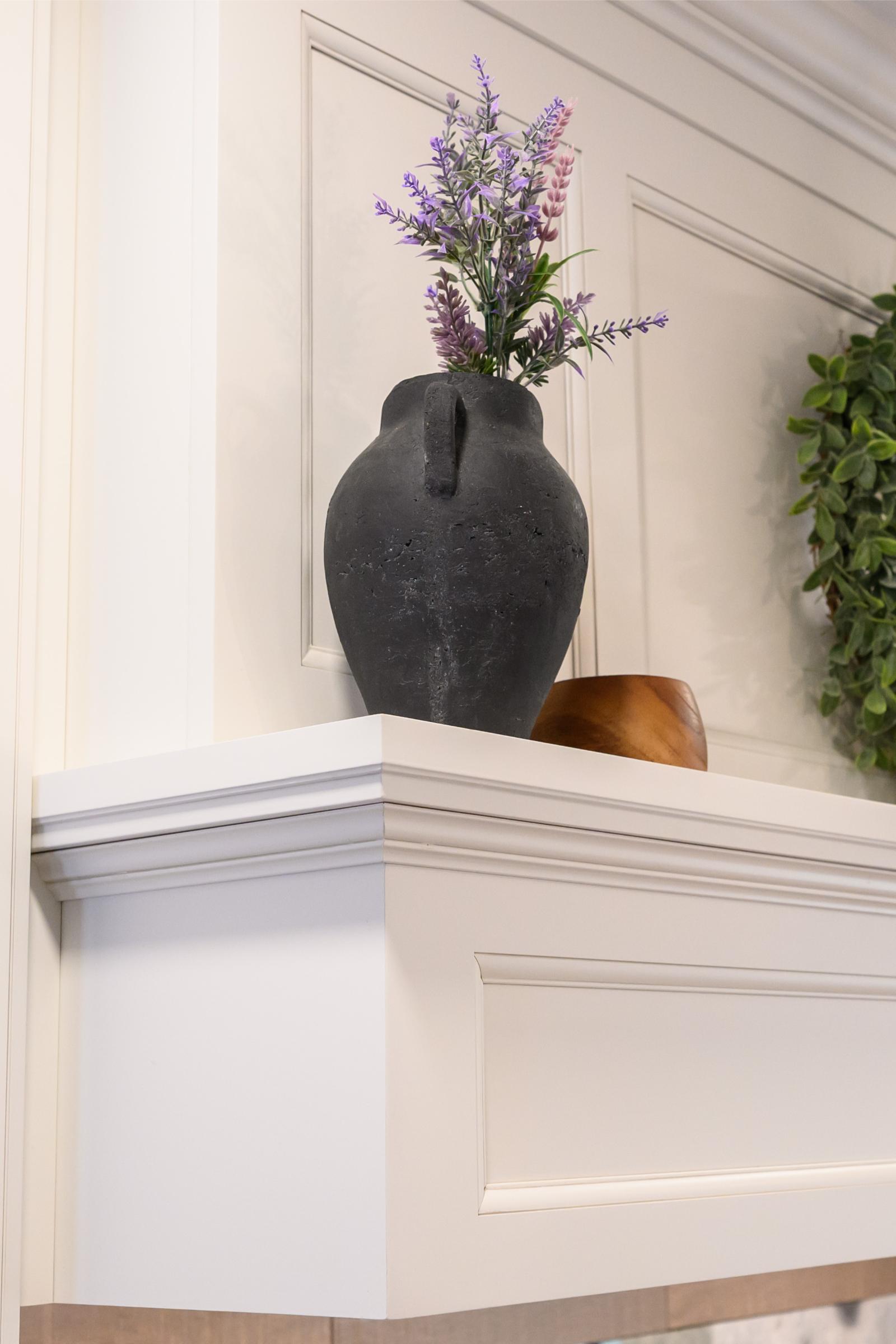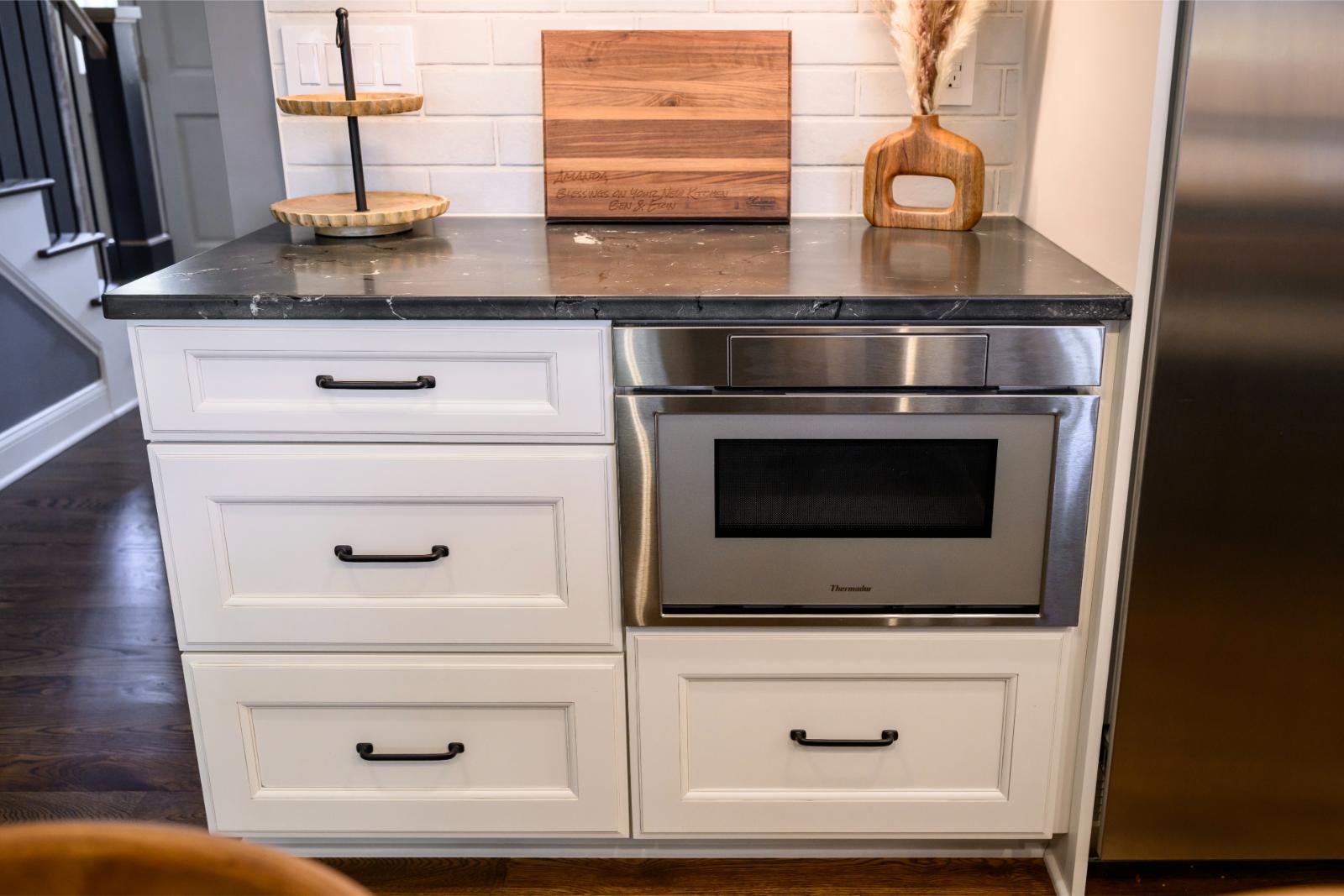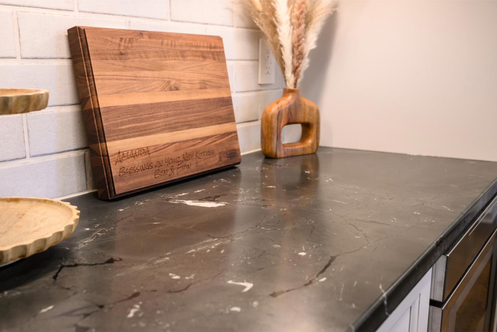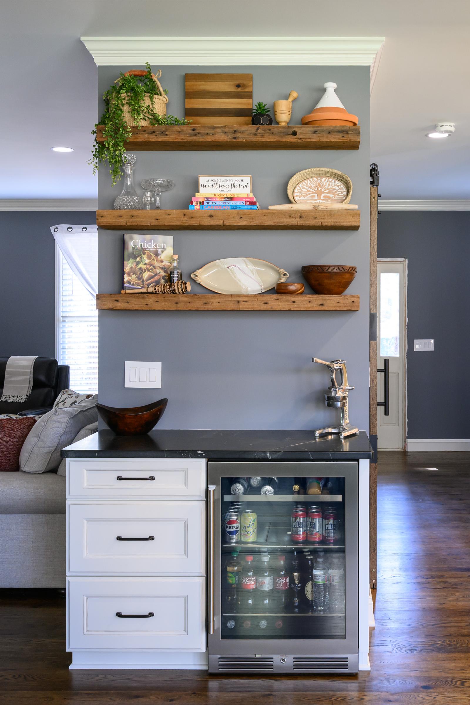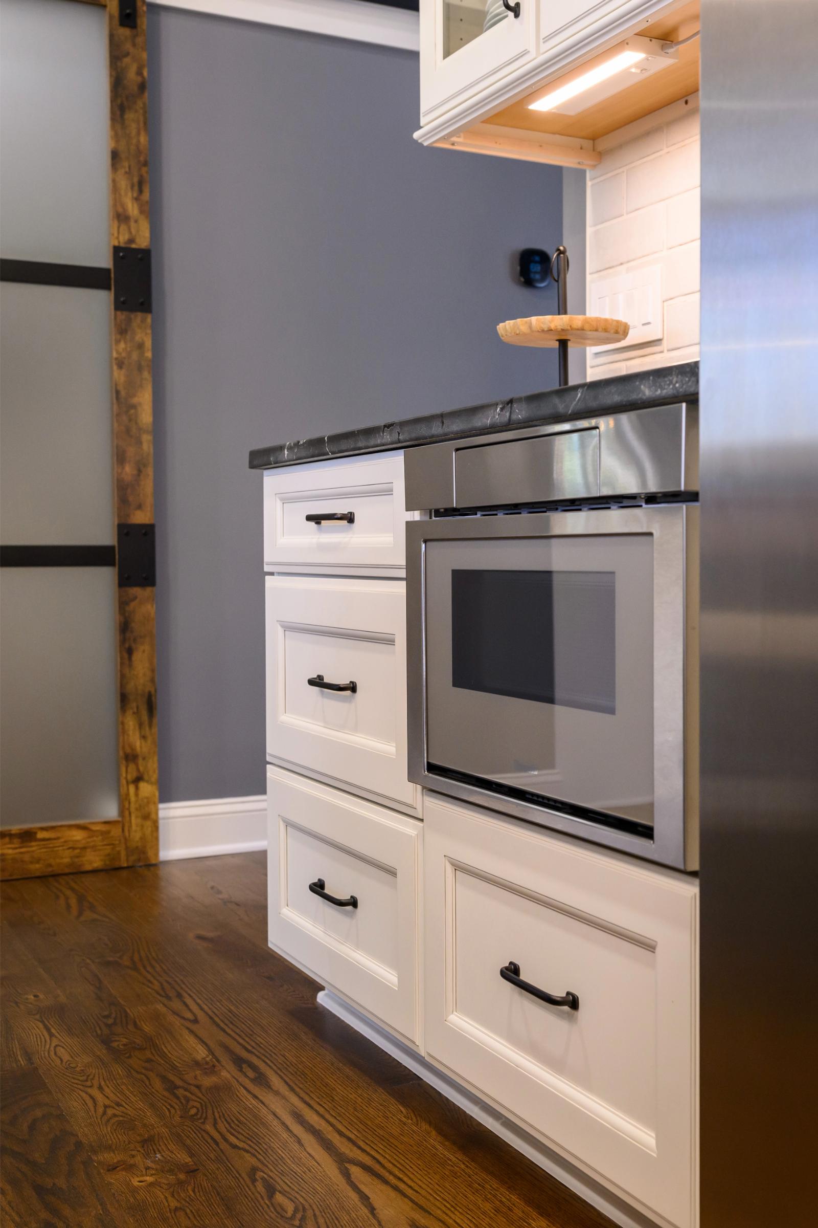 White perimeter cabinets meet a bold blue-gray island in this classic, character-filled kitchen. Warm wood tones, black hardware, and industrial-style pendant lights give the space a grounded, farmhouse feel that's both timeless and lived-in.
