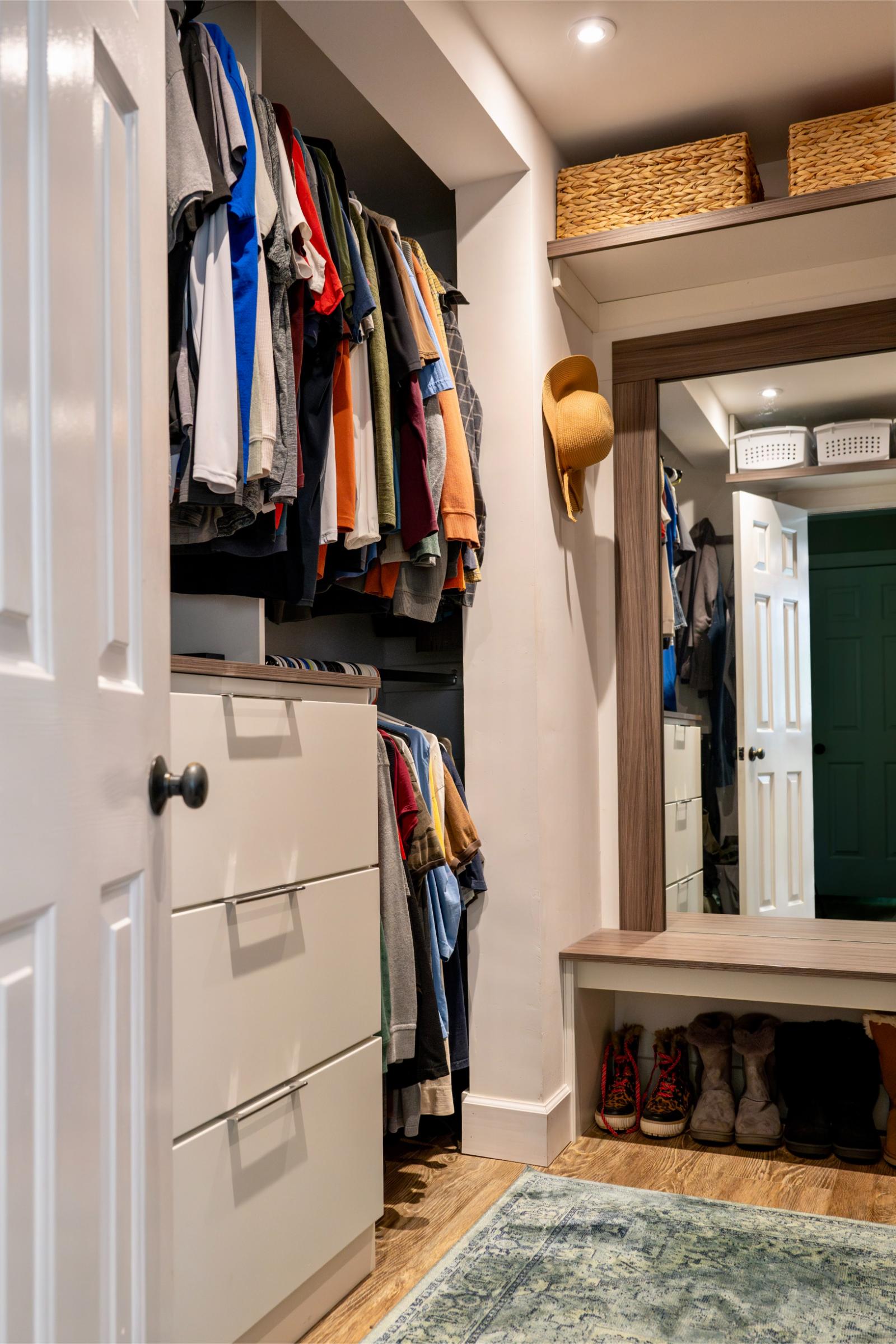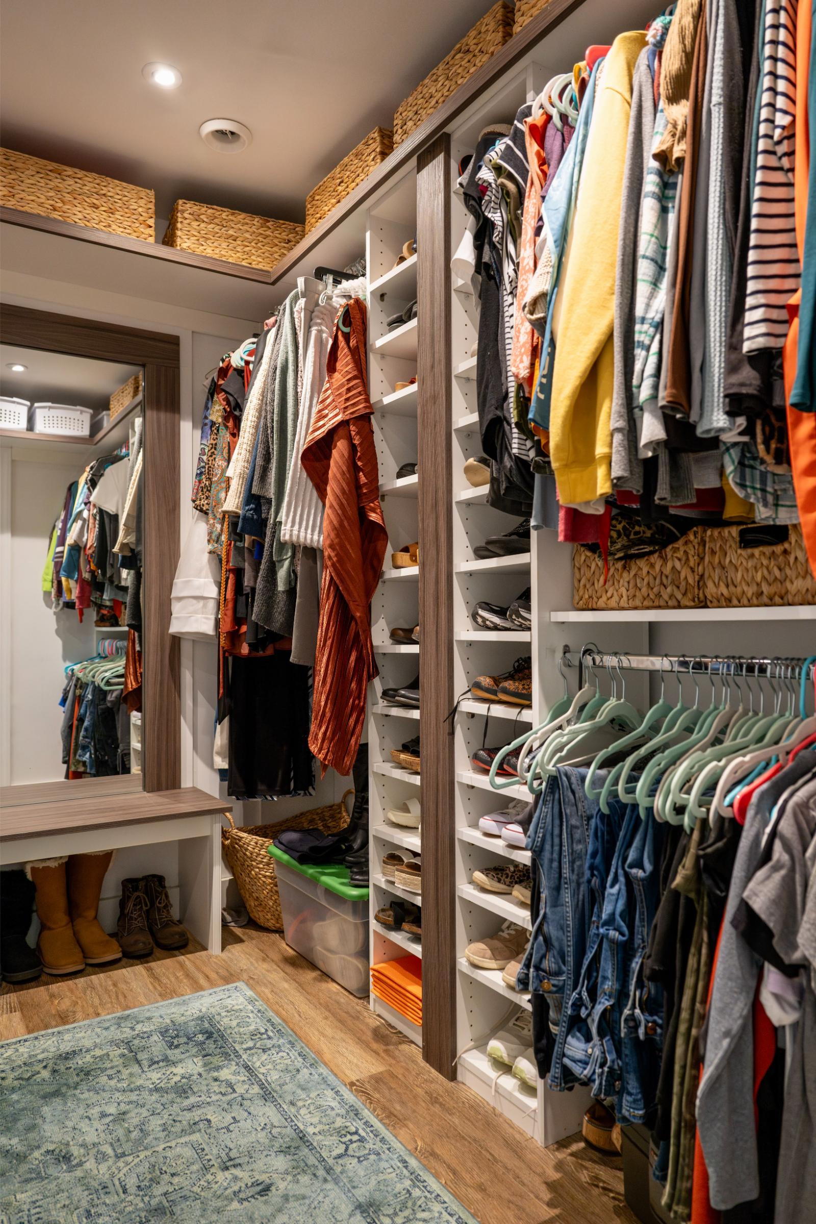 This custom walk-in closet was designed to keep daily routines simple and organized. Built-in shelving, hanging space, and dedicated shoe storage create room for everything, while warm wood tones keep the space feeling comfortable and inviting.
