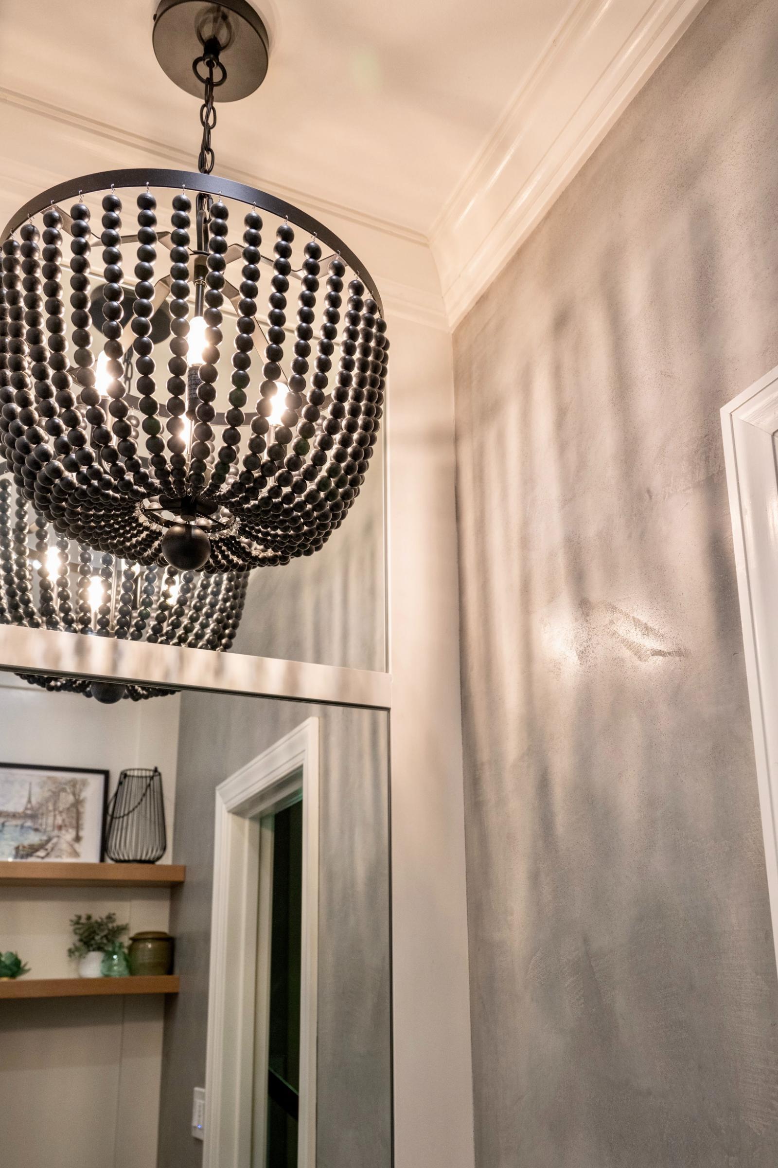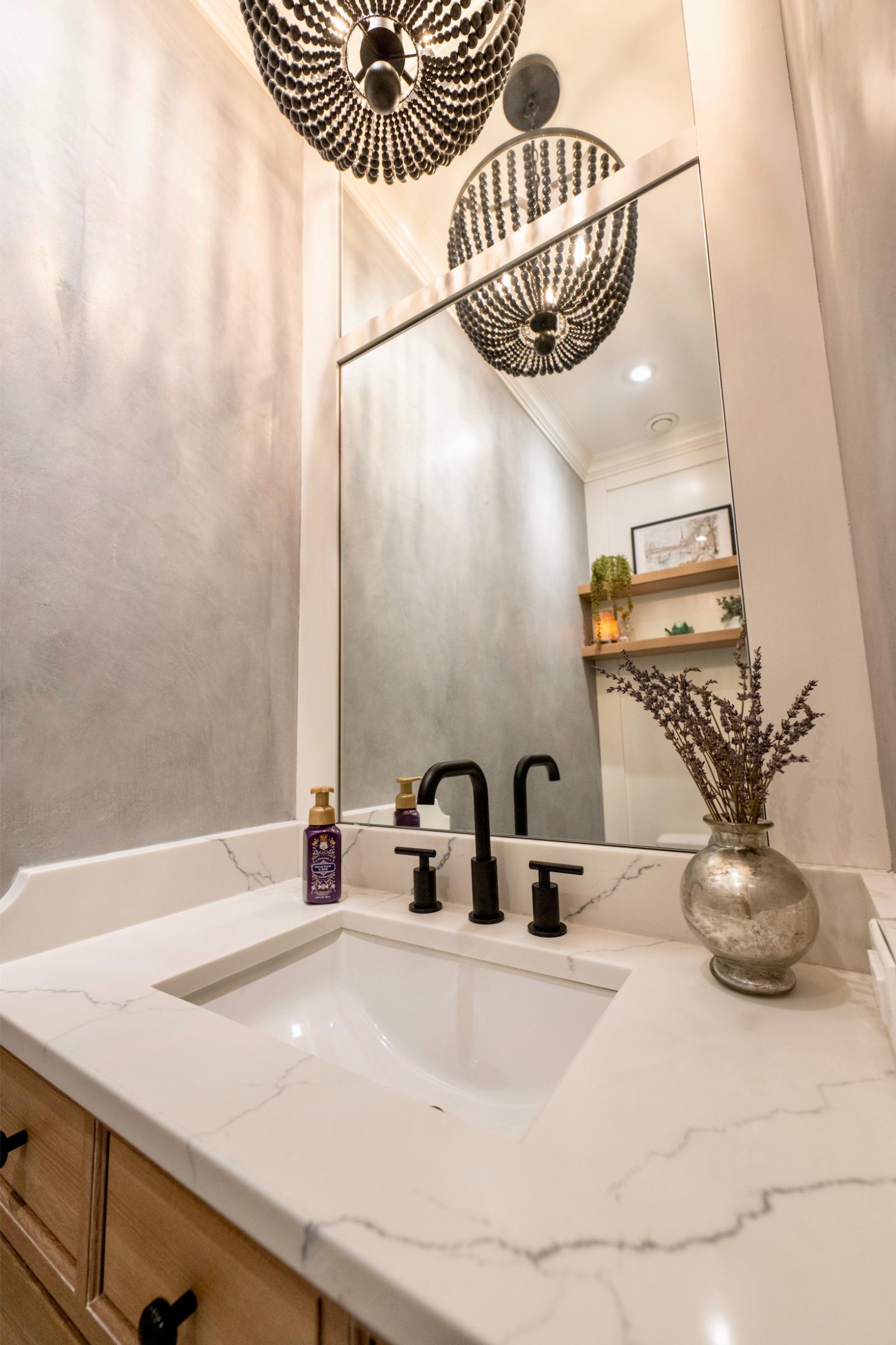 This powder bath is simple, clean, and full of detail. The warm wood vanity adds character, while the white countertop keeps the space bright. Soft gray textured walls and black fixtures give it a modern look without feeling cold.