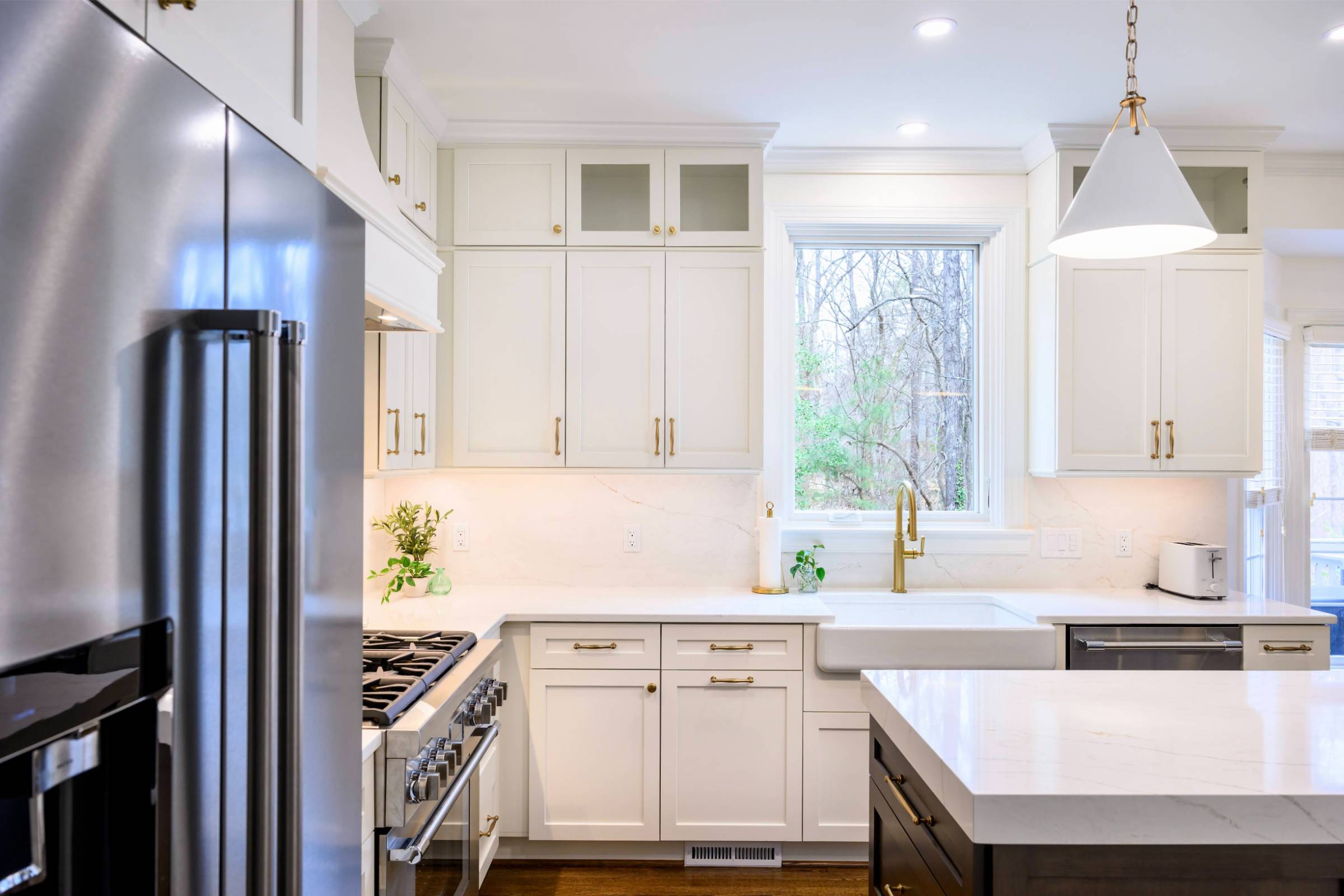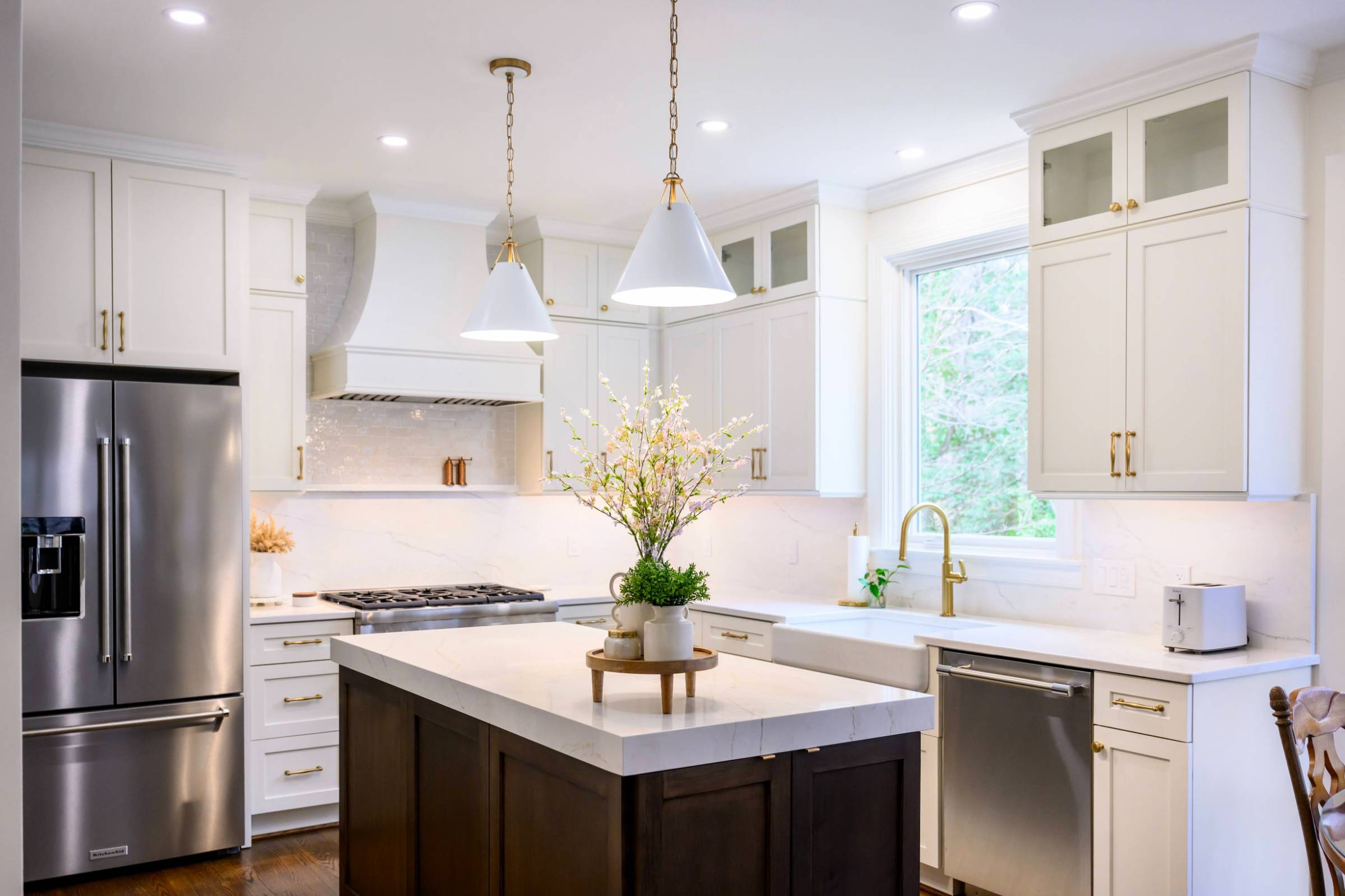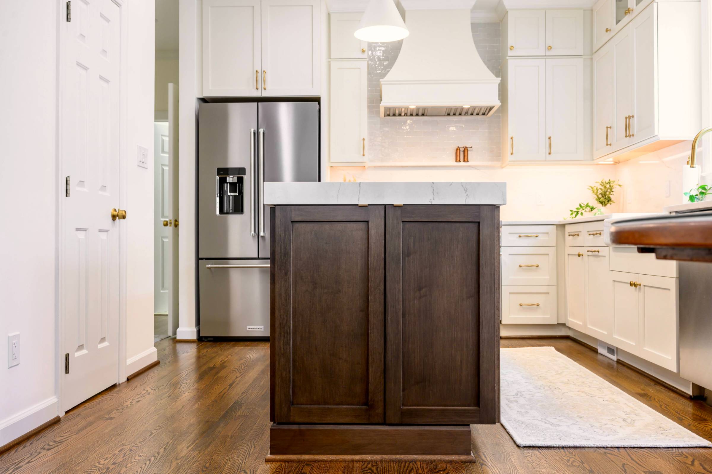 This kitchen transformation is all about warmth meeting brightness. Crisp white cabinets wrap the perimeter while a rich, dark-stained wood island takes center stage — giving the space a beautiful contrast that feels both classic and fresh.