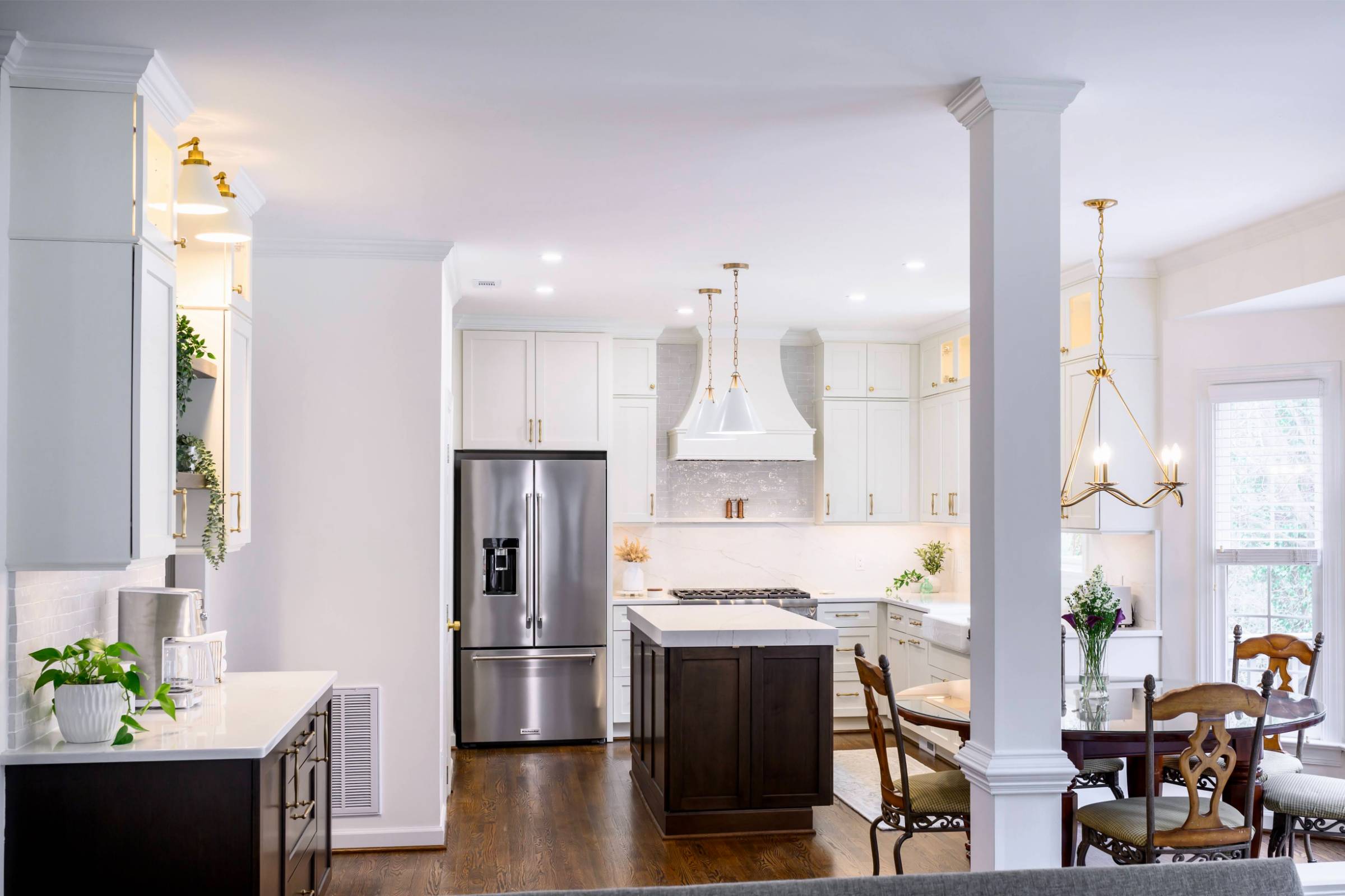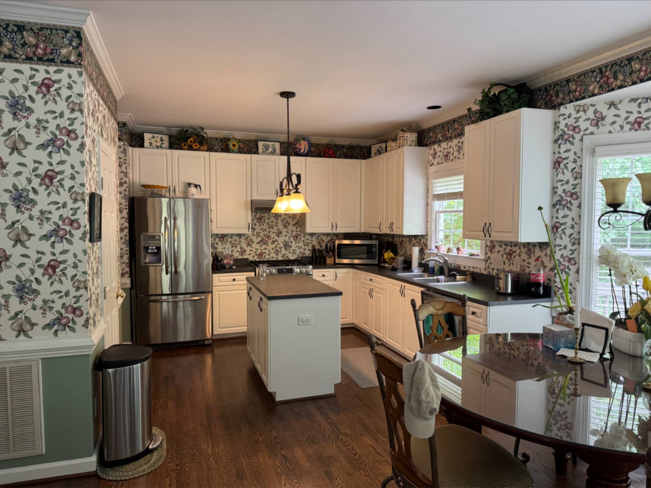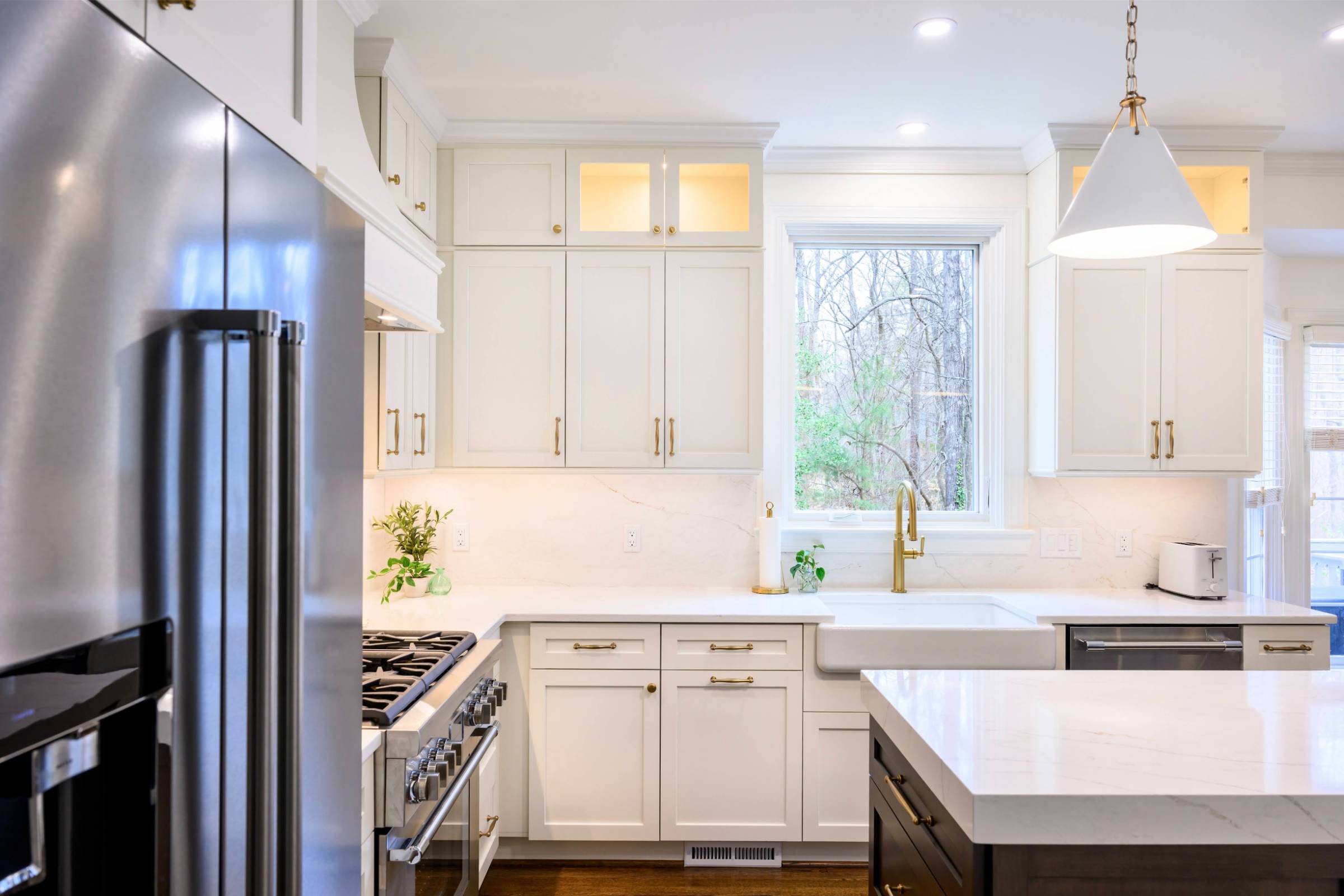 This kitchen transformation is all about warmth meeting brightness. Crisp white cabinets wrap the perimeter while a rich, dark-stained wood island takes center stage — giving the space a beautiful contrast that feels both classic and fresh.
