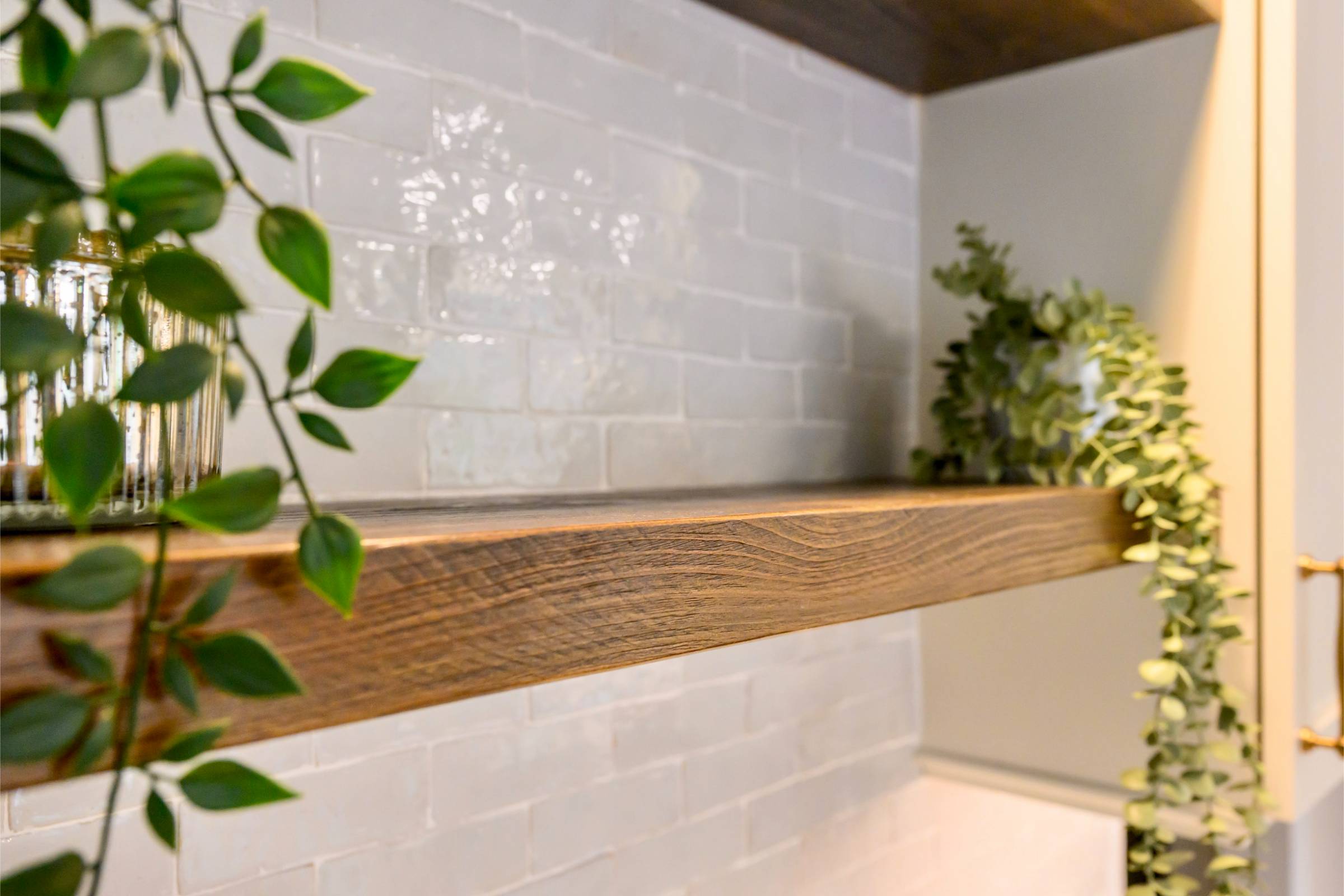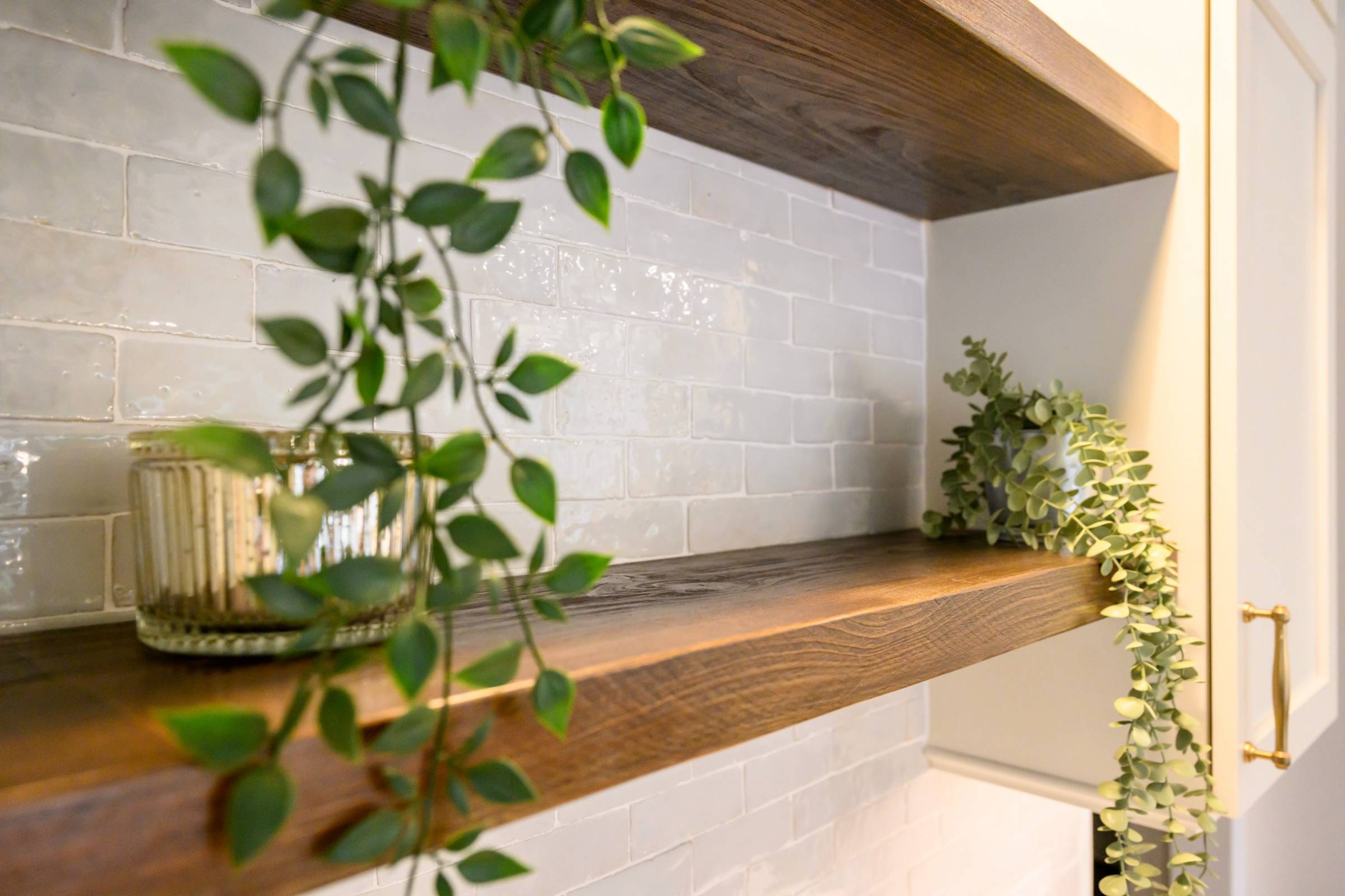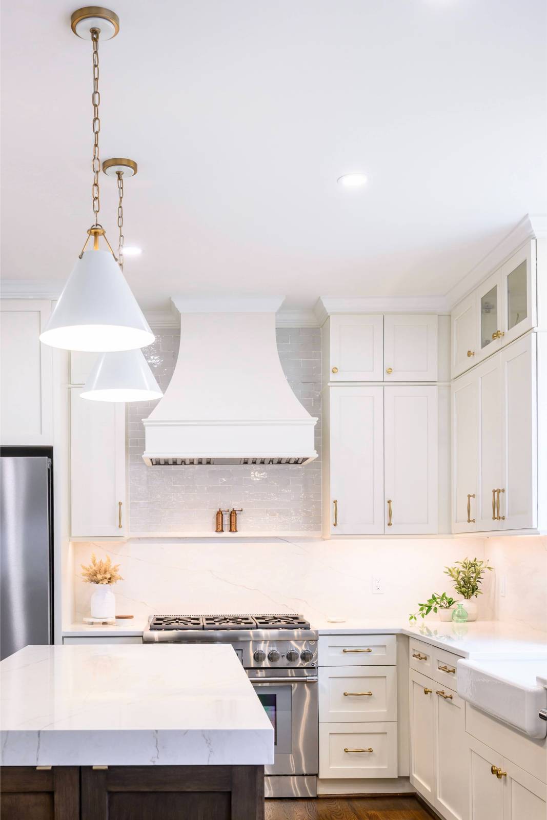 The countertops are a stunning white quartz with soft veining, and the island gets a special thick, mitered edge that makes it look like a piece of fine furniture. The custom wood range hood and matching floating shelves at the coffee bar add a cozy, natural touch that keeps the space from feeling too stark.