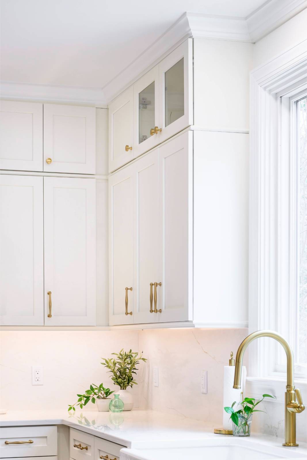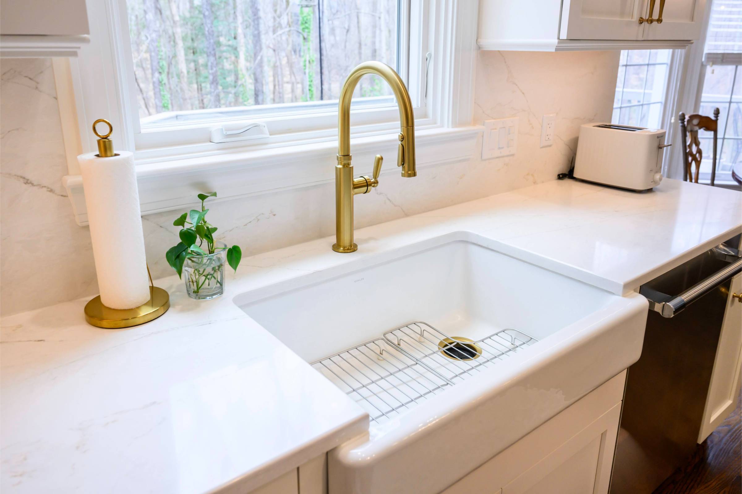 Gold hardware and fixtures are used throughout — from the cabinet pulls to the farmhouse sink faucet — tying everything together with a warm, luxurious feel.