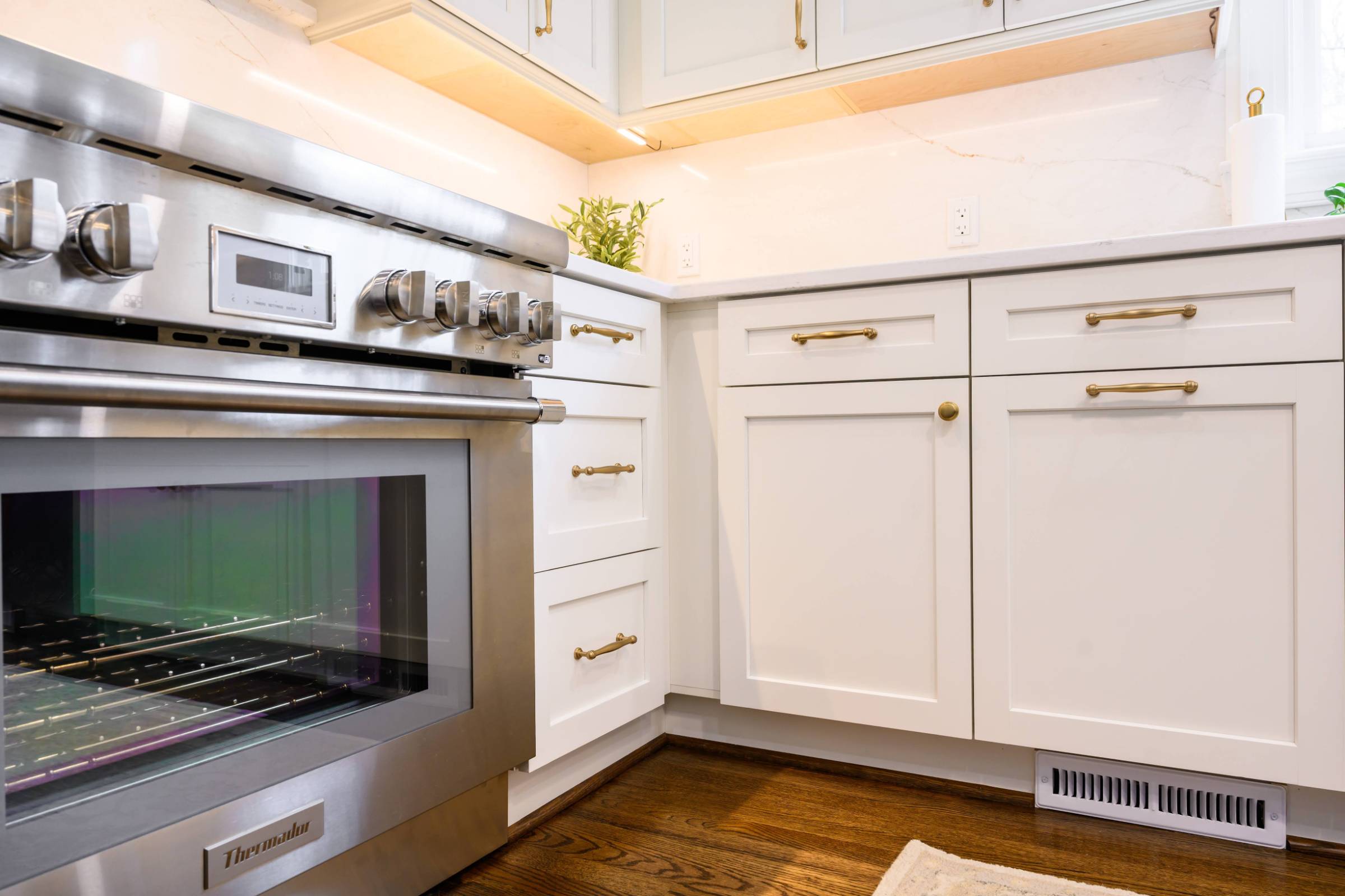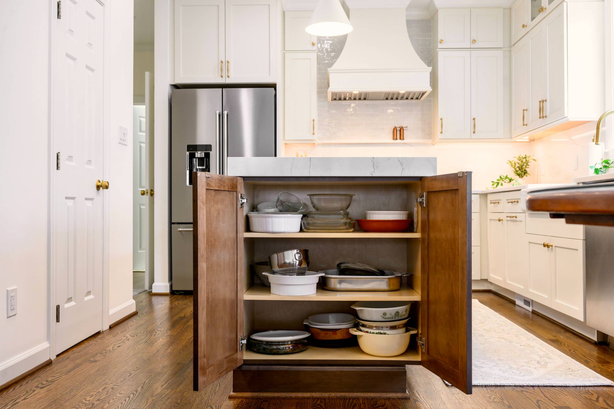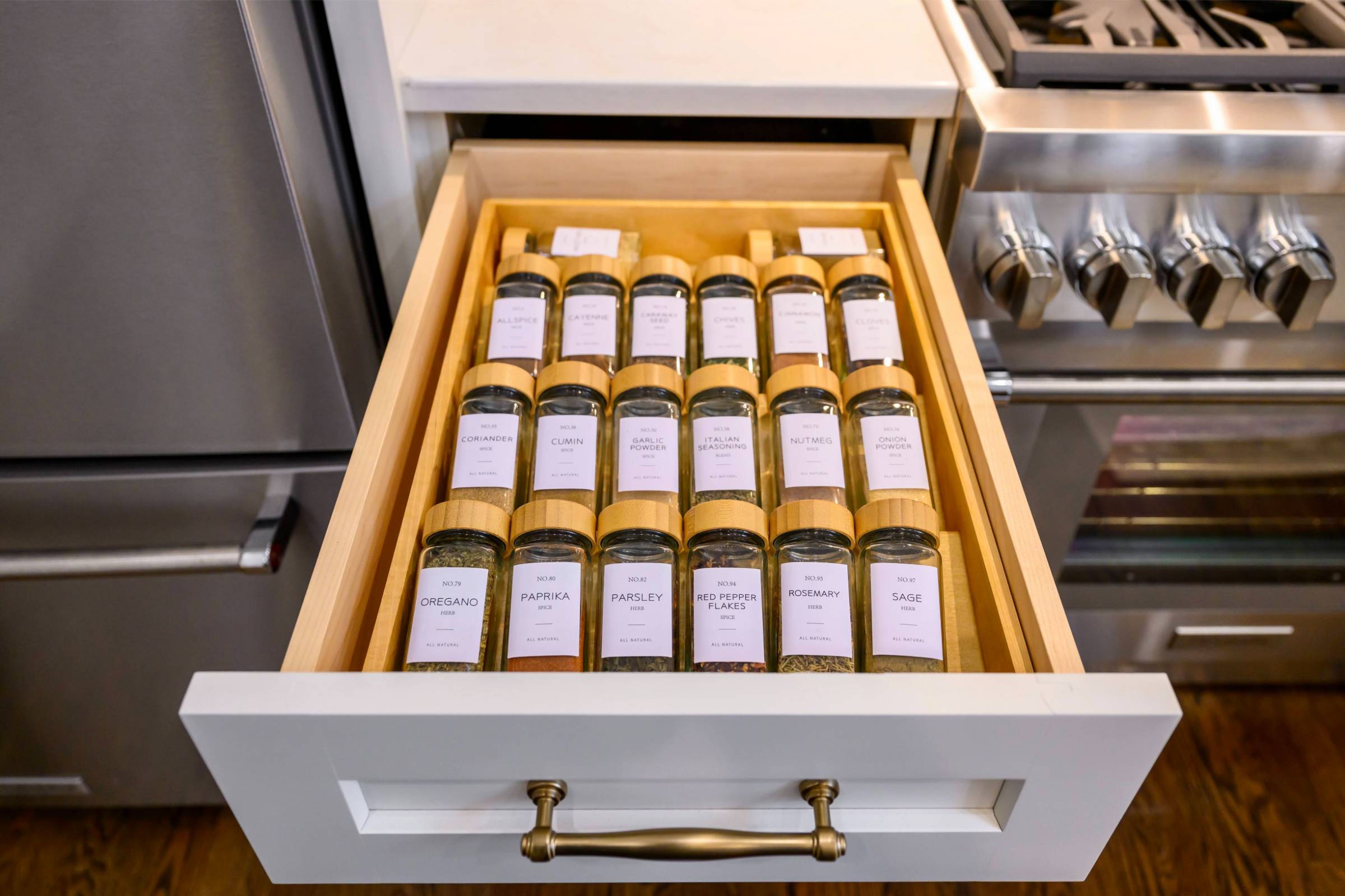 A built-in spice drawer next to the range, pull-out cabinet shelves, and a dedicated coffee bar station mean this kitchen is just as functional as it is beautiful. Everything has its place.