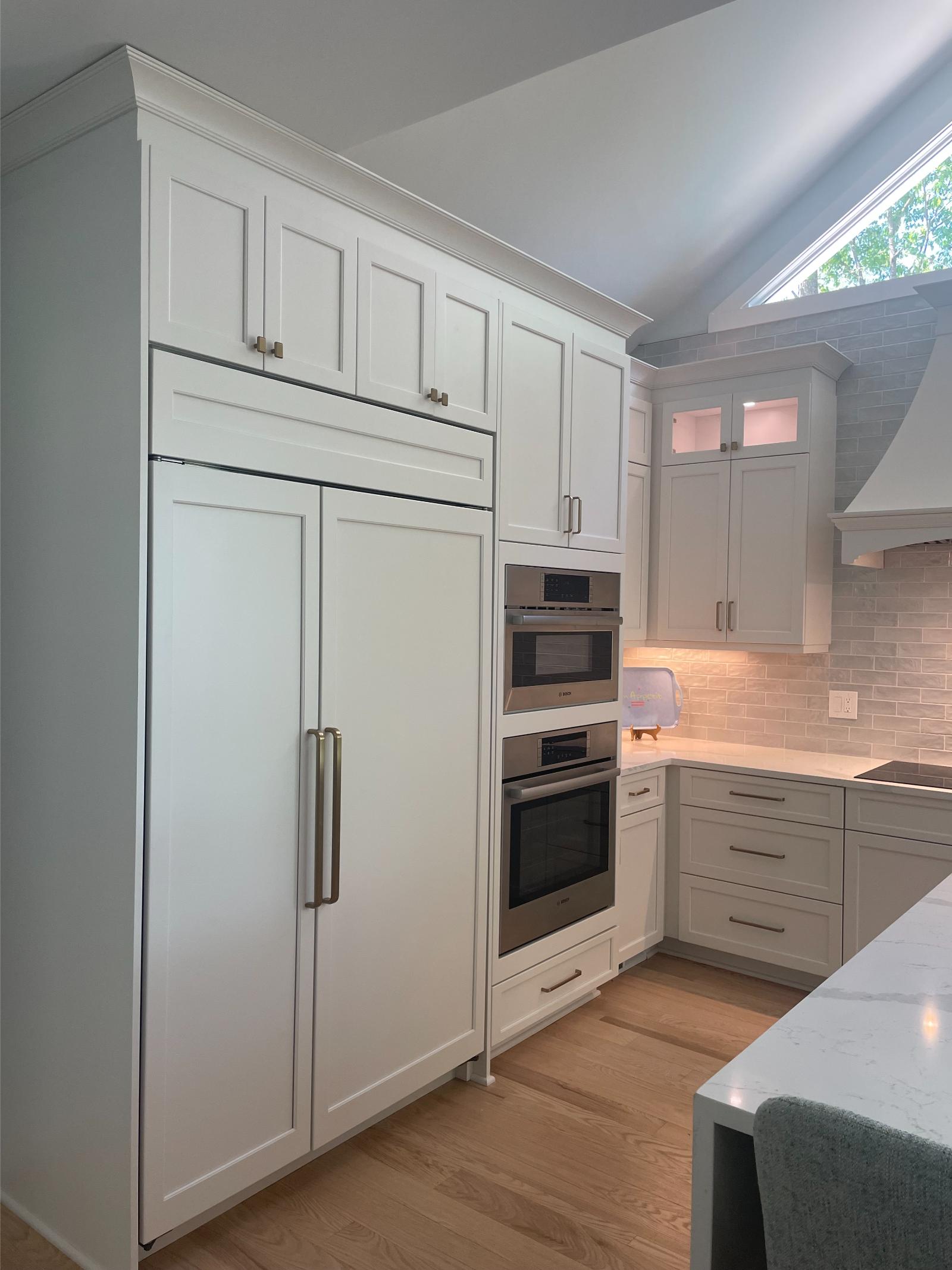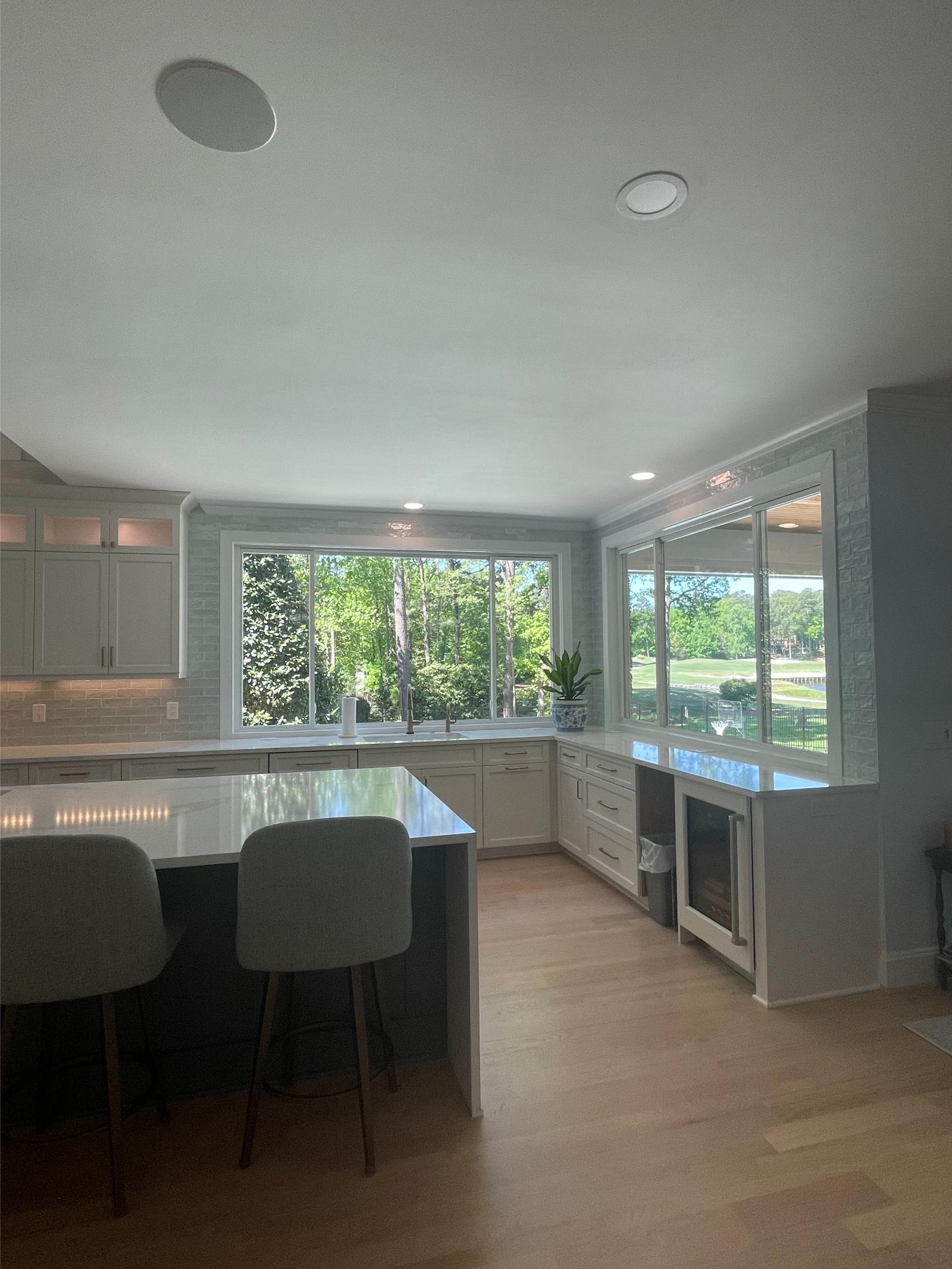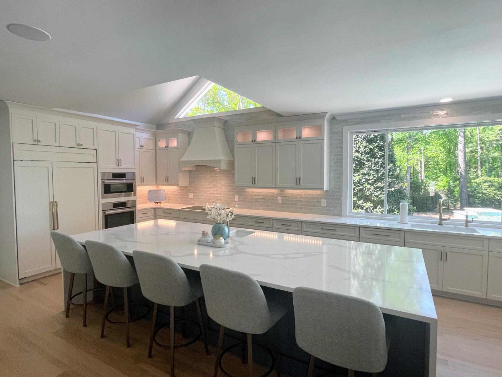 Designed to feel open, calm, and effortlessly refined, this kitchen centers around a generous island that anchors the entire space. Soft, custom cabinetry, layered lighting, and a sculpted hood detail create a timeless backdrop, while natural light pours in through oversized windows and a skylight above.