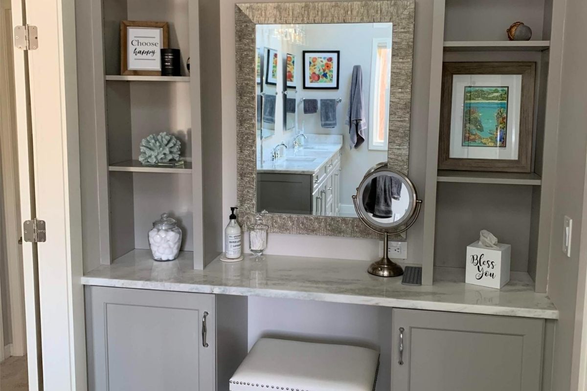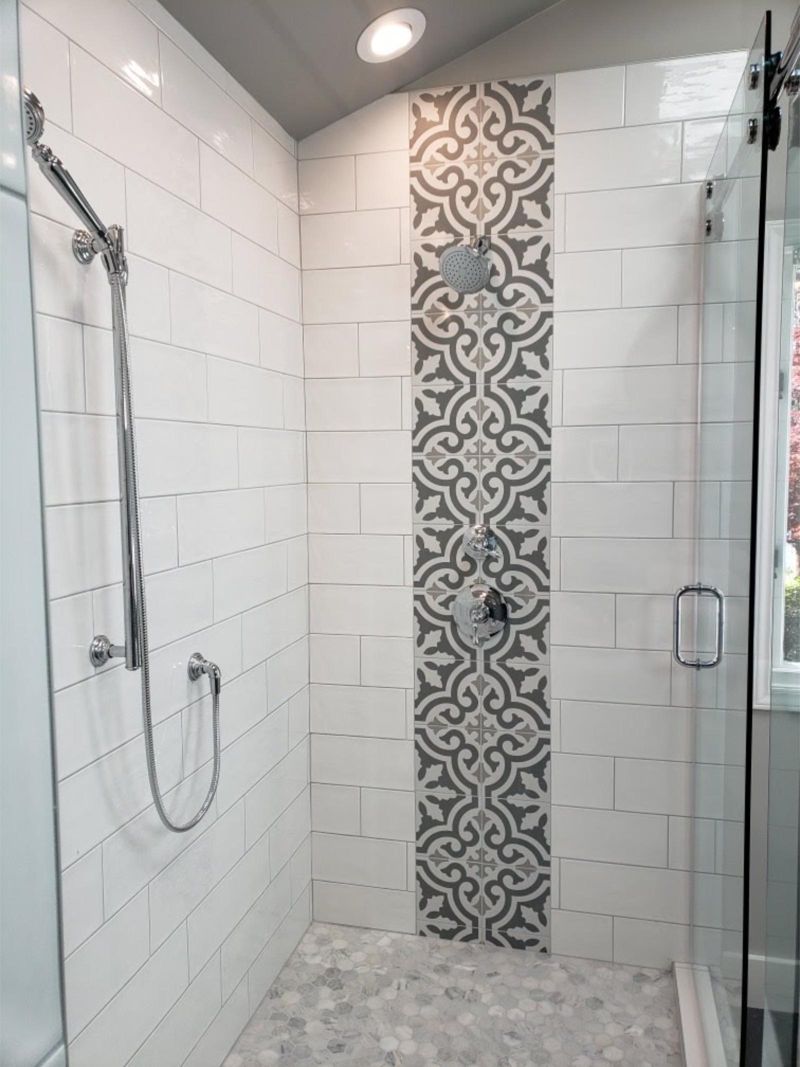 This bathroom was designed to feel calm, not trendy. Subtle pattern. Soft tones. Custom storage where it actually matters.