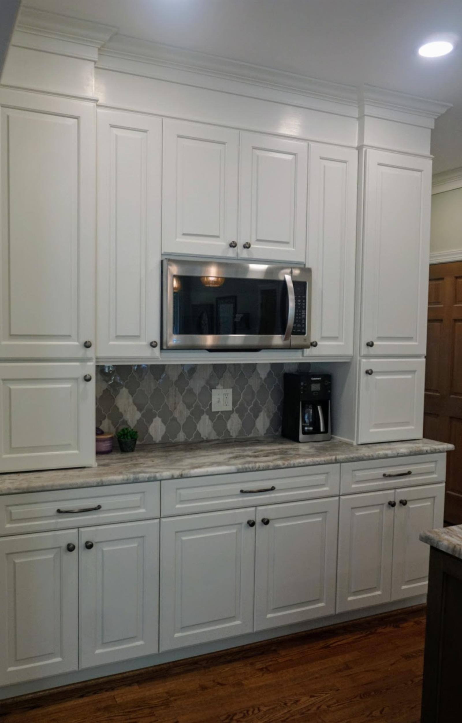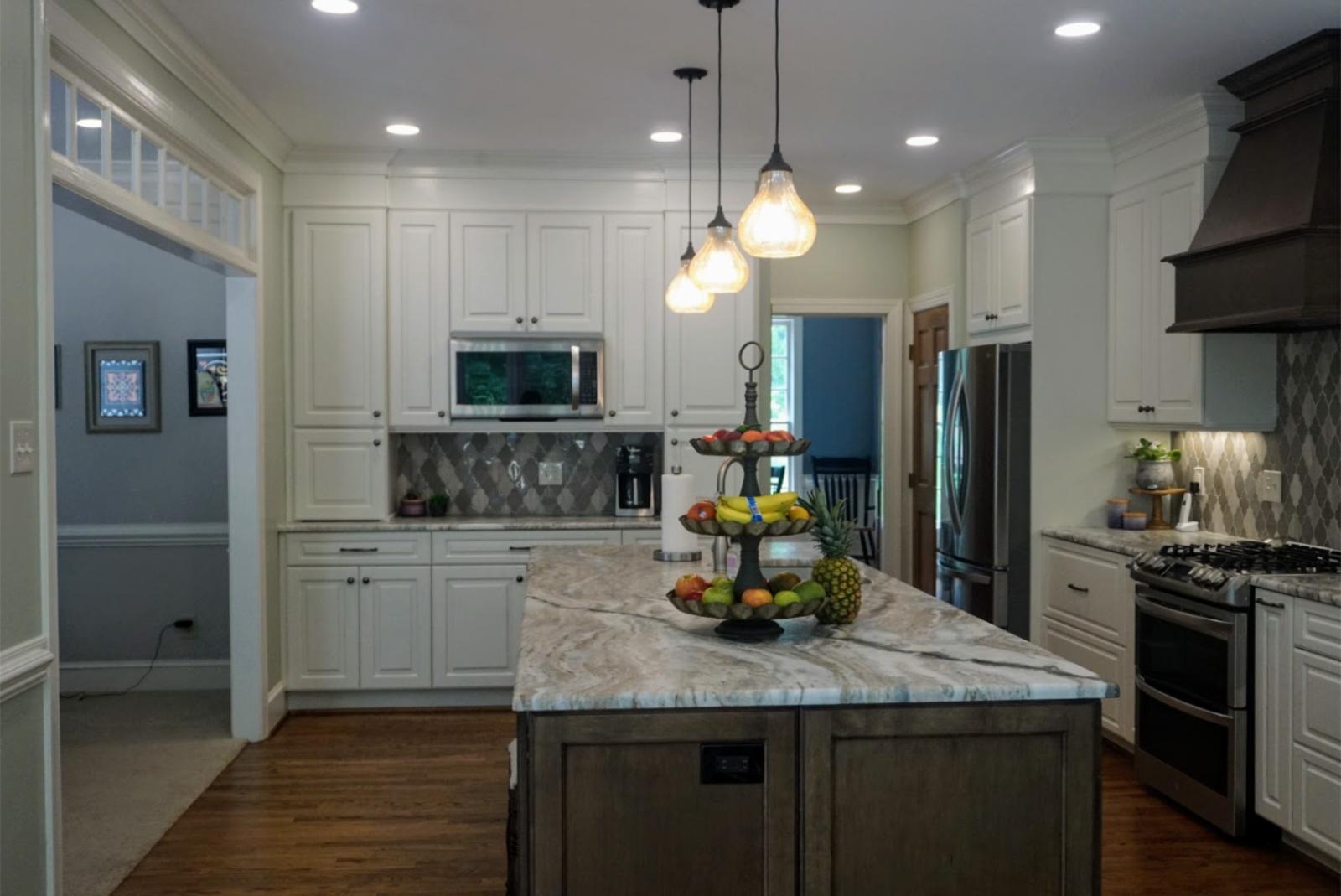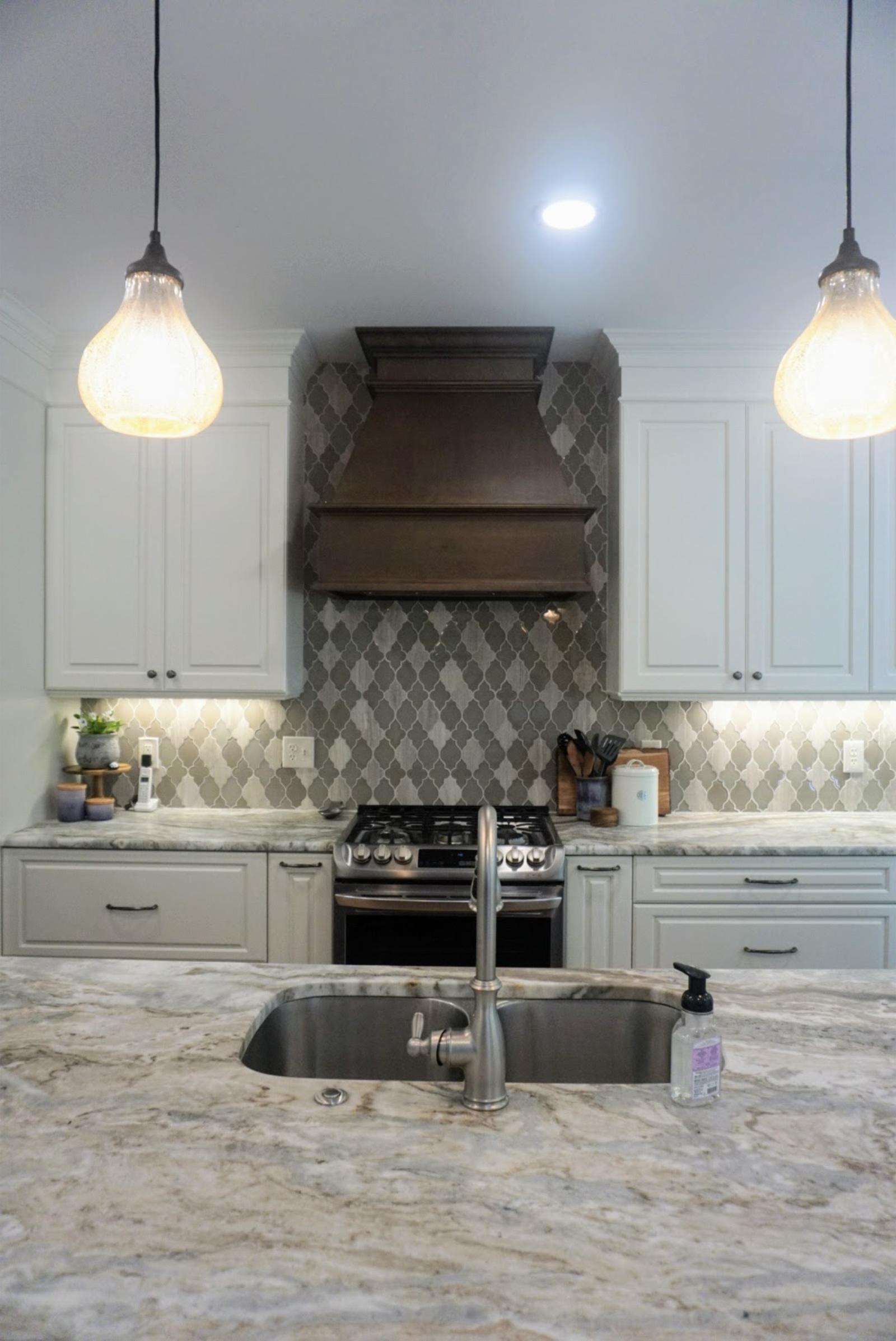 This kitchen blends clean white cabinetry with a warm wood island for a timeless, welcoming feel. A large island creates space for seating and everyday use, while custom details like the wood hood and patterned backsplash add character without overpowering the room. Designed to be both beautiful and practical for daily living.